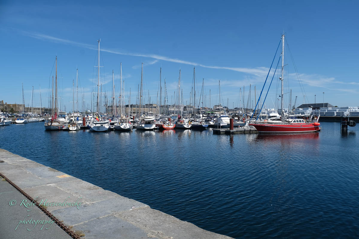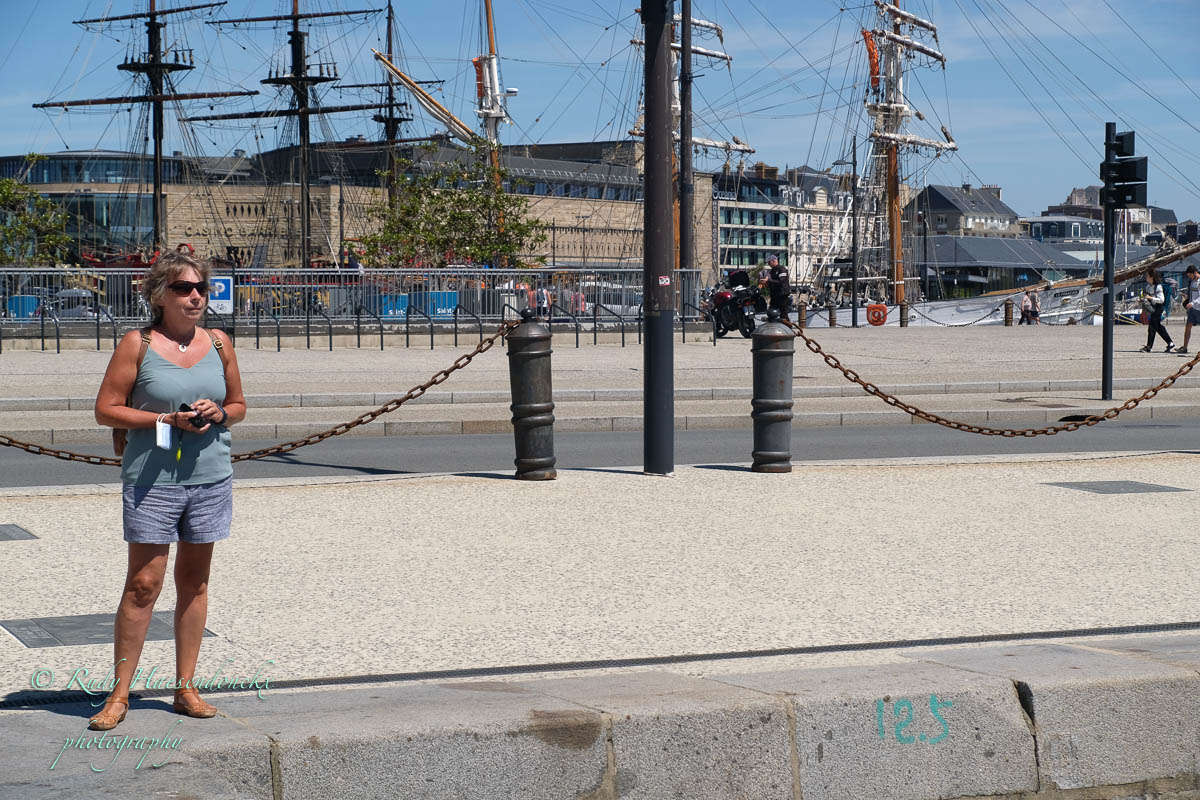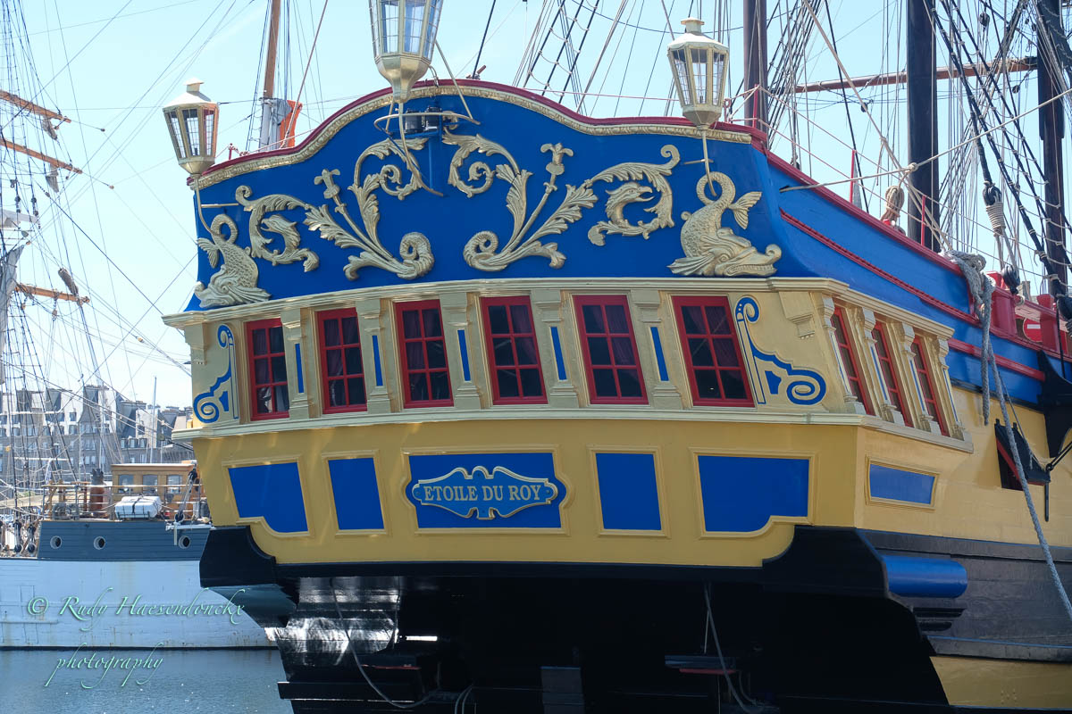 Het eerste dat we zien als we uit de parkeergarage tevoorschijn klimmen ( de lift defect, dus moesten we te voet naar boven … ) is een groot plein net buiten de omwalling ( Le Intramurs ) Hier is ook het haventje van St Malo, en daar liggen redelijk wat bootjes voor anker, zeker geen piratenbootjes, maar wel allemaal plezierboten en jachten, het ene al wat groter en luxueuzer dan het andere uiteraard. Hier liggen ook 2 meer historische schepen, waaronder de Etoile du Roy een indrukwekkend fregat Corsaire (het op twee na grootste zeilend oorlogsschip van Frankrijk). Met 20 kanonnen en 790 m² aan oppervlakte is dit schip een boegbeeld zoals je alleen in stripboeken zou tegenkomen, indrukwekkend en in heel mooie staat bewaard gebleven.