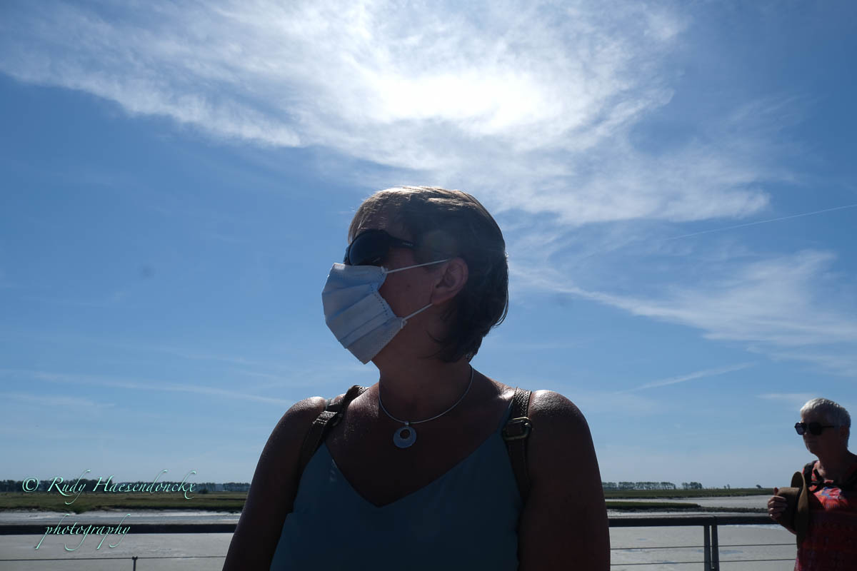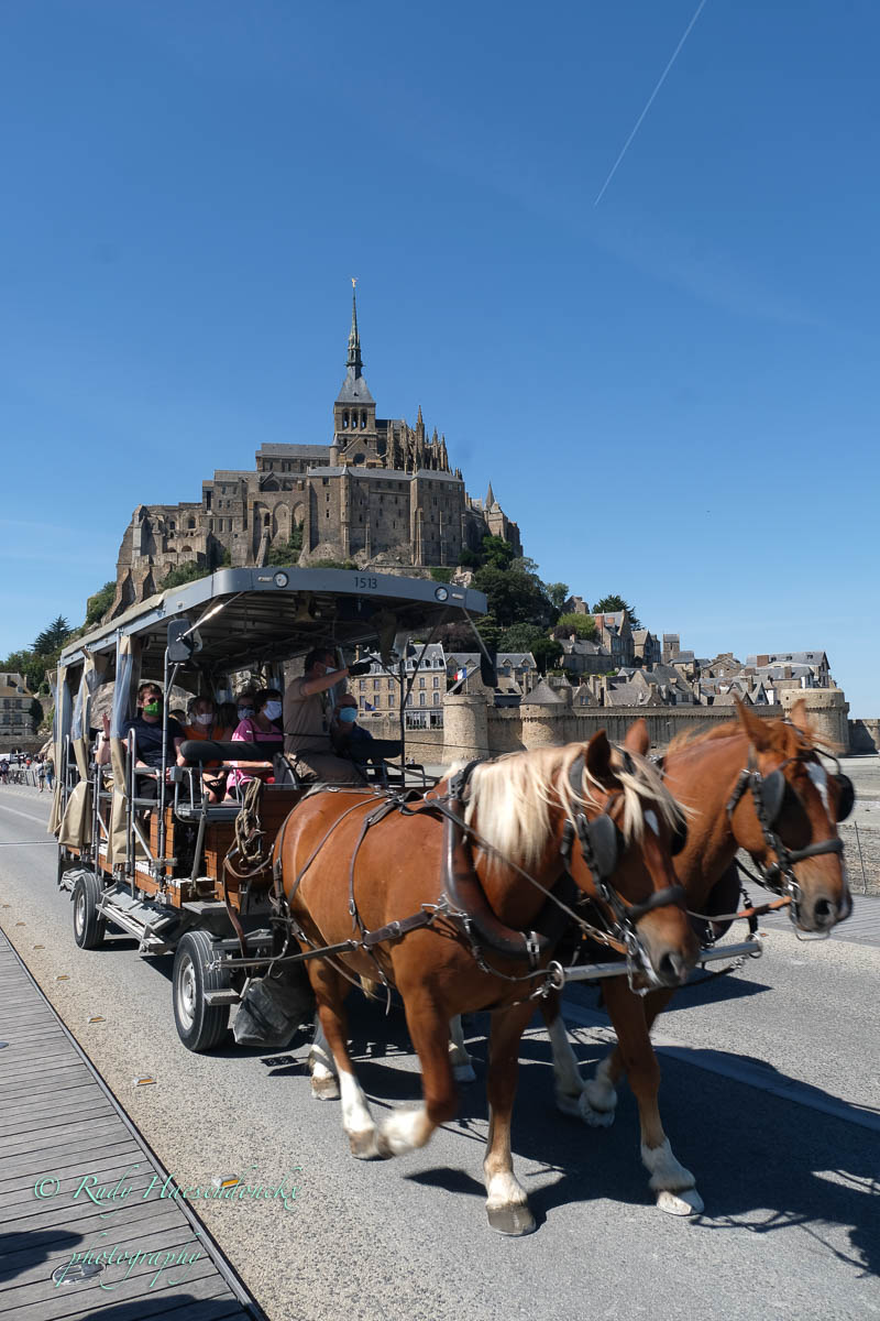 We trekken hierna verder richting de beroemde Mont St Michel, toch ook weer een 30-tal kilometers verder. Daar wordt je direct naar de immens grote parkings afgeleid, vanwaar je dan te voet, per fiets of met de gratis busjes ( de navettes ) naar de mytische Mont St Michel zelf kan gaan. We kiezen voor de navettes wegens een kwetsuur aan de kuit, en daar wordt toch wel behoorlijk wat volk ingeladen … gelukkig wel allemaal met mondmasker, maar toch …