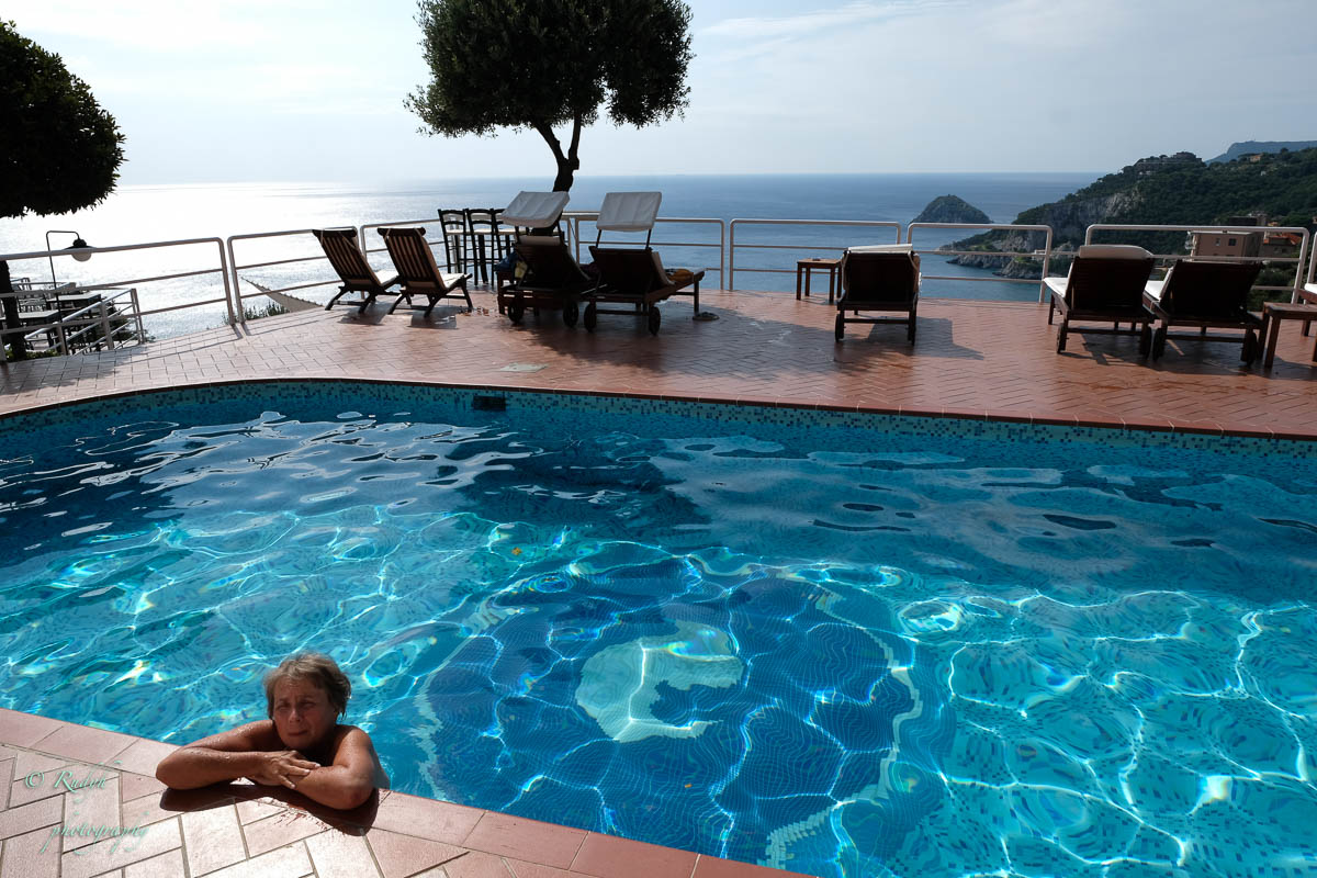 We doen vandaag eigenlijk een copy/paste van gisteren 🙂 Ook nu weer zeer rustig aan het zwembad, we genieten ervan. Verschil deze keer is dat we nu aan het zwembad gaan eten s avonds, er is in ons hotel ook een mini-restaurantje aan het zwembad, de ‘Poolbar’ De gerechten zijn beperkt, maar da s niet erg. Het is best lekker, maar gezien het ‘echte’ restaurant hier een MIchelinster heeft, is dit wel heel ‘bruut’ geserveerd. Nog nooit zo een smakeloos gepresenteerde Salade Caprese gezien … Maar qua smaak dus wel OK, en ook hier een prachtig uitzicht op de zee, dat heeft ook wel iets natuurlijk 🙂