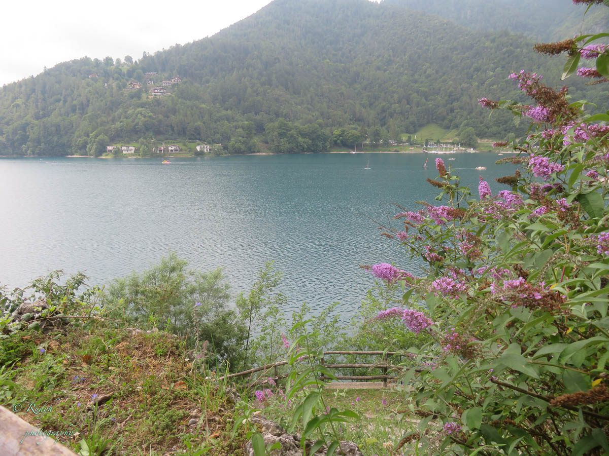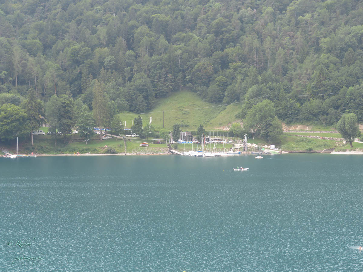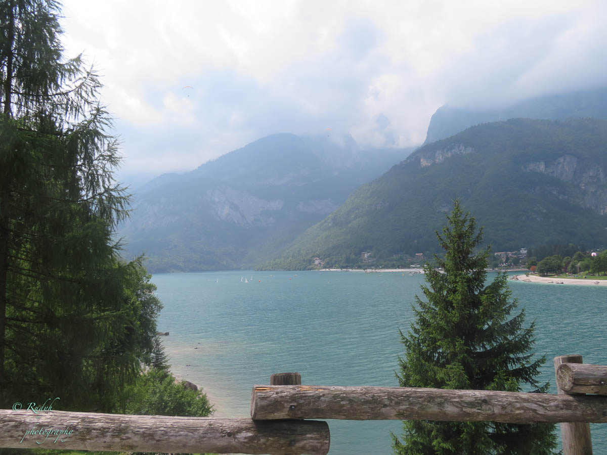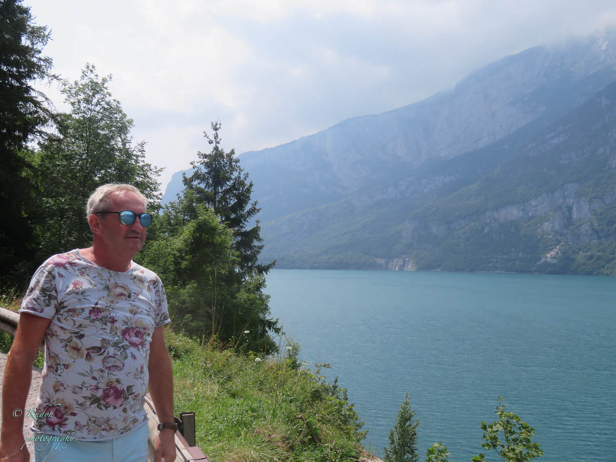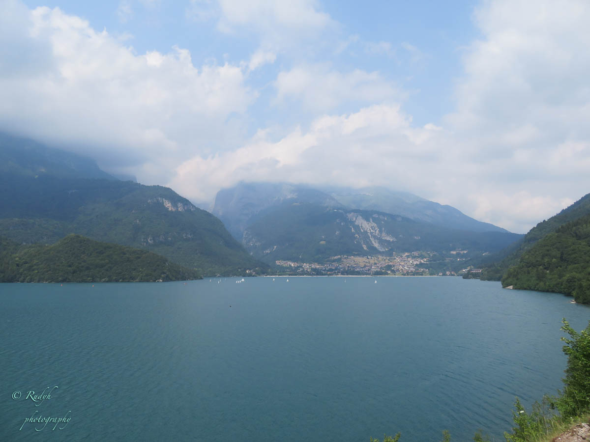 Na het leuke intermezzo aan Lago di Tenno, is het weer tijd om verder te rijden. Volgende stop wordt Lago di Molveno, dat ligt eigenlijk een eindje buiten de toer die we hadden gepland, maar wordt evengoed omschreven als een prachtig bergmeer, dus maken we maar een omweggetje. Daar aangekomen blijkt het er een vrij ‘mondain’ gebeuren te zijn, er zijn héél veel kleine zeilbootjes op het meer, windsurfers en ook para-penters in de lucht … alles bij elkaar een kleurrijk schouwspel, en het stadje Molveno zelf bruist van de vele bezoekers. Eigenlijk een beetje raar, want de rit ernaartoe was bijna uitgestorven … buiten een heel aantal motorrijders die de bochtige weggetjes wel kunnen smaken, is er eigenlijk op dit stuk niet veel te beleven. Weliswaar een hele mooie natuur alweer, maar verder enkel een paar slaperige dorpjes, zonder al te veel beweging. Dat is dus wel heel anders in Molveno, het stadje dat zijn naam aan dit mooie bergmeer gaf. Het is duidelijk een beetje een hotspot, grote nieuwe hotels, en veel horeca, voor zover we kunnen zien, is het ook in de winter een drukbezochte bestemming. Mooi wel, maar om hier in de winter naartoe te rijden …