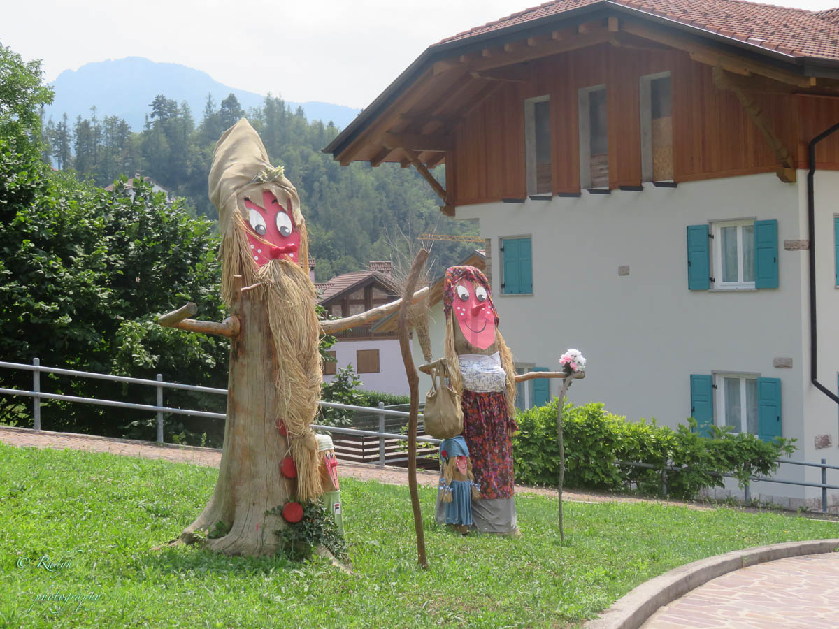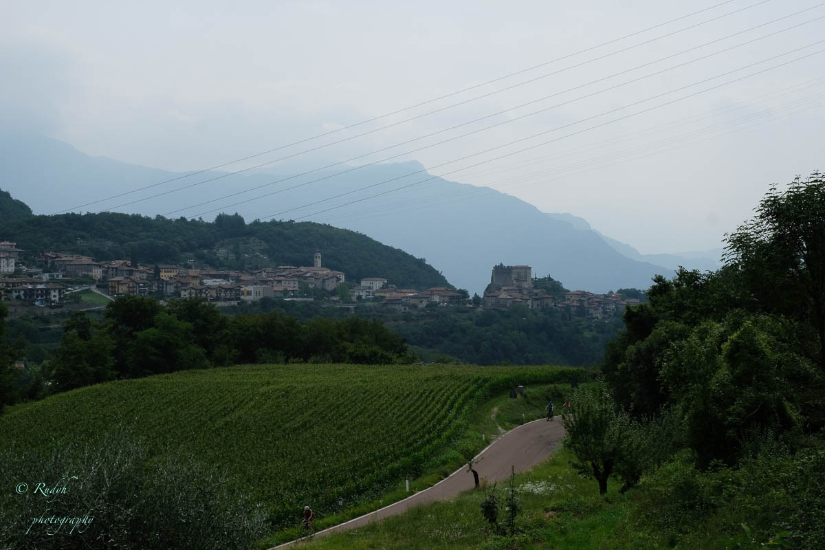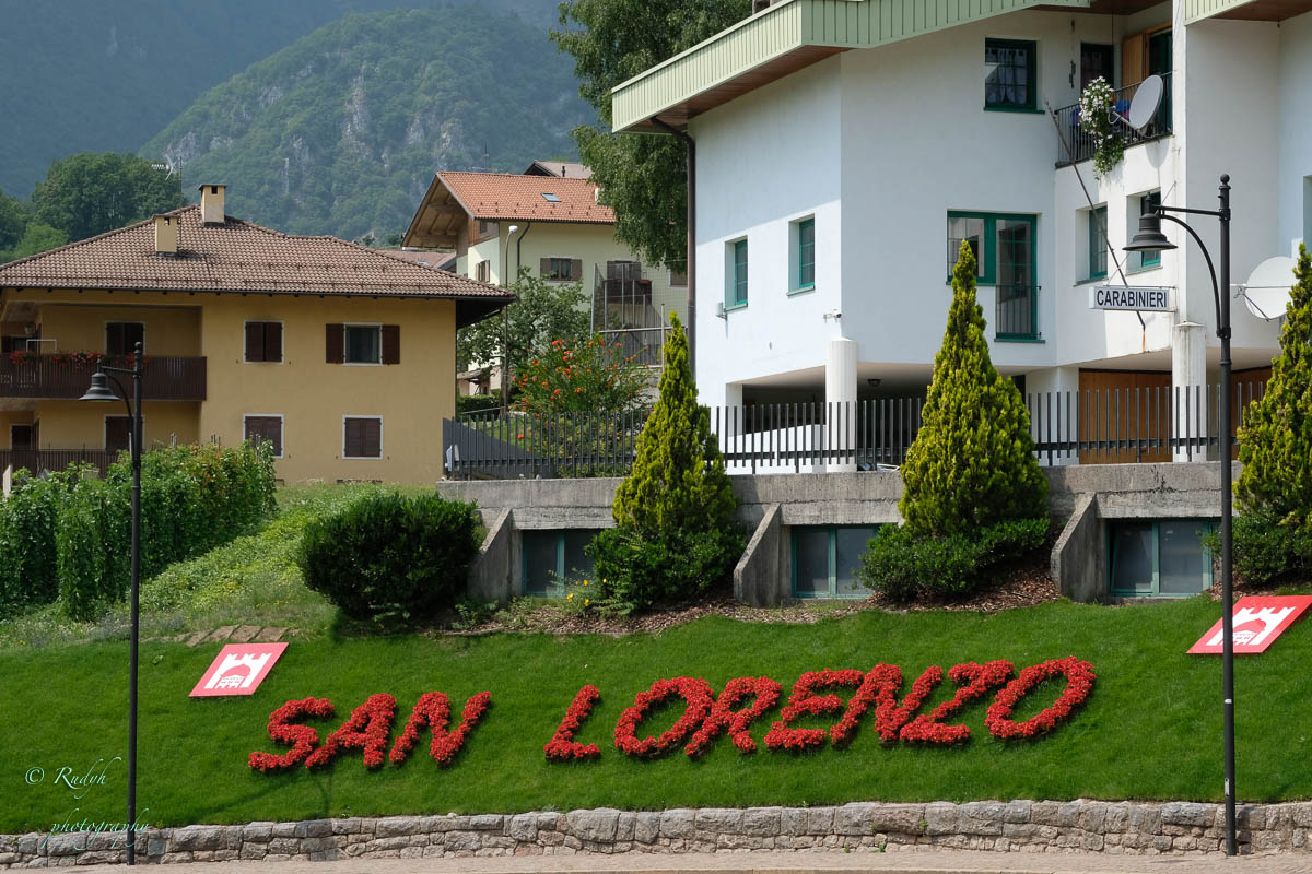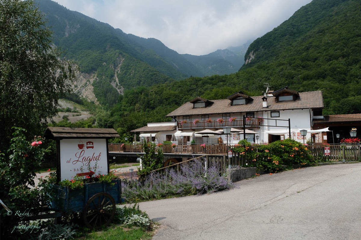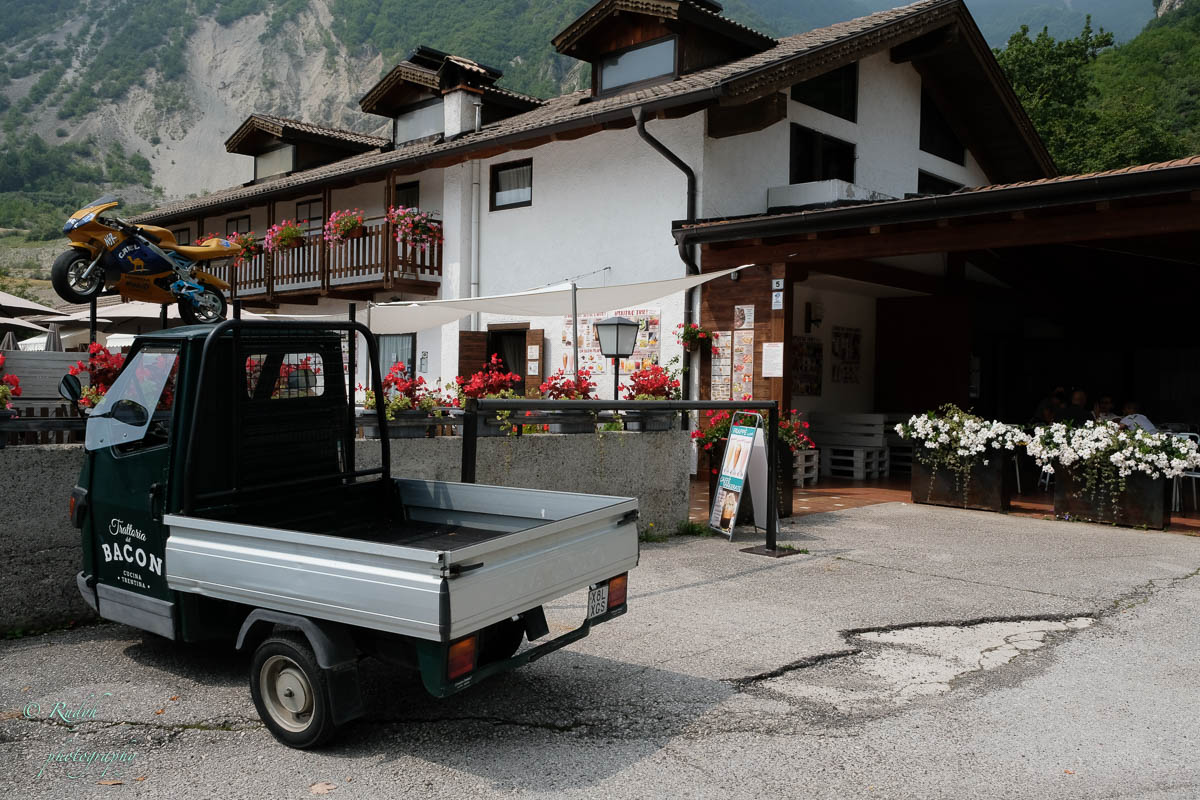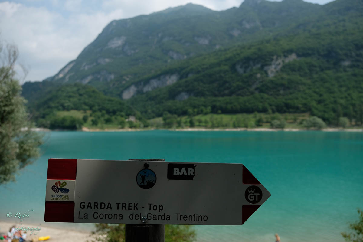Na het leuke intermezzo aan Lago di Tenno, is het weer tijd om verder te rijden. Volgende stop wordt Lago di Molveno, dat ligt eigenlijk een eindje buiten de toer die we hadden gepland, maar wordt evengoed omschreven als een prachtig bergmeer, dus maken we maar een omweggetje. Daar aangekomen blijkt het er een vrij ‘mondain’ gebeuren te zijn, er zijn héél veel kleine zeilbootjes op het meer, windsurfers en ook para-penters in de lucht … alles bij elkaar een kleurrijk schouwspel, en het stadje Molveno zelf bruist van de vele bezoekers. Eigenlijk een beetje raar, want de rit ernaartoe was bijna uitgestorven … buiten een heel aantal motorrijders die de bochtige weggetjes wel kunnen smaken, is er eigenlijk op dit stuk niet veel te beleven. Weliswaar een hele mooie natuur alweer, maar verder enkel een paar slaperige dorpjes, zonder al te veel beweging. Dat is dus wel heel anders in Molveno, het stadje dat zijn naam aan dit mooie bergmeer gaf. Het is duidelijk een beetje een hotspot, grote nieuwe hotels, en veel horeca, voor zover we kunnen zien, is het ook in de winter een drukbezochte bestemming. Mooi wel, maar om hier in de winter naartoe te rijden …