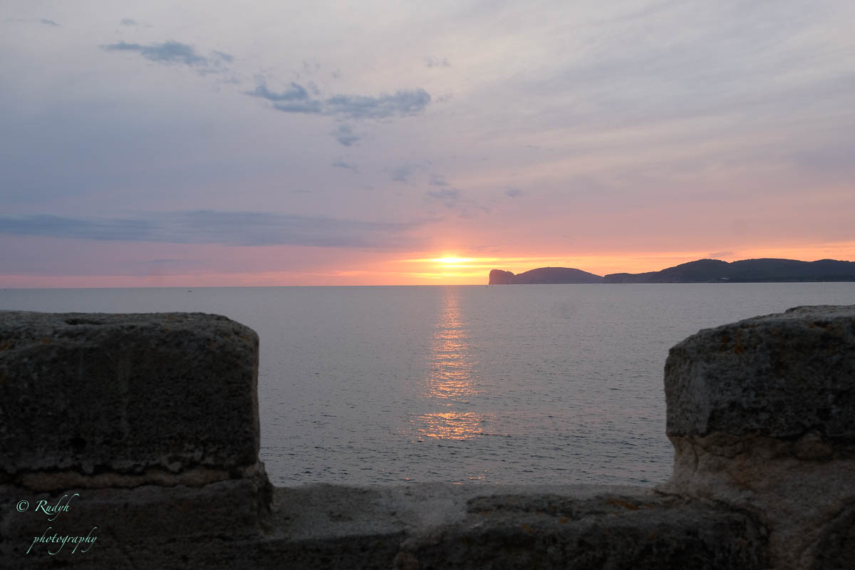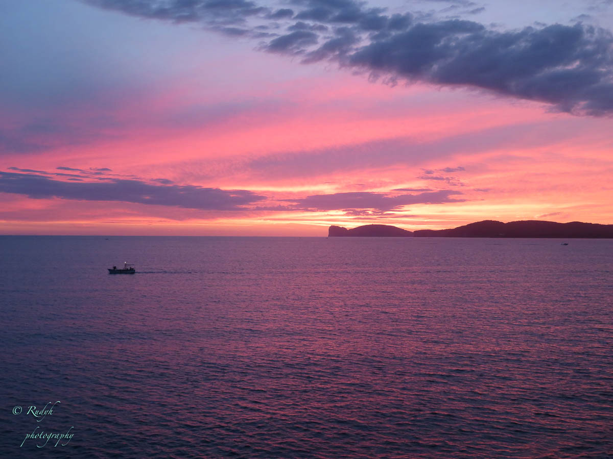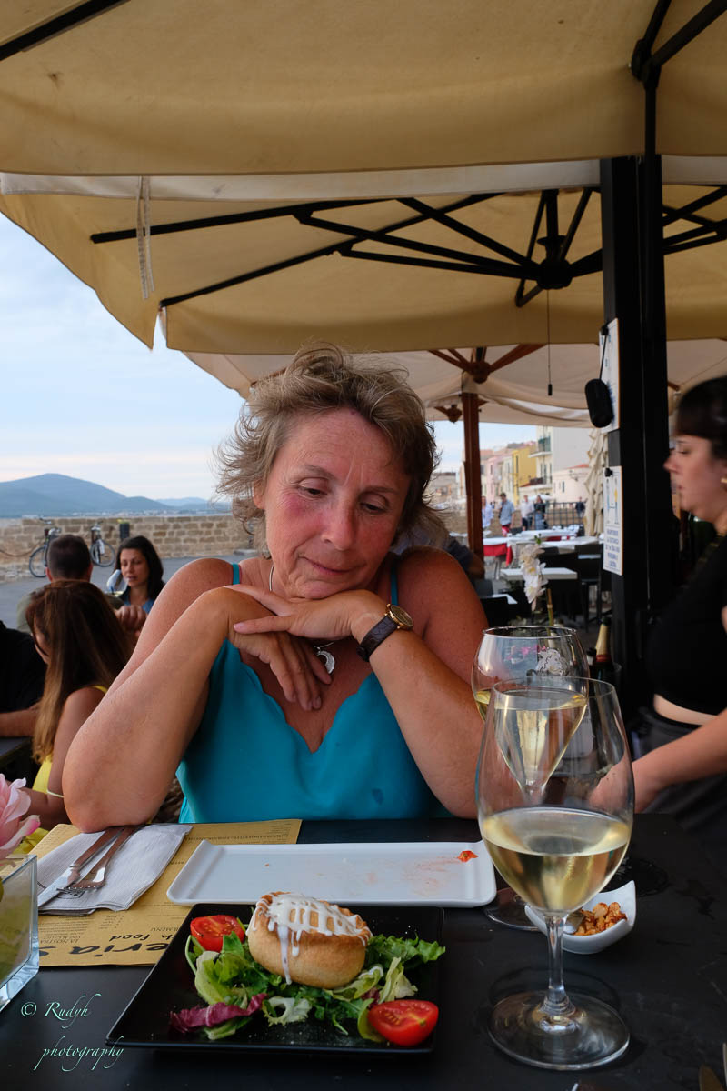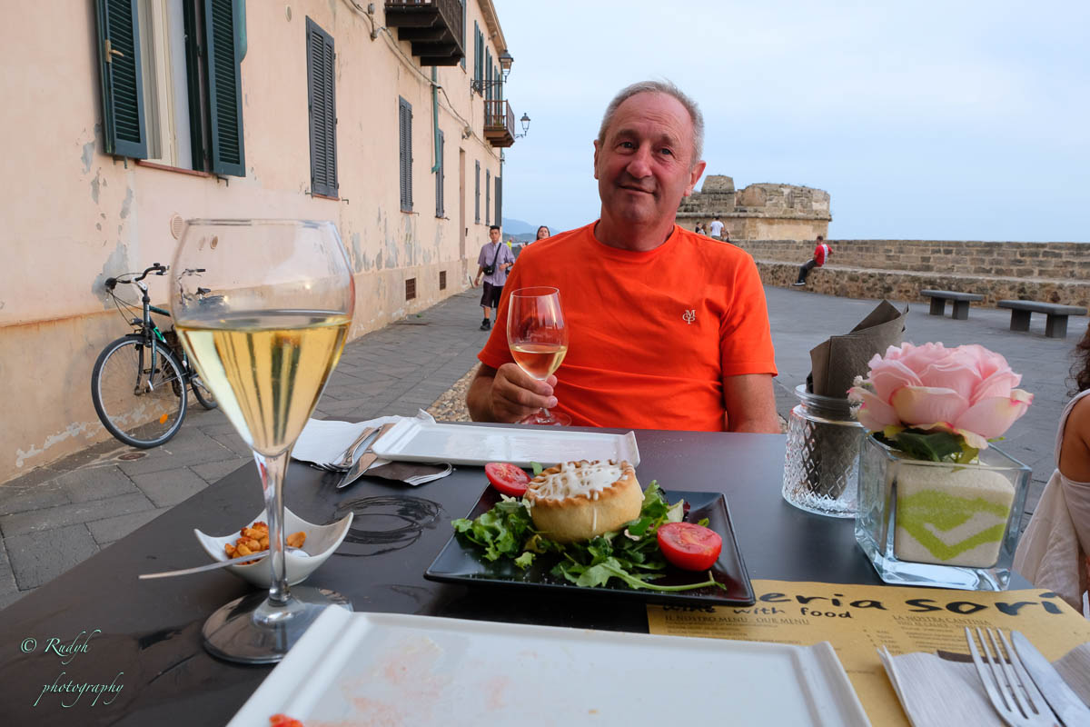 In de late namiddag houden we het voor bekeken met de rustdag en rijden we alvast eens naar Alghero voor het aperitief en iets te eten.We hadden gelezen dat de stadsomwalling van Alghero zeker de moeite waard was om eens over te wandelen, dus daar gaan we als eerste naartoe. We doorkruisen de jachthaven en passeren daar een prachtig oud zeilschip … waarmee je ook weer een dagje kan gaan meezeilen … gezien de vorige, schitterende ervaring met een zeiltocht, kriebelt het toch wel om dit nog een keertje te doen vooraleer ‘back to reality’ te gaan … toch even over nadenken misschien ? We wandelen verder de stadsmuren op en daar blijken er tientallen bars/resto’s gevestigd te zijn, allemaal met zicht op de zee … totaal onverwacht, maar wel heel stemmig !