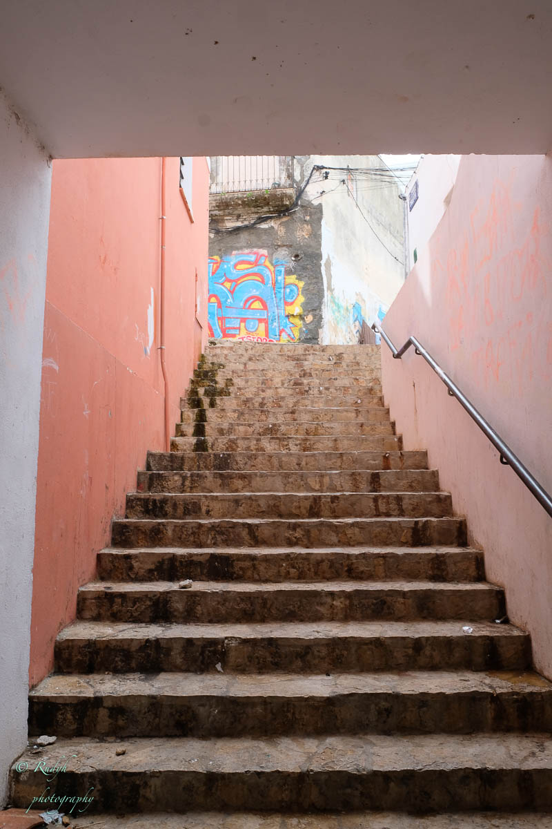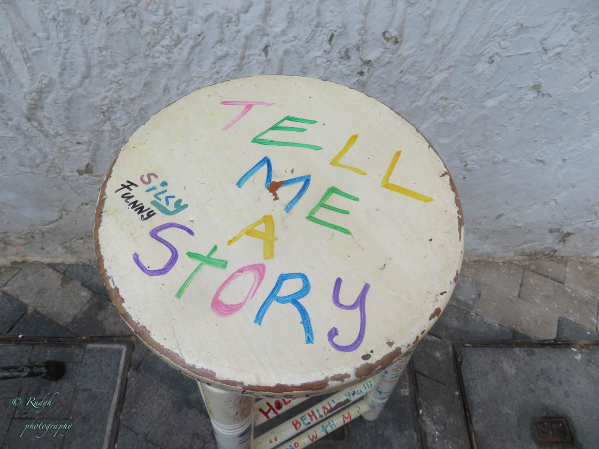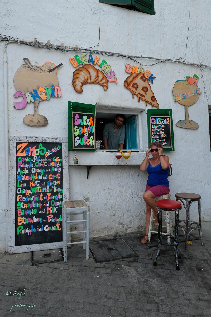 We blijven er een tijdje van het 360° uitzicht genieten ( de grote Cruise schepen van daarnet lijken wel DinkyToys van hierboven 🙂 ), nemen uiteraard de nodige fotootjes en keren dan langs de andere kant van de helling terug naar de stad. Opnieuw veel kleine, kronkelende steegjes met vooral kleine, witgekalkte huisjes en occasioneel een winkeltje of cafeetje. Zo komen we halfweg langs een kleurrijk barretje waar ze bliljkbaar de lekkerste smoothies maken volgens eigen keuze van samenstelling.