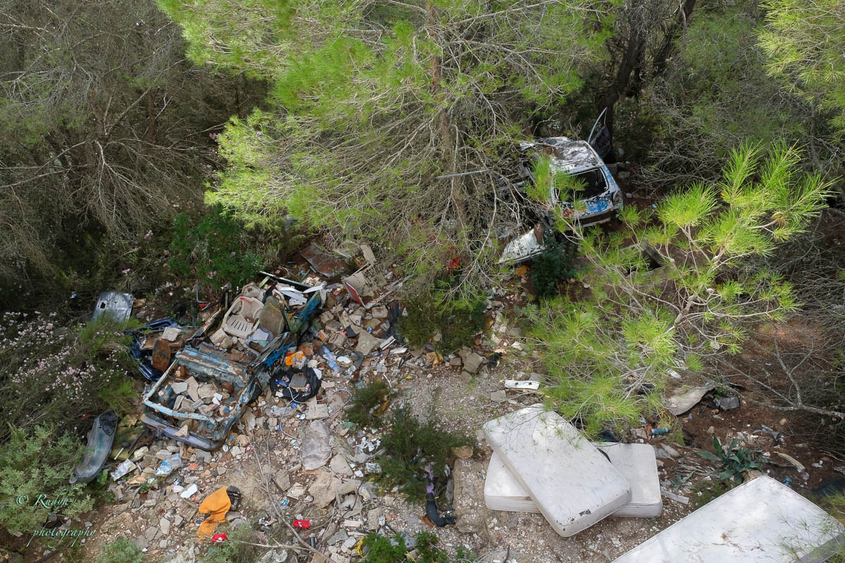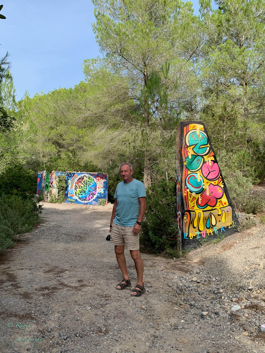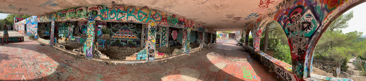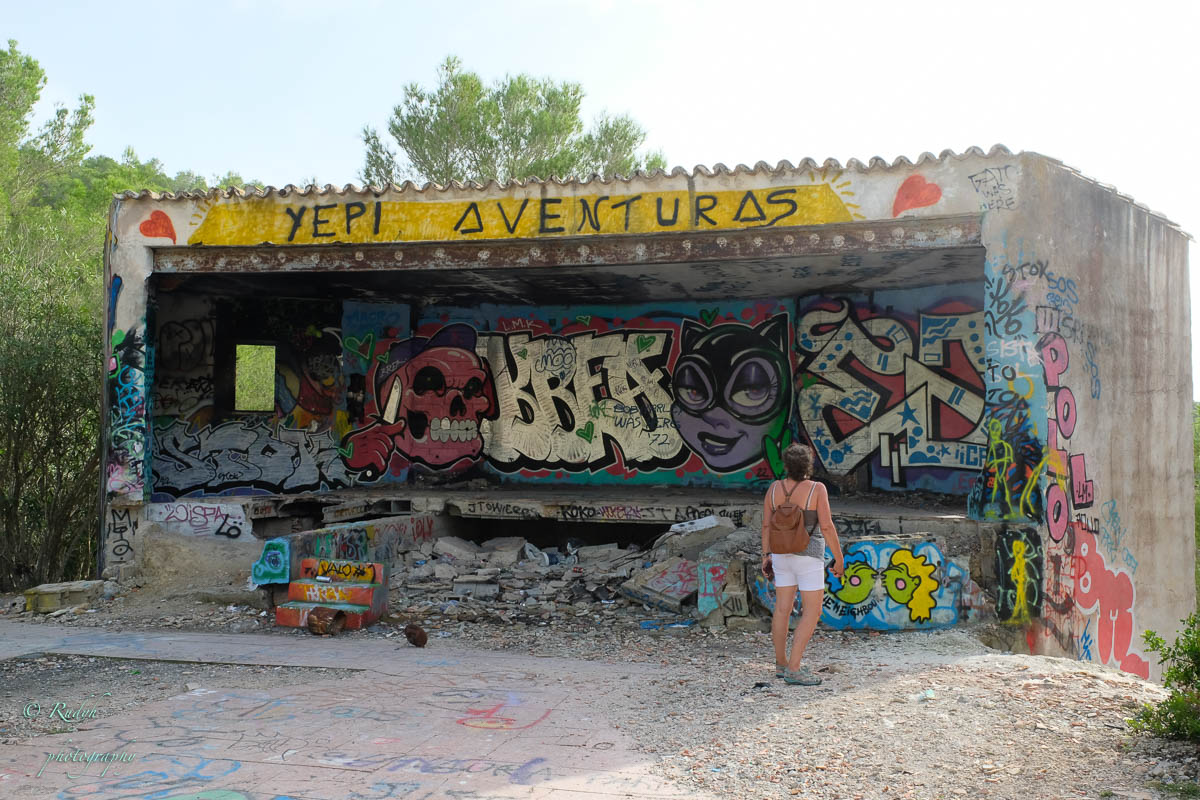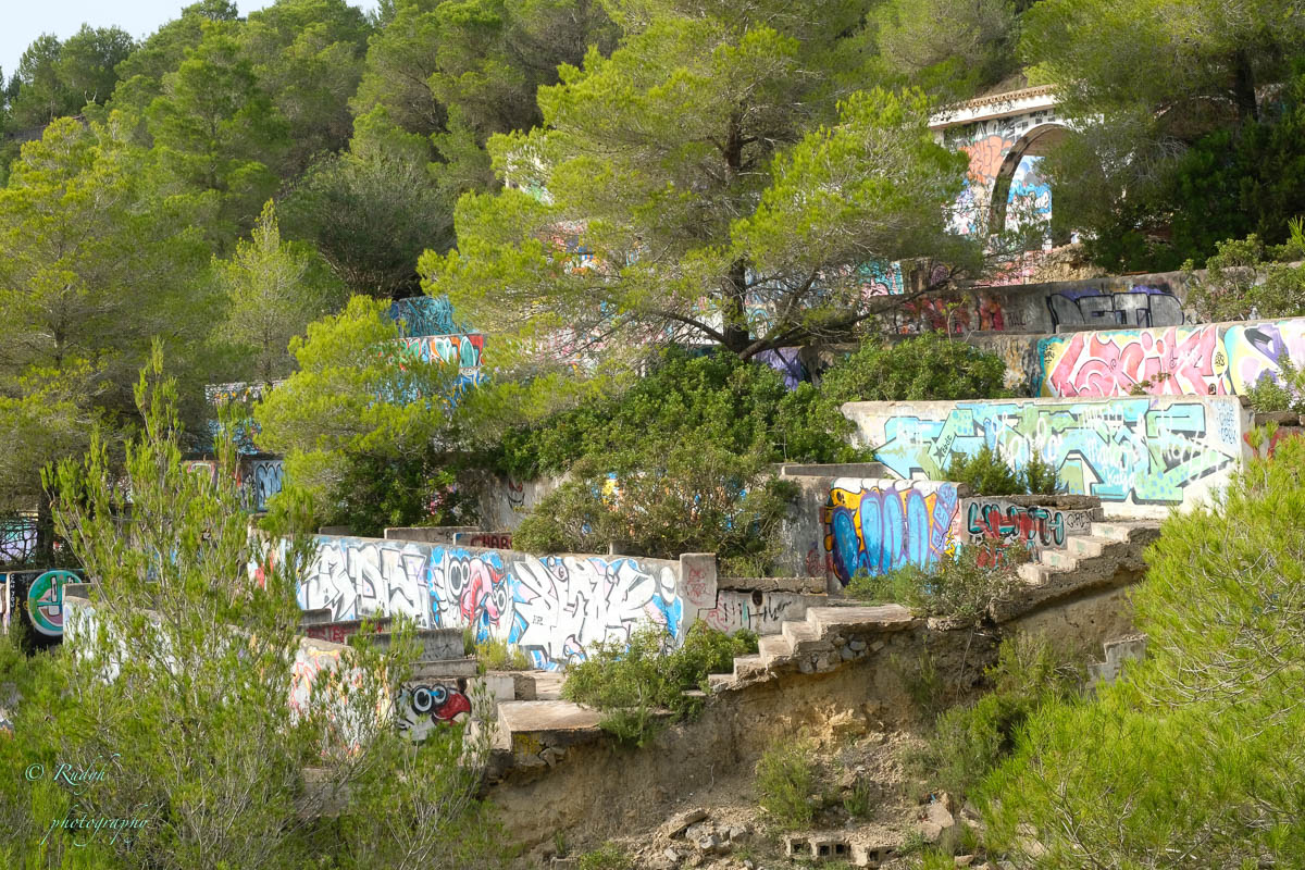 Na dit rotsachtige intermezzo is het tijd voor onze laatste bestemming van deze dag. Hoewel het officieel nergens vernoemd of gepromoot wordt, vind je op internet wel heel wat meldingen terug over een verlaten festival site, die blijkbaar in de jaren 70 ooit werd ontworpen als gigantische openluchtdiscotheek ‘ Festival Club’ genaamd. In de toen nog wijd verspreide hippie-cultuur op Ibiza was dit bouwwerk in 1972 het mekka voor de vele festival liefhebbers die toenertijd naar het eiland afgezakt kwamen voor FlowerPower, muziek, drank en nog een heleboel andere ‘ geneugten ‘ …