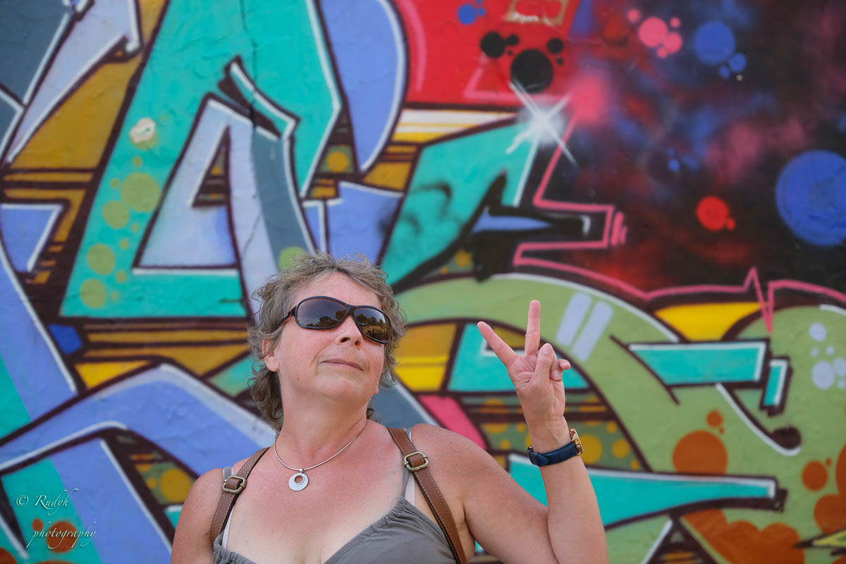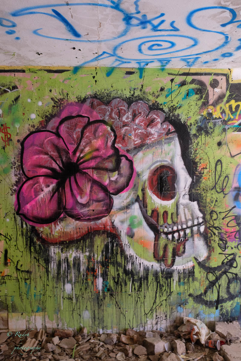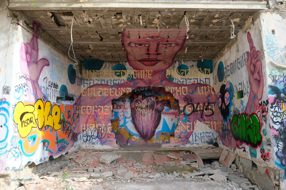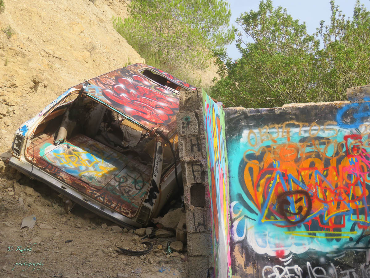 Je kan het bouwsel van beneden uit totaal niet zien liggen, maar we vinden het toch zonder veel moeite, en parkeren ons autootje om er eens rond te kijken. Het blijkt een zeer bevreemdende plek te zijn, heel erg fascinerend en ook wel een beetje hallucinant … bizar hoe zo een – voor die tijden – futuristisch bouwsel zo in verval geraakt is en hoe het stilaan eigenlijk weer helemaal in de natuur opgaat … Aan de ene kant is het dus totaal in verval en ligt er overal een boel rotzooi, van matrassen, eet- en drankresten tot complete autowrakken, waarvan je je echt niet kan voorstellen hoe dit daar ooit geraakt zijn, maar aan de andere kant zijn de prachtige grafitti werken echt geweldig mooi gedaan, en in combinatie met het verval van de hele constructie ook wel een beetje ‘mytisch’ ( meer dan die rots van eerder op de dag 🙂 )