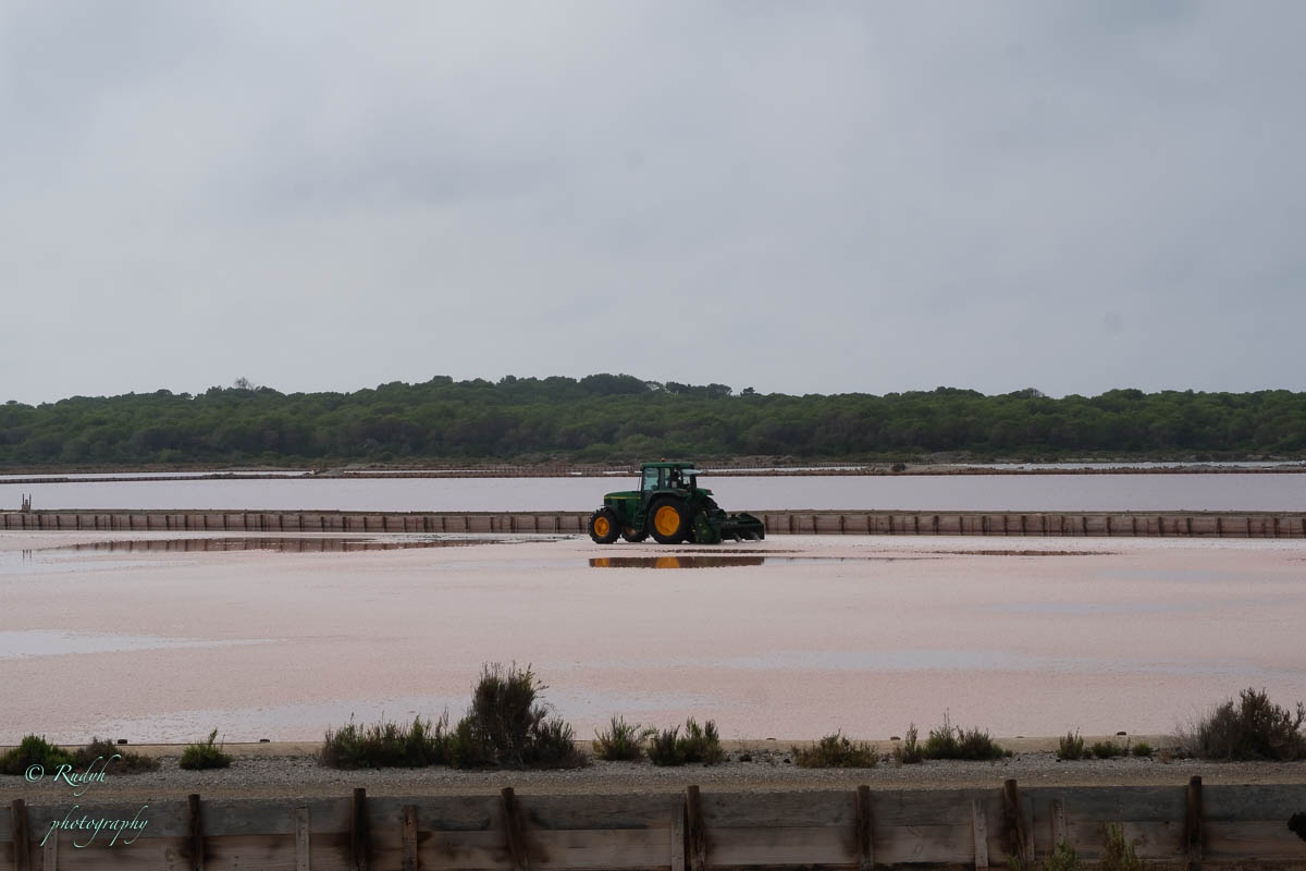 Aan deze kant van het natuurgebied kan je wel een beter beeld vormen van hoe het er op die zoutvlaktes aan toe gaat om het zout effectief te ‘oogsten’. Het gaat om verschillende vlakken waar een laagje zout water in gepompt wordt en waar dan door verdamping van het water na enige tijd nog enkel ( grof ) zout overblijft. Dat wordt dan met een tractor enkele keren ‘omgeploegd’ zodat het volledig opdroogt, waarna het op grote bergen gestort wordt om uiteindelijk nog één of andere behandeling te krijgen vooraleer het op onze tafels terechtkomt ( in allerlei verschillende samenstellingen )