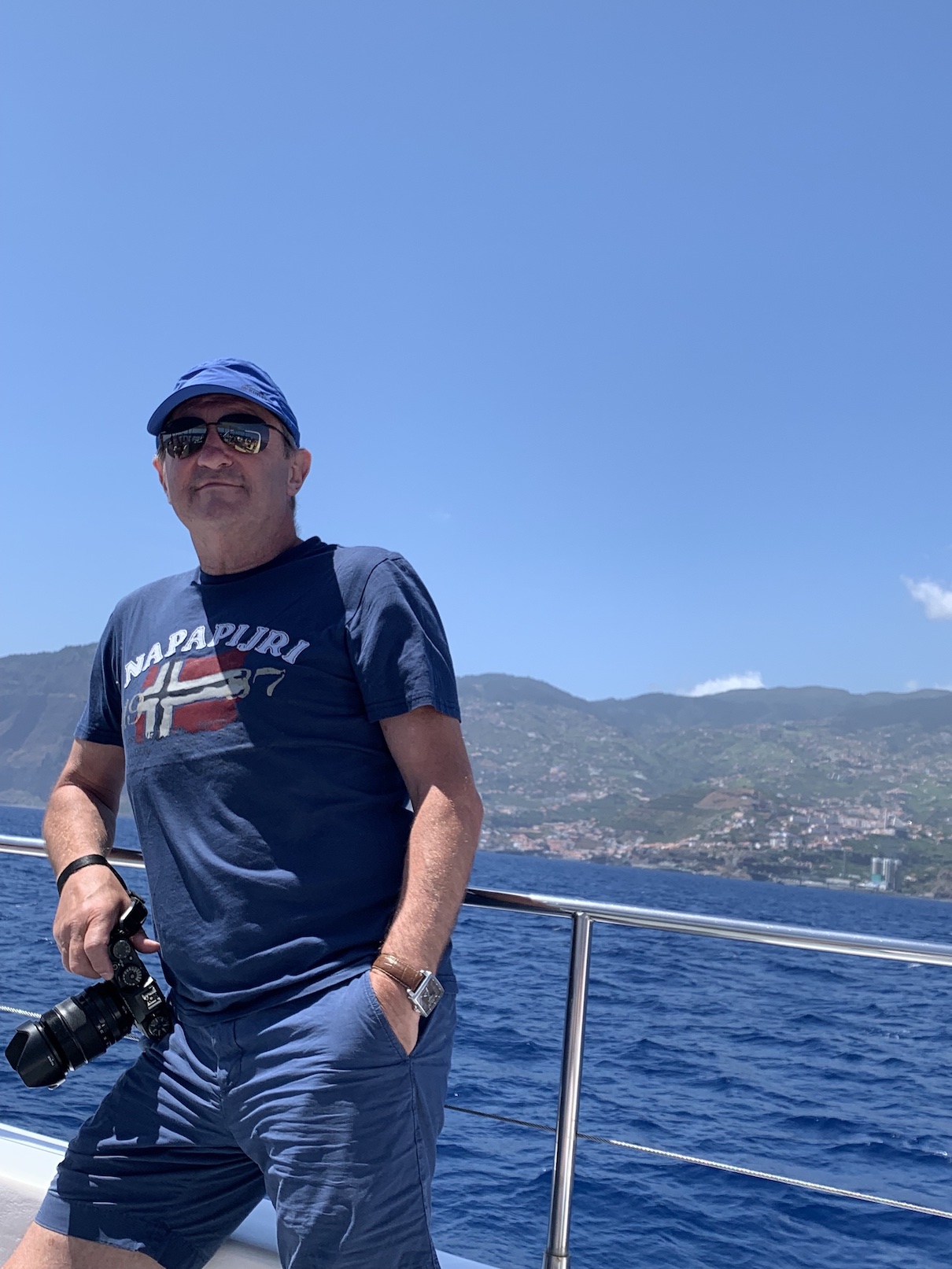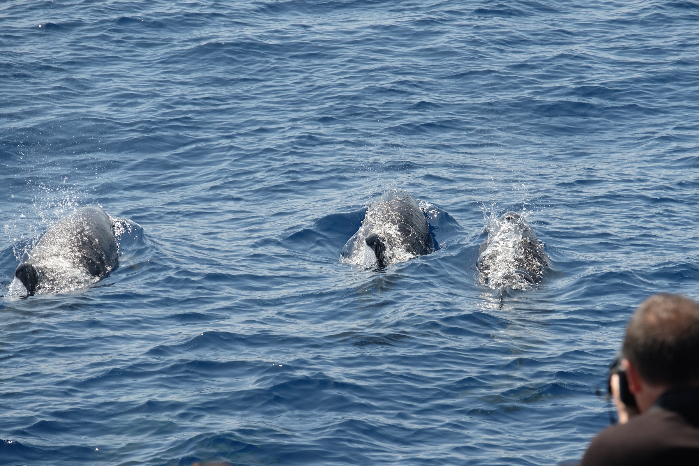 Je ziet het al van ver, er liggen nog een paar bootjes te dobberen op de bewuste plek, maar gelukkig varen die weer weg net op het moment dat wij daar aankomen ( blijkbaar mag je van de overheid in Madeira maar 10 minuten een groep dolfijnen spotten, om de dieren te beschermen … maar het kan ook voor de commerce zijn natuurlijk, zodat elke maatschappij de kans krijgt om zijn passagiers de beestjes te laten bewonderen … 🙂 )