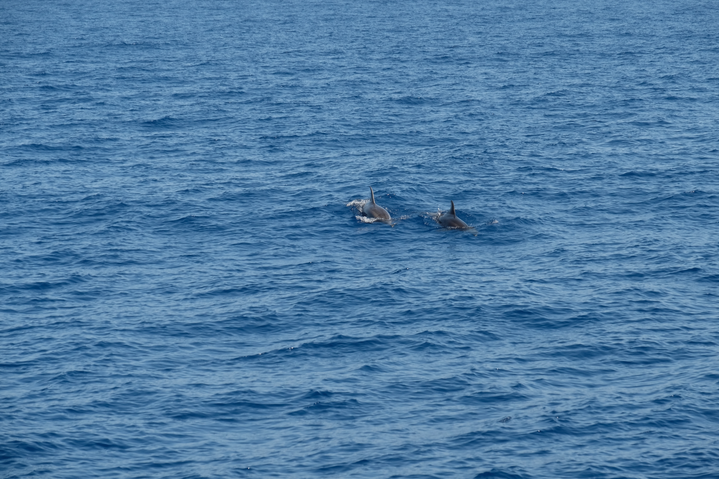Wat het weer betreft is het vandaag zowat de beste dag tot nu toe, de zon schijnt volop en het is ook best warm. Eens op zee is dat natuurlijk veel aangenamer met een windje erbij en we genieten van de prachtige dag op het water. Na enige tijd krijgen we via de intercom te horen dat er een school dolfijnen gespot is en dat we daar naartoe varen.
