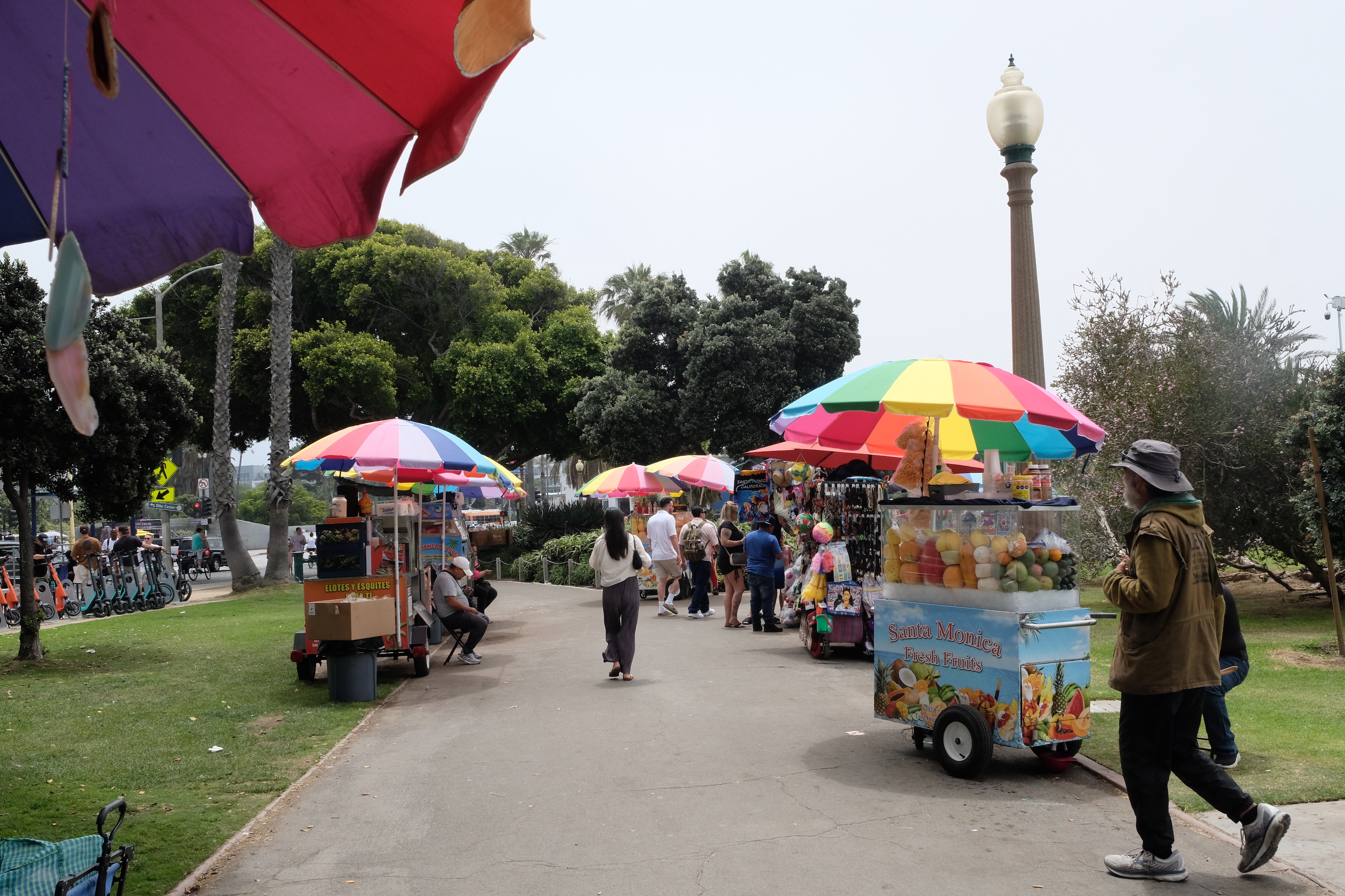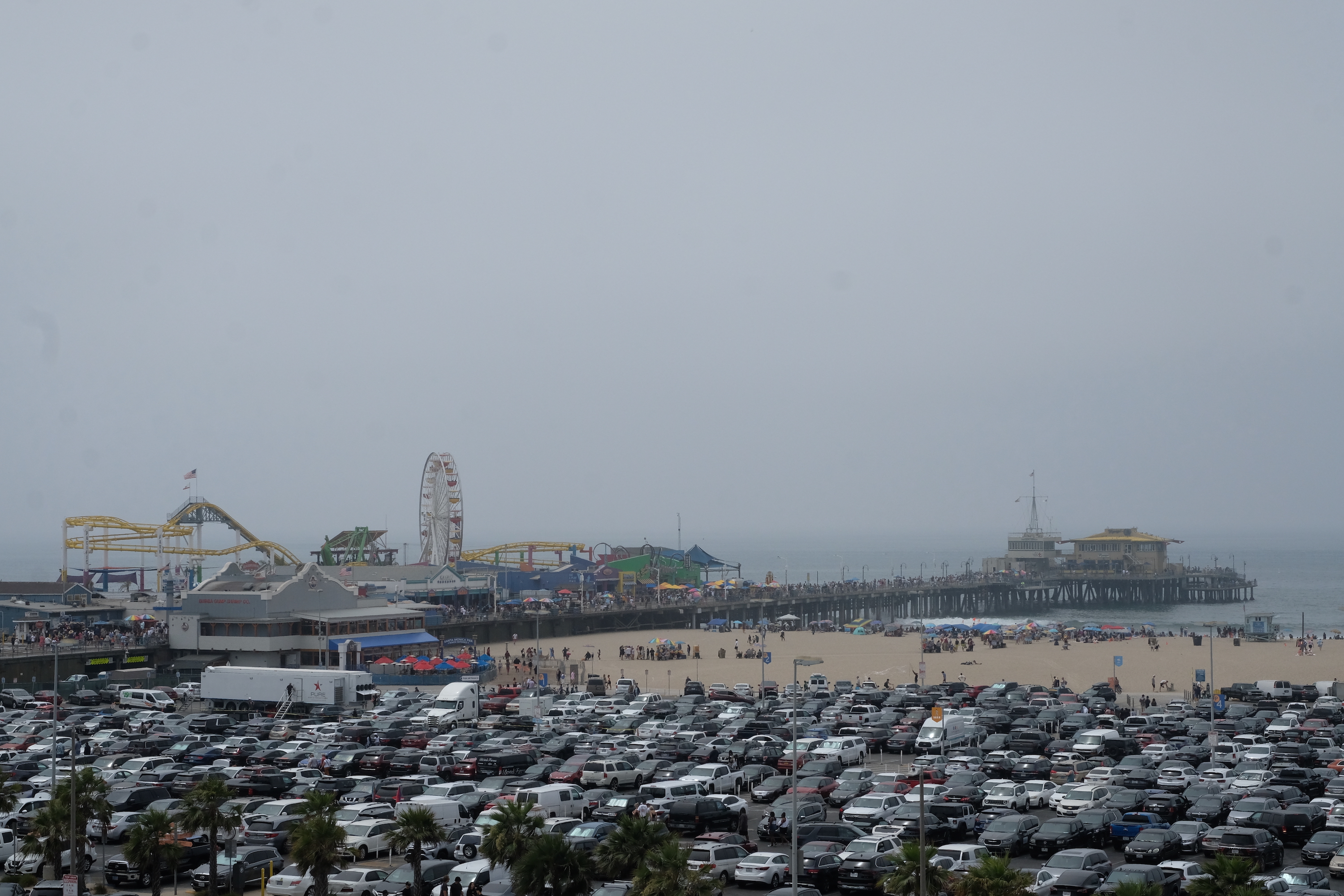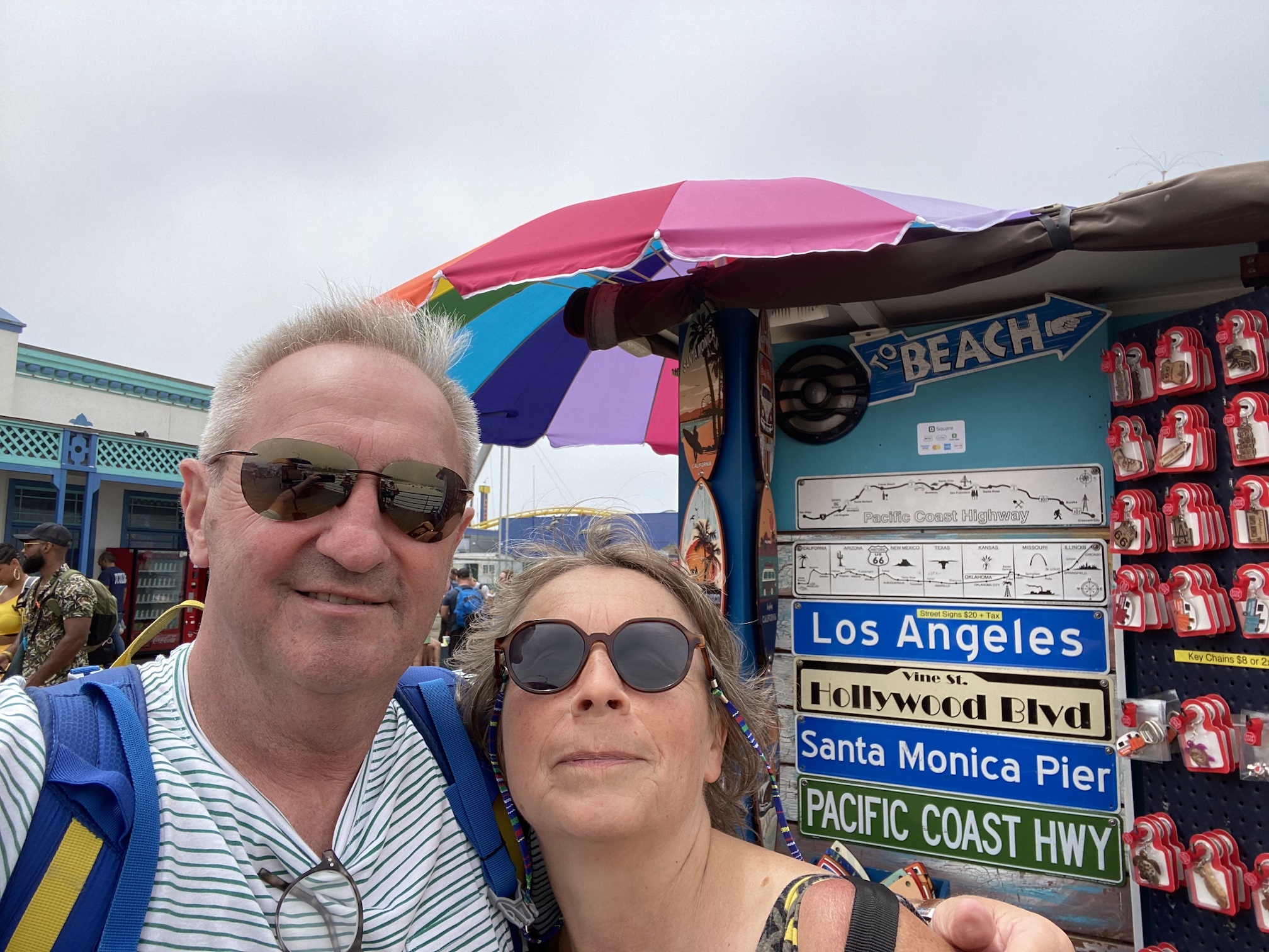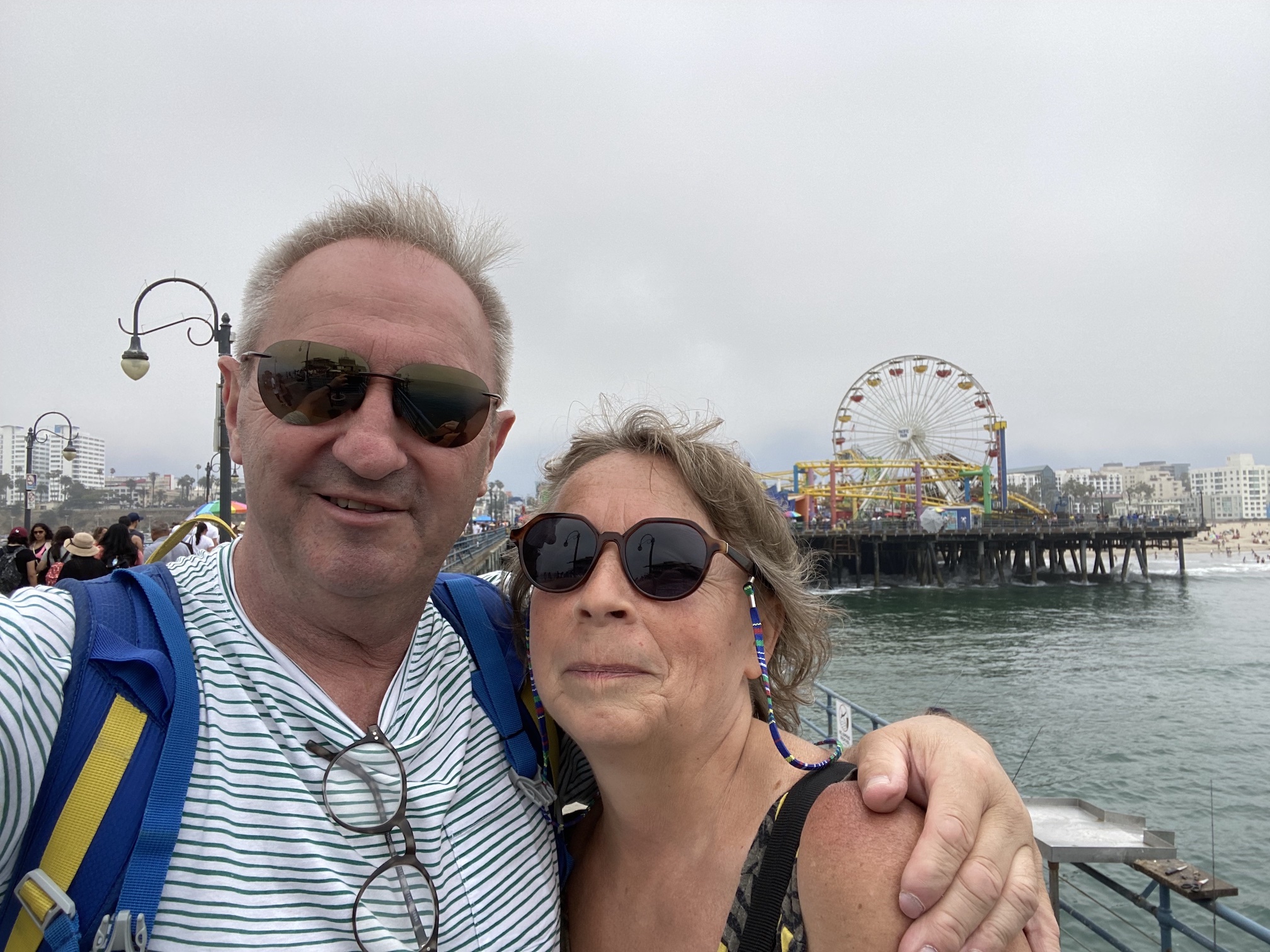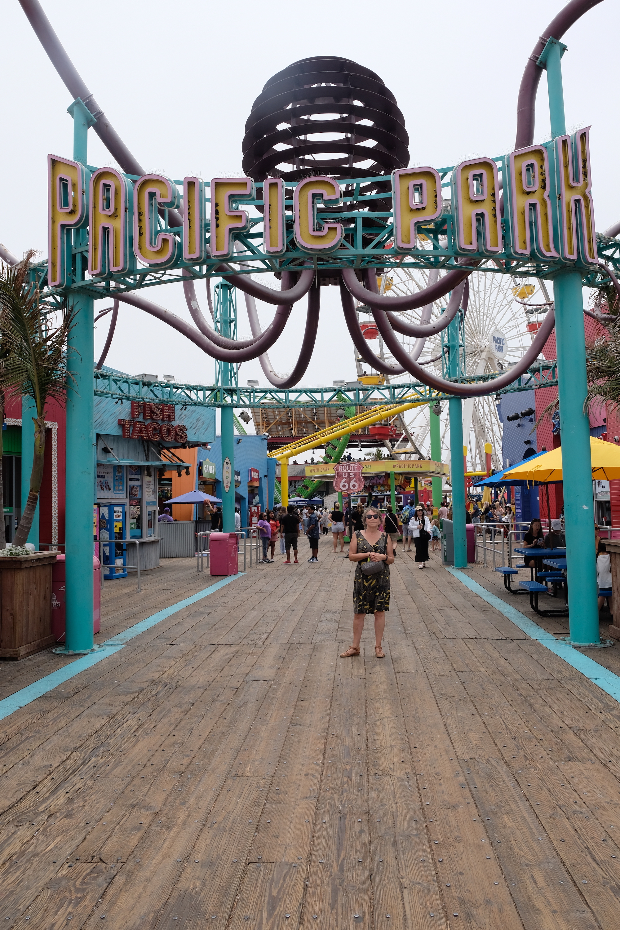 Het is wel een beetje bizar, want hoewel redelijk heet onderweg is het hier een pak frisser en mistiger. Blijbaar zorgt de oceaan hier heel vaak voor nevel, waardoor het er allemaal een beetje ‘grijzer’ uitziet dan de res van de rit door L.A. We wandelen de Santa Monica Pier op en daar is het toch wel een beetje over de koppen lopen, de hele pier is een beetje een pretpark met lunaparken en reuzenrad, souvenirwinkeltjes, straatverkopers en dito ‘artiesten’ … Amerikanen houden van dit soort kermisachtige toestanden, maar wij vinden het vooral jammer dat die mooie pier verdwijnt onder al dat pretpark gebeuren …