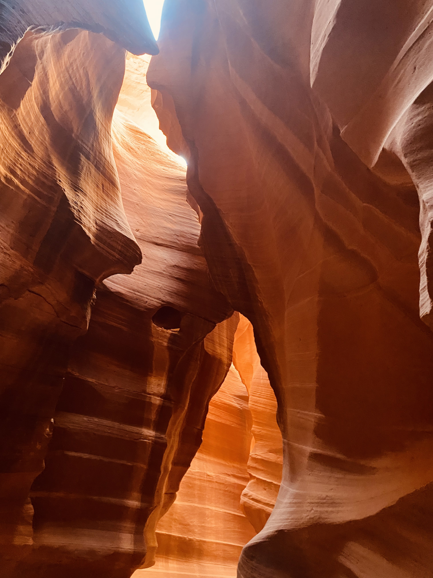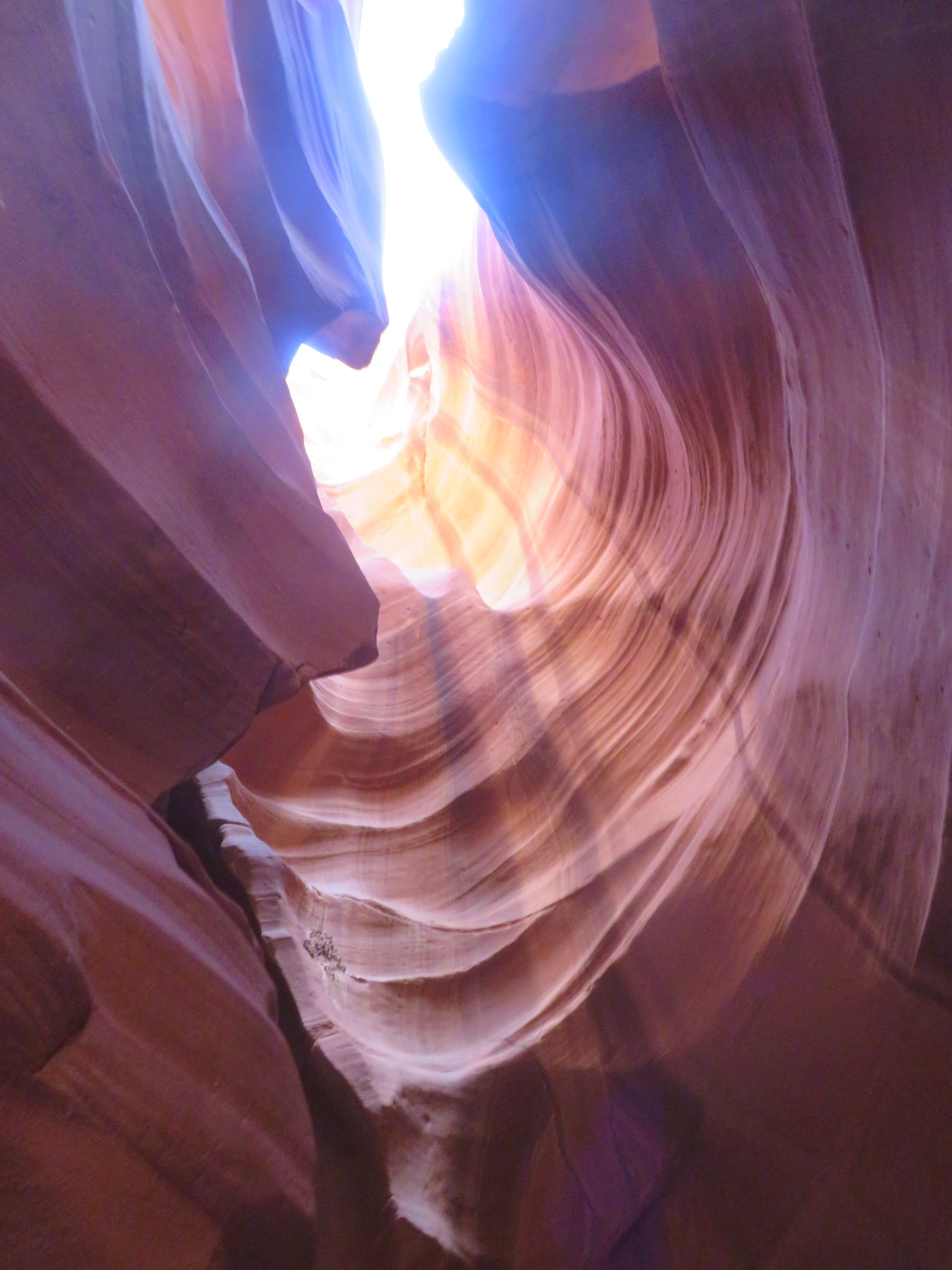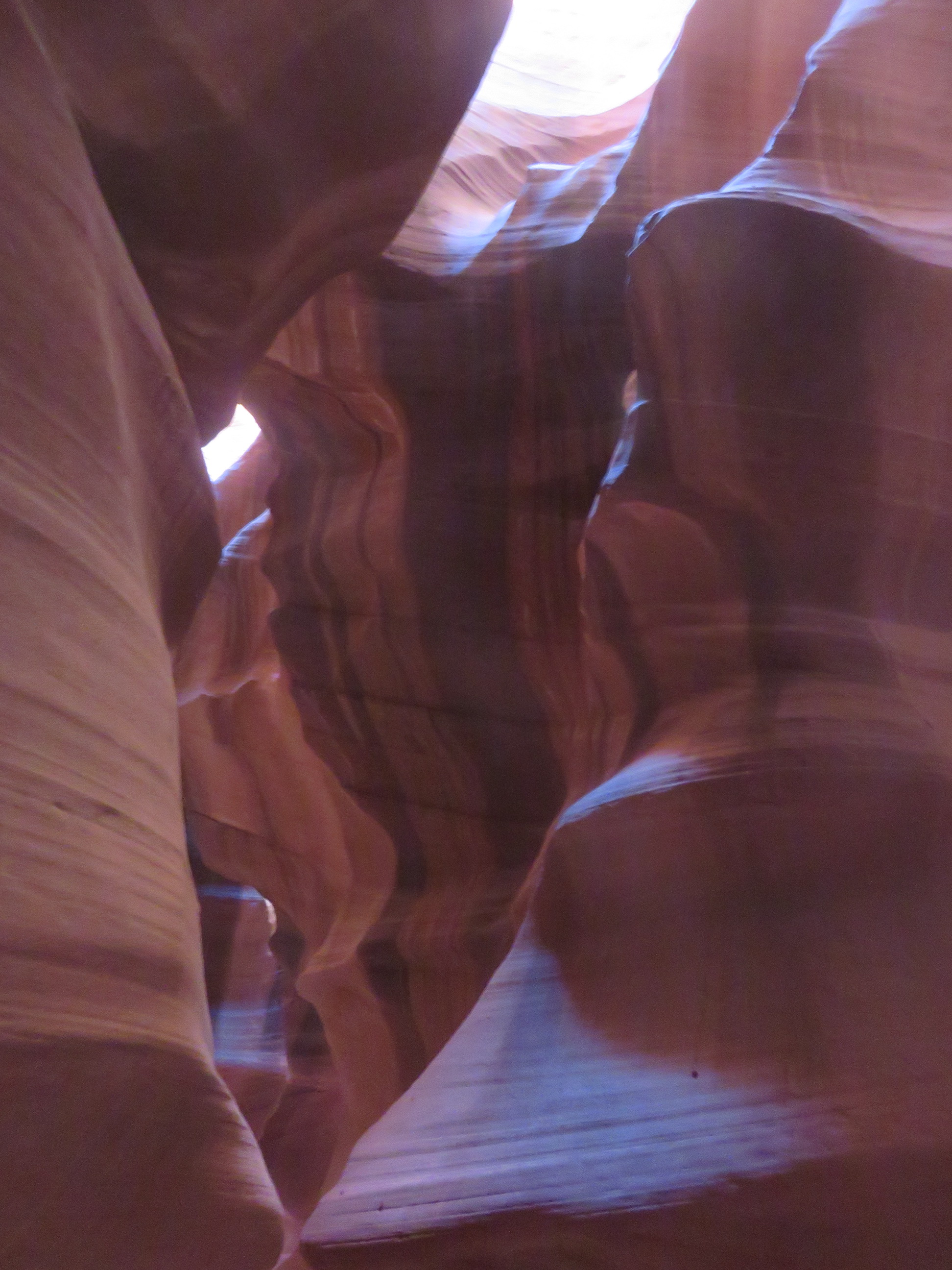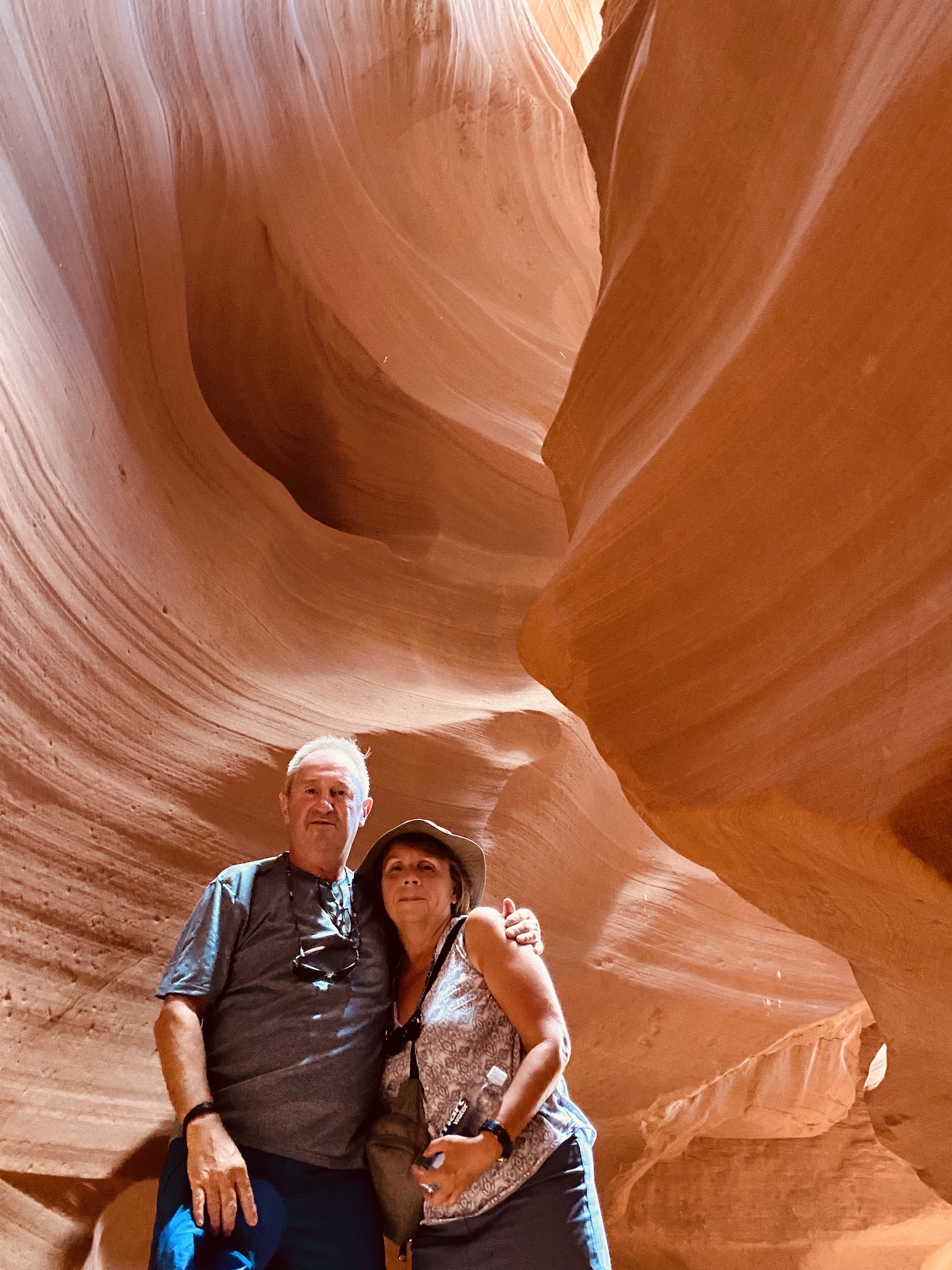 Je wordt er met een soort grote golfkar per 14 personen naar de ingang van die Canyon gebracht, waarna je er te voet in verder gaat. In de rotsen zelf dus, daar loopt een pad doorheen de rotsen en die zijn onwerkelijk mooi … De rotsen hebben alle tinten van rood, bruin, gelig, beige … en zijn kunstig gedraaid en getorst, de doorgang is vrij smal en bovenaan kan je nog net de blauwe hemel zien door de kleine openingen, een beetje magisch toch wel.