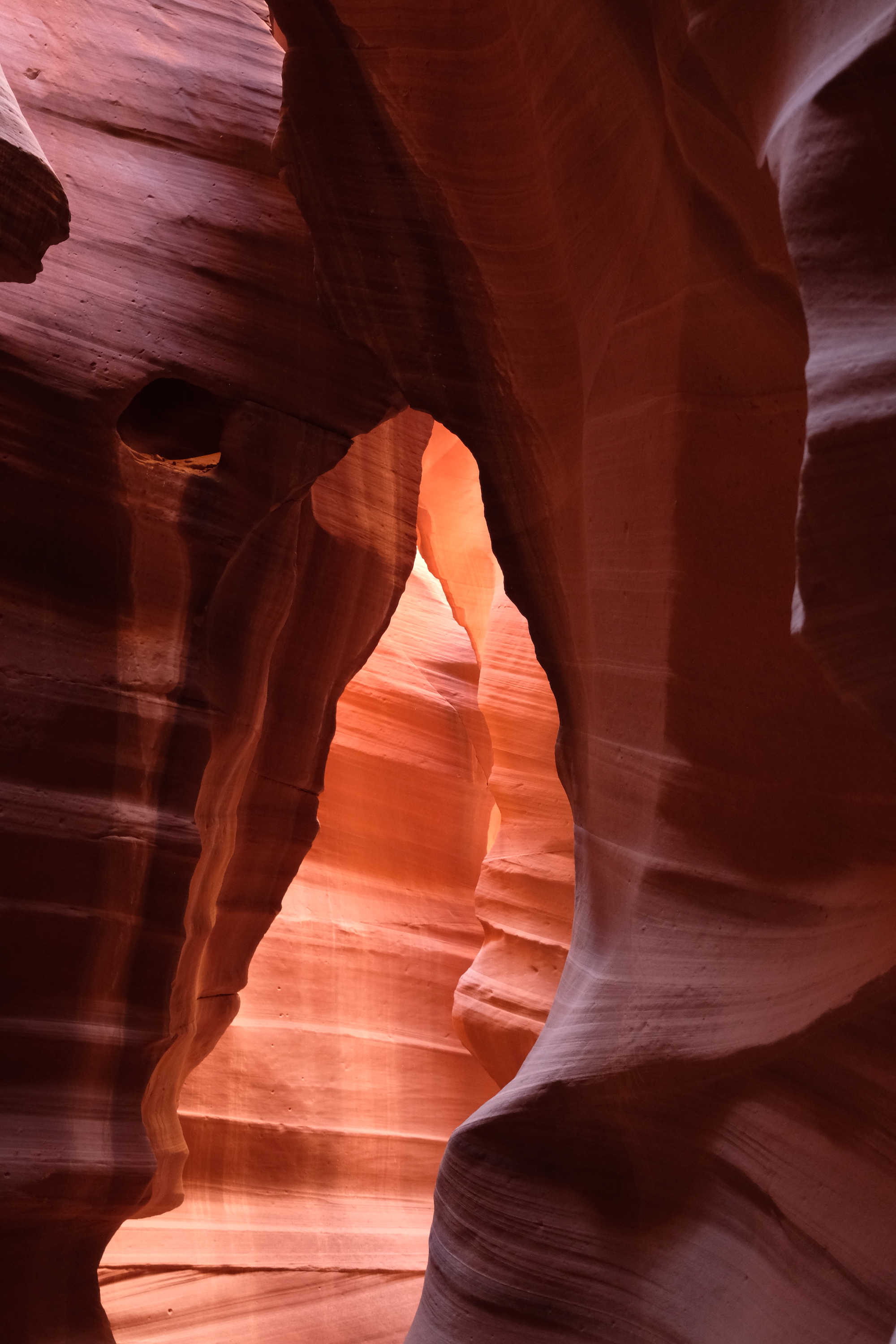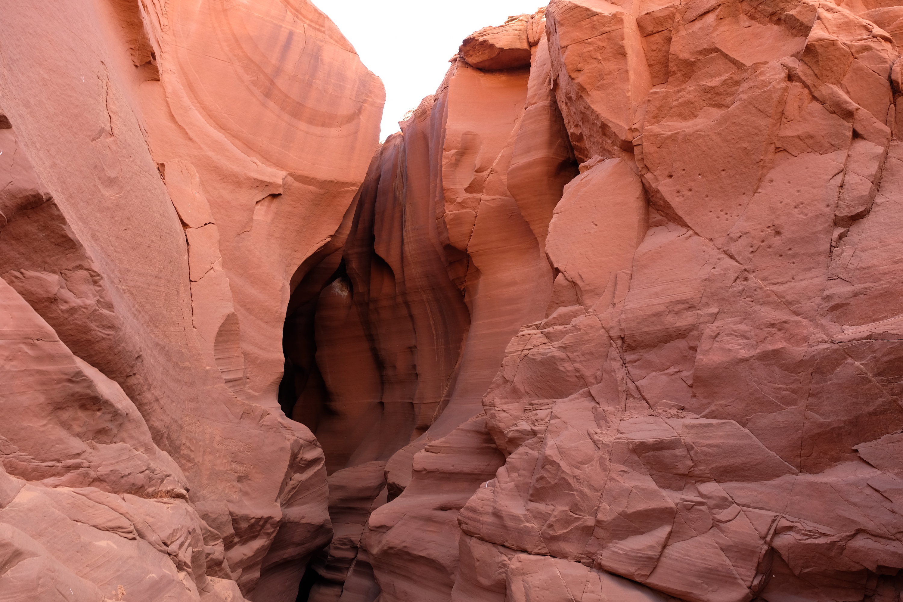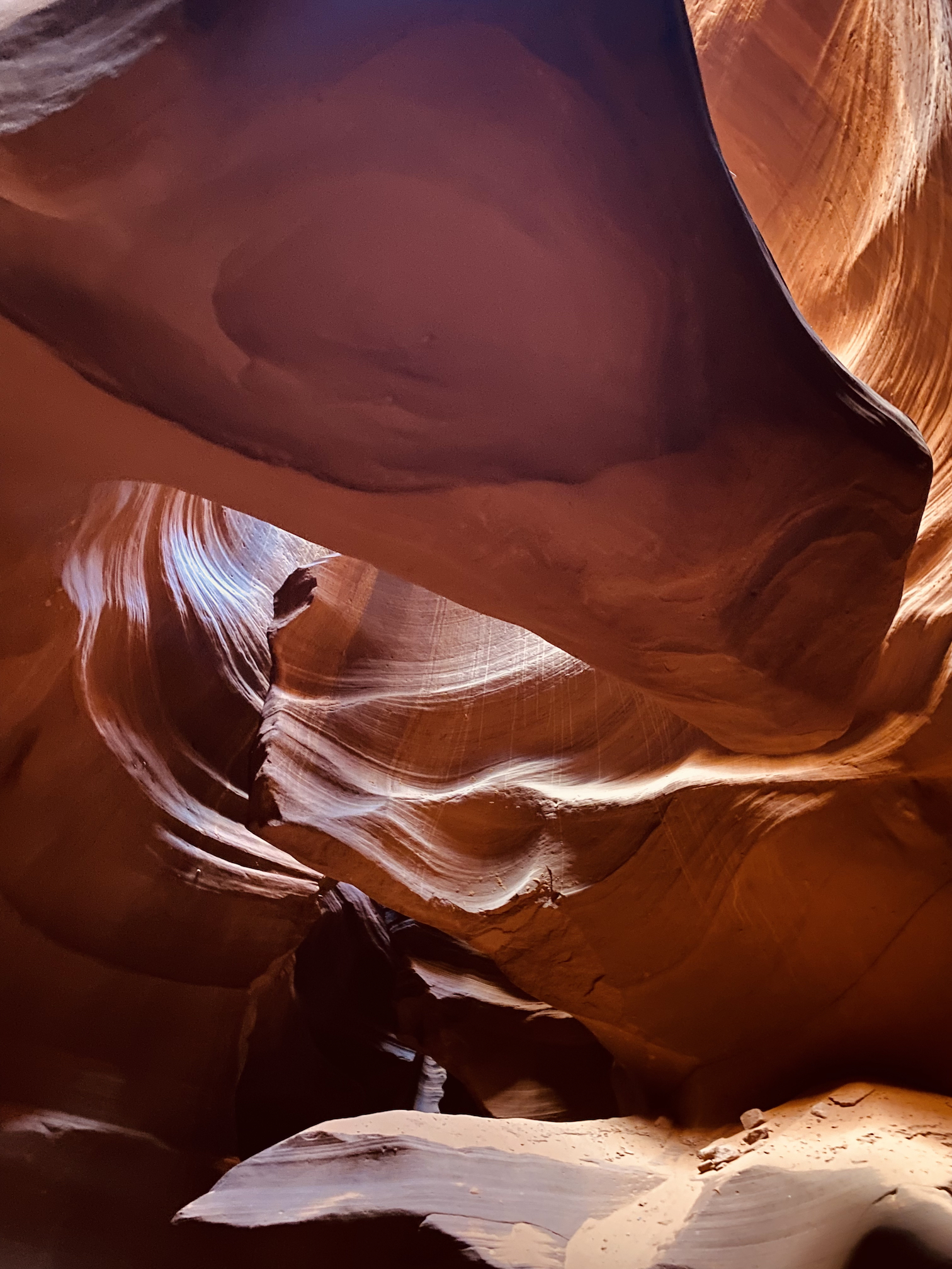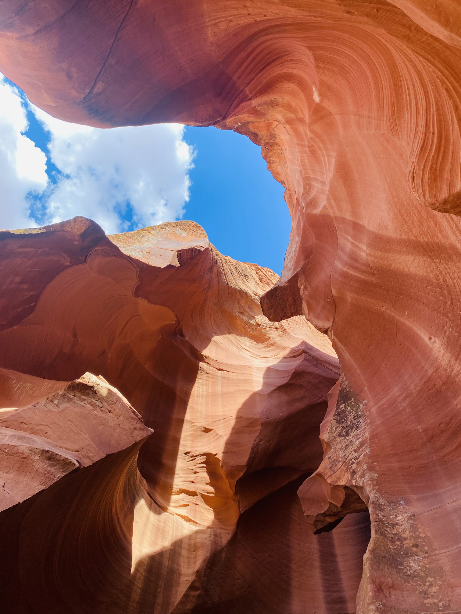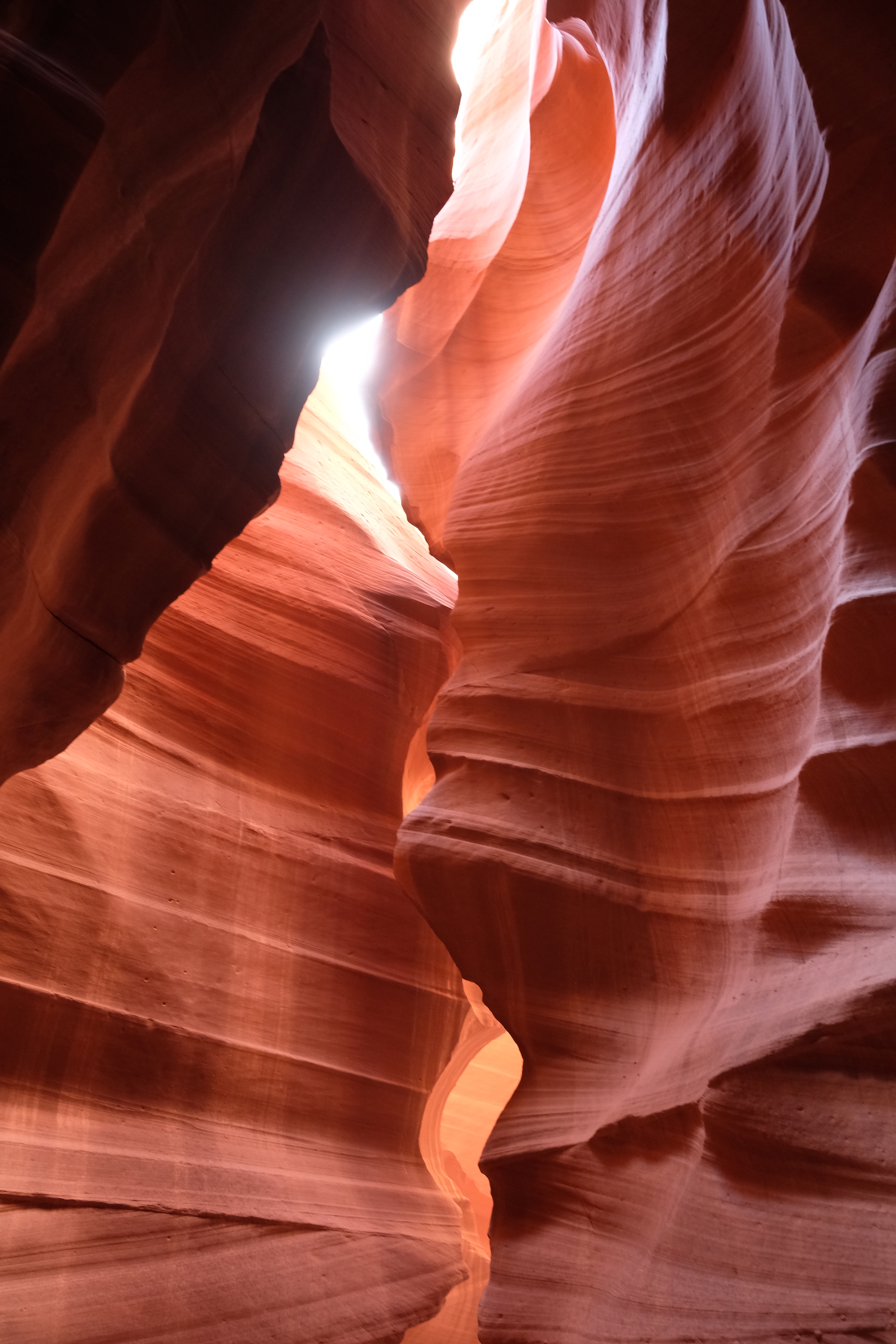 Je wordt er met een soort grote golfkar per 14 personen naar de ingang van die Canyon gebracht, waarna je er te voet in verder gaat. In de rotsen zelf dus, daar loopt een pad doorheen de rotsen en die zijn onwerkelijk mooi … De rotsen hebben alle tinten van rood, bruin, gelig, beige … en zijn kunstig gedraaid en getorst, de doorgang is vrij smal en bovenaan kan je nog net de blauwe hemel zien door de kleine openingen, een beetje magisch toch wel.