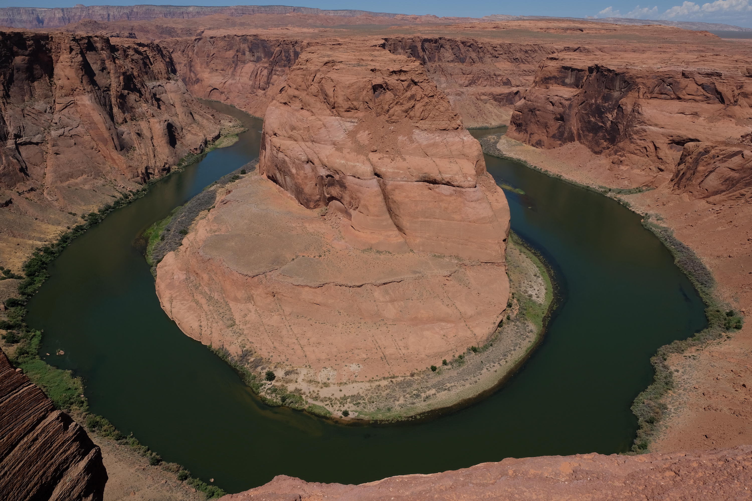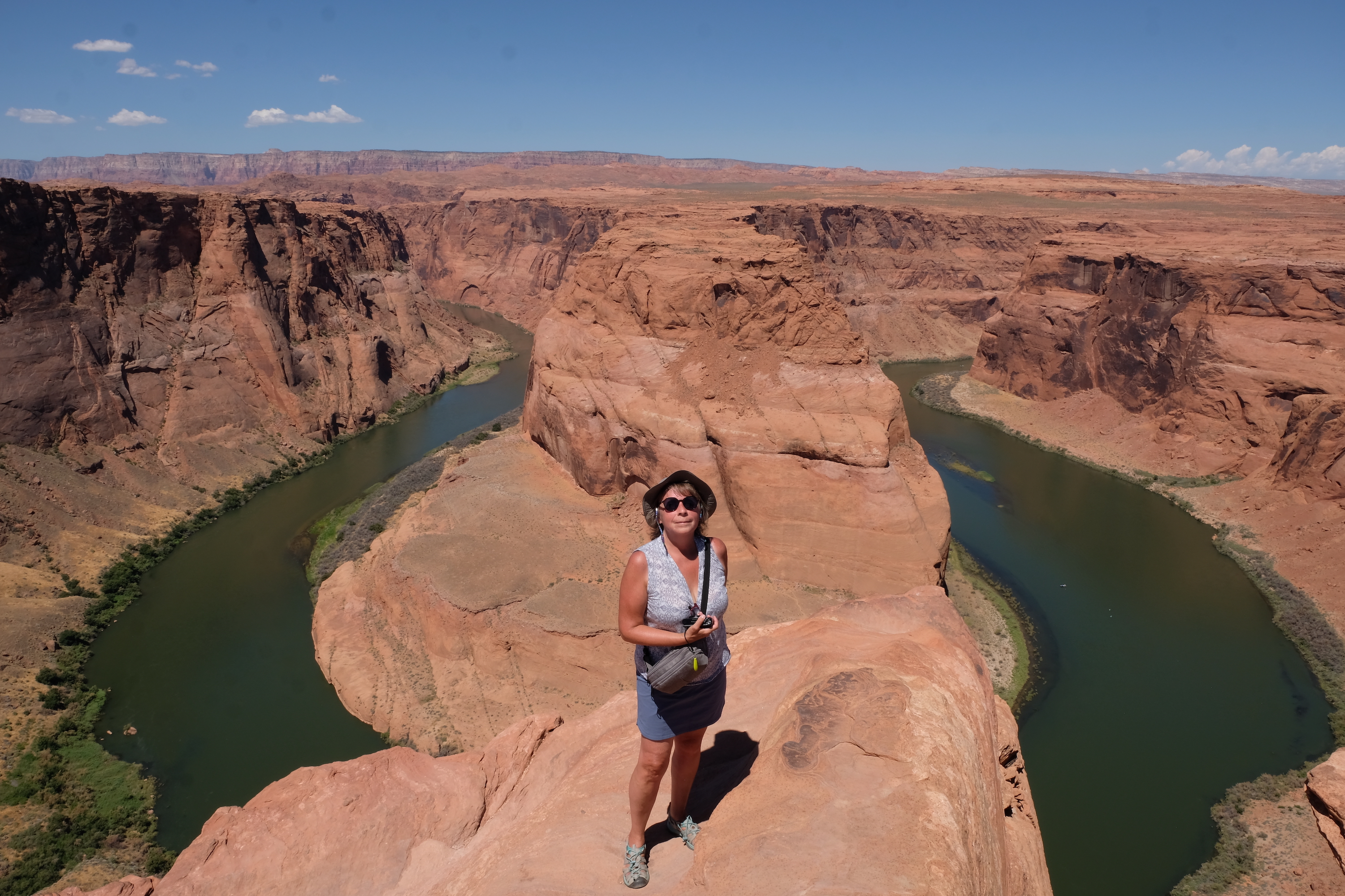 In de late namiddag hebben we een tour geboekt in de Upper Antelope Canyon, maar allereerst rijden we naar Horseshoe Bend, een bekend punt, waar je ( van boven af ) de Coloradorivier een perfecte, bijna volledig bocht kan zien maken in een uitloper van de Grand Canyon ( die dus wel heel ‘grand’ is 😉 )