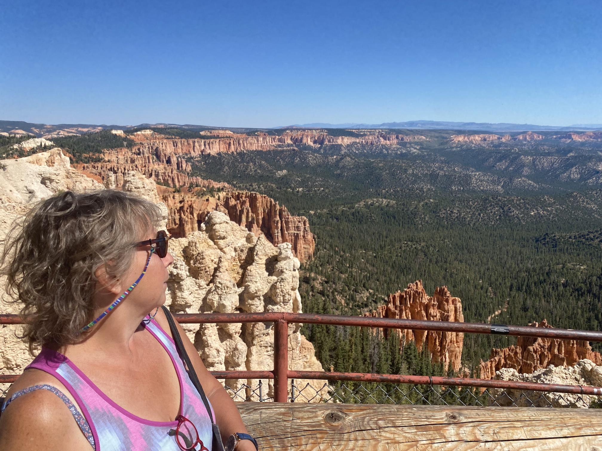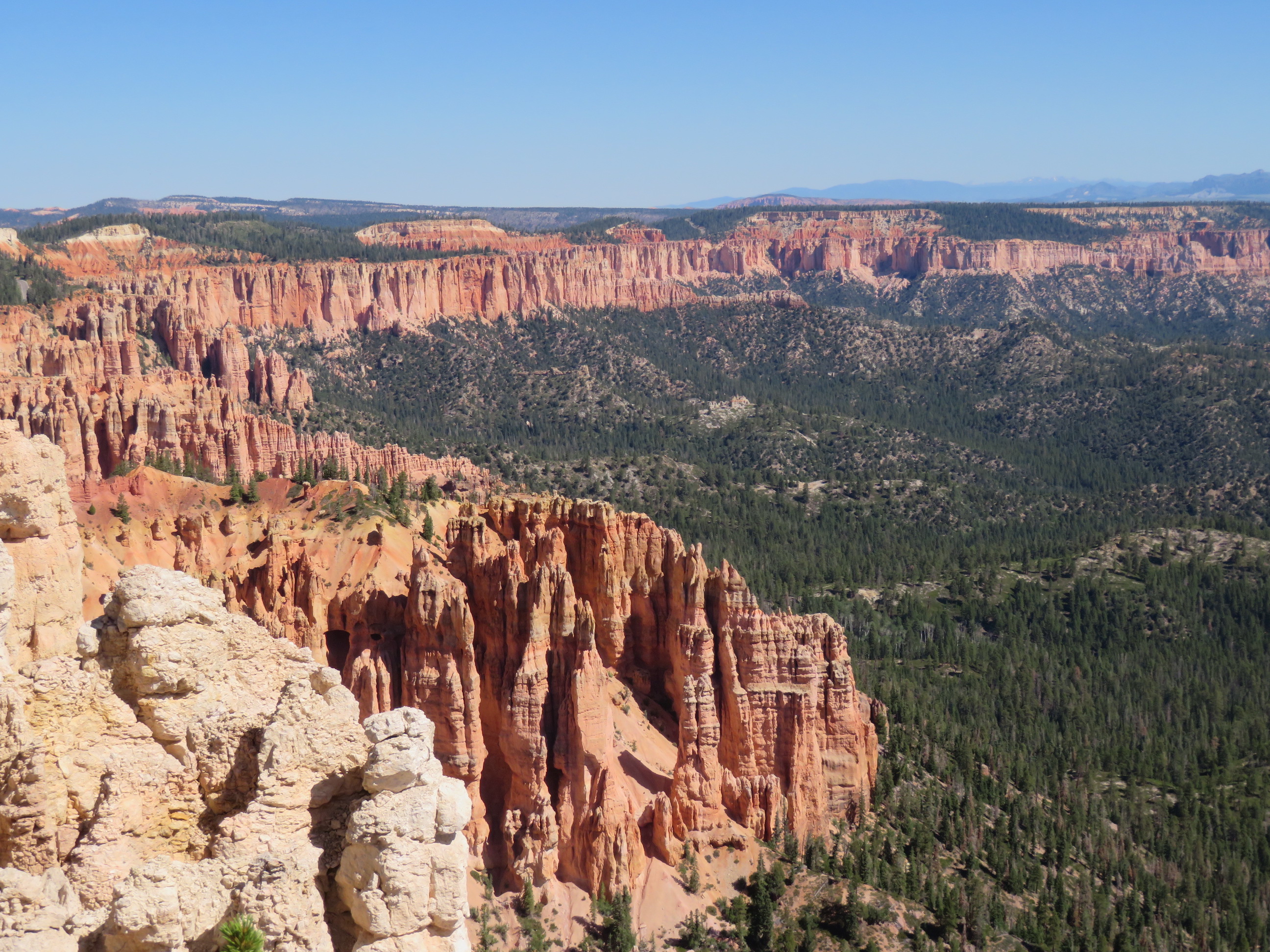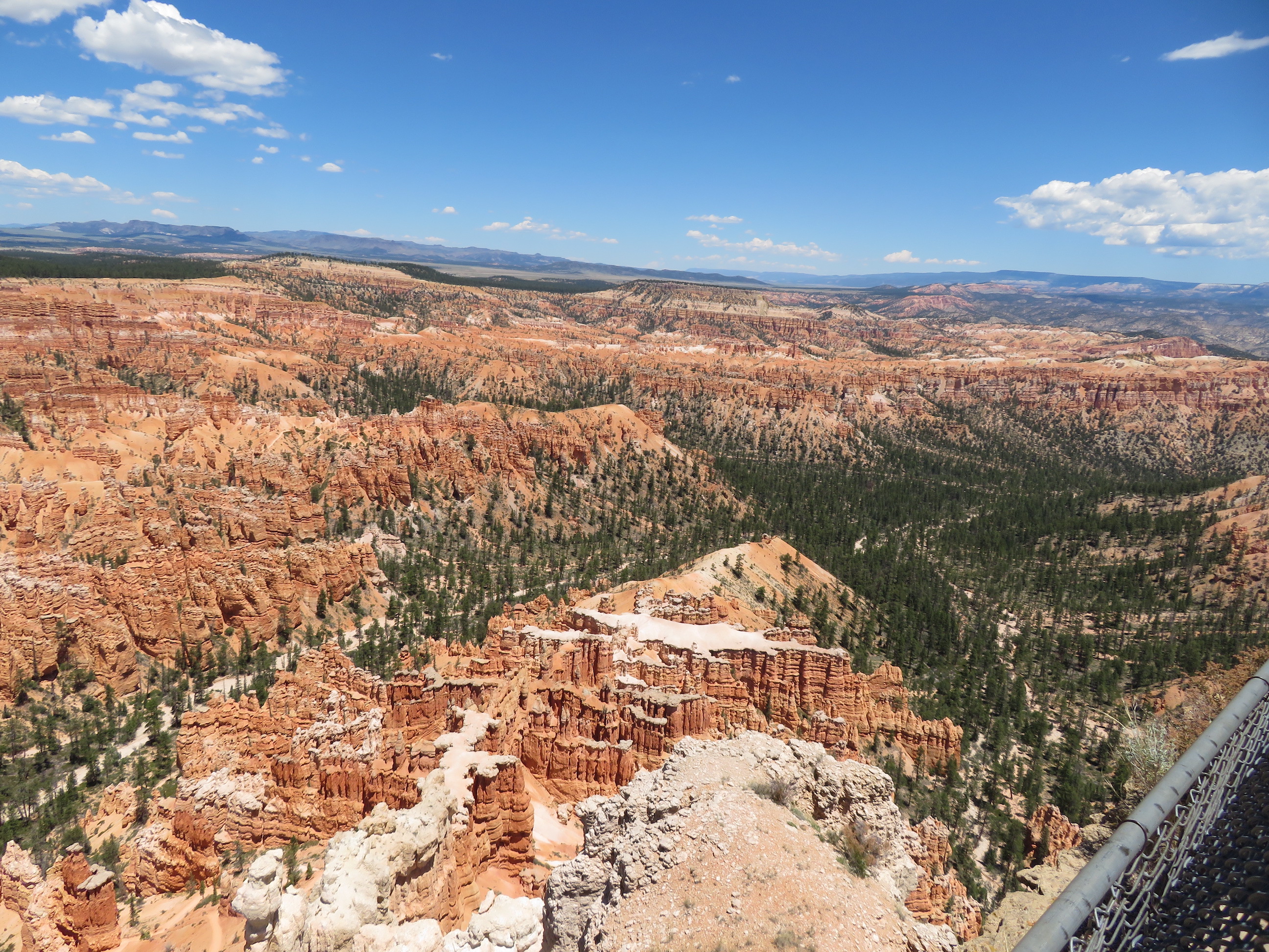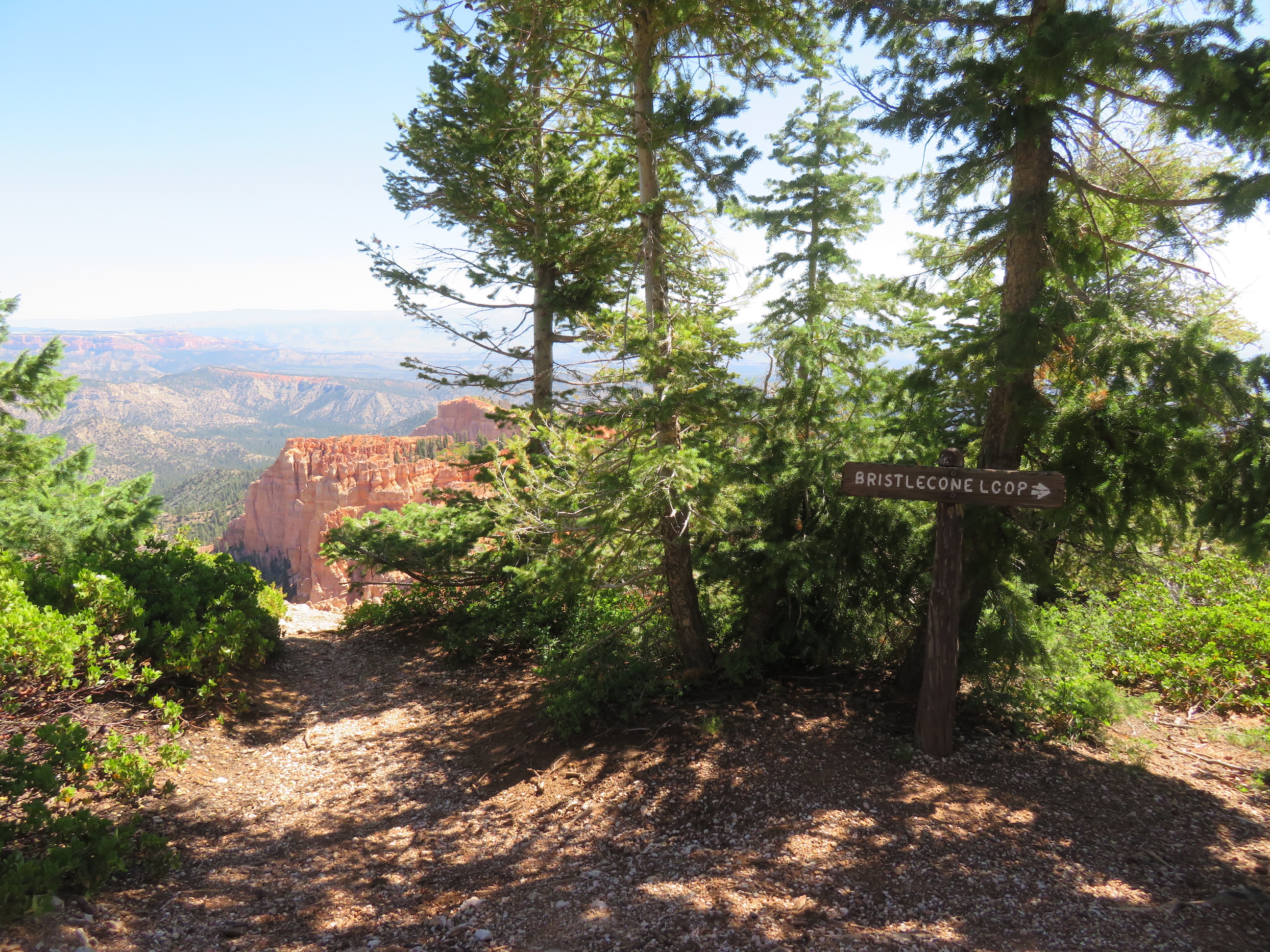 Korte tijd later rijden we dan Bryce Canyon binnen en dat park is veel groener dan de vorige ( waar er vooral rotsformaties en woestijn waren ). We nemen de Scenic Road helemaal tot het einde van de vallei, naar Rainbow Point, de verste van de verschillende ‘Viewpoints’ op deze RimRoad van Bryce. We rijden deze keer eens niet met gesloten ramen en airco, maar gewoon met het dak en de raampjes open, zalig eens een keertje ‘gewone’ temperaturen ( het zou nog steeds 30gr. worden, maar dat is al een heel verschil tegen de 40 van de vorige dagen )