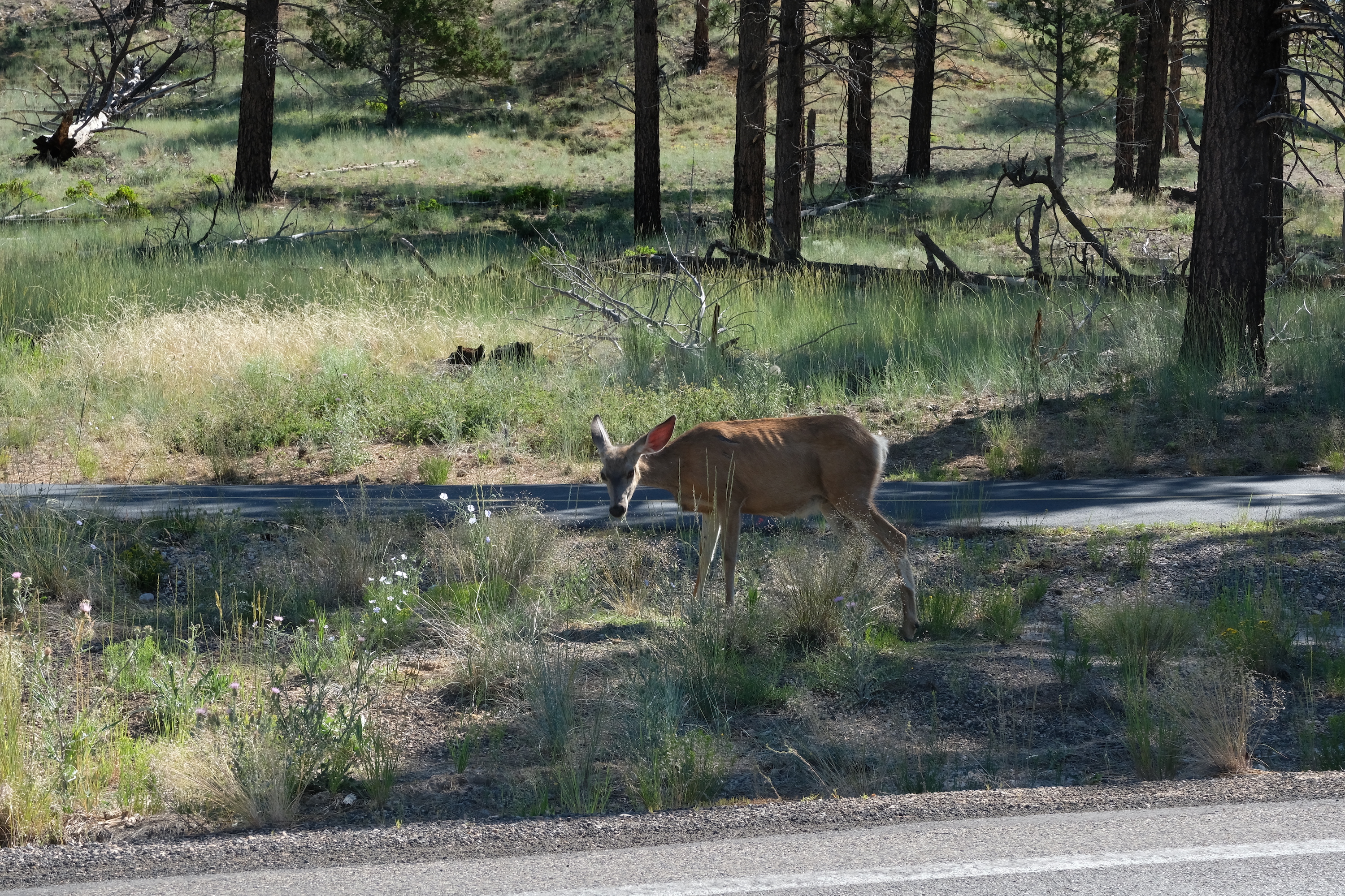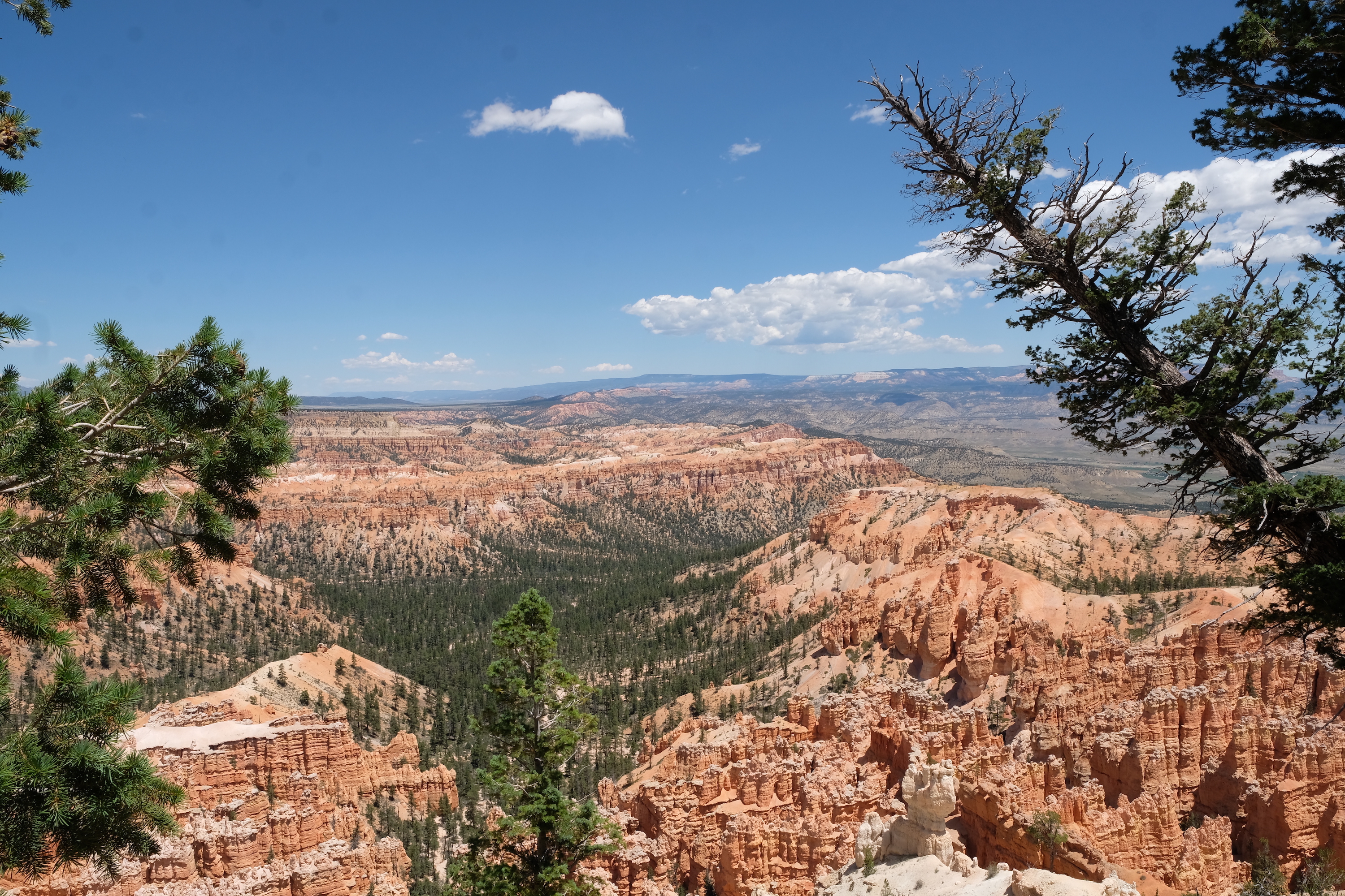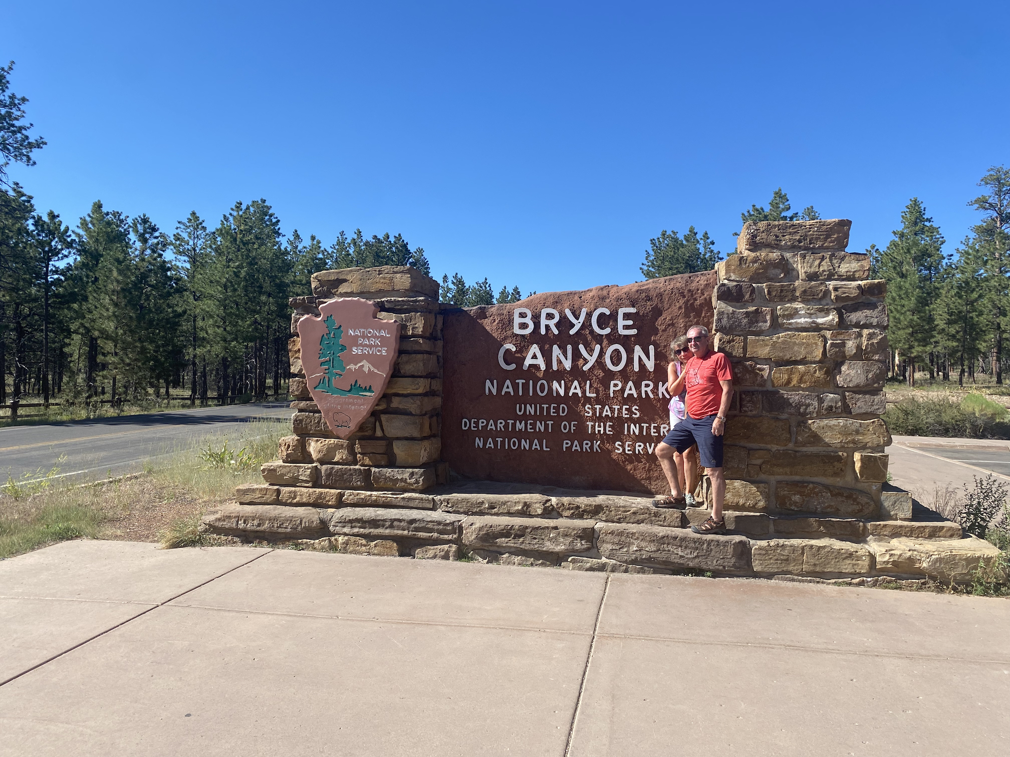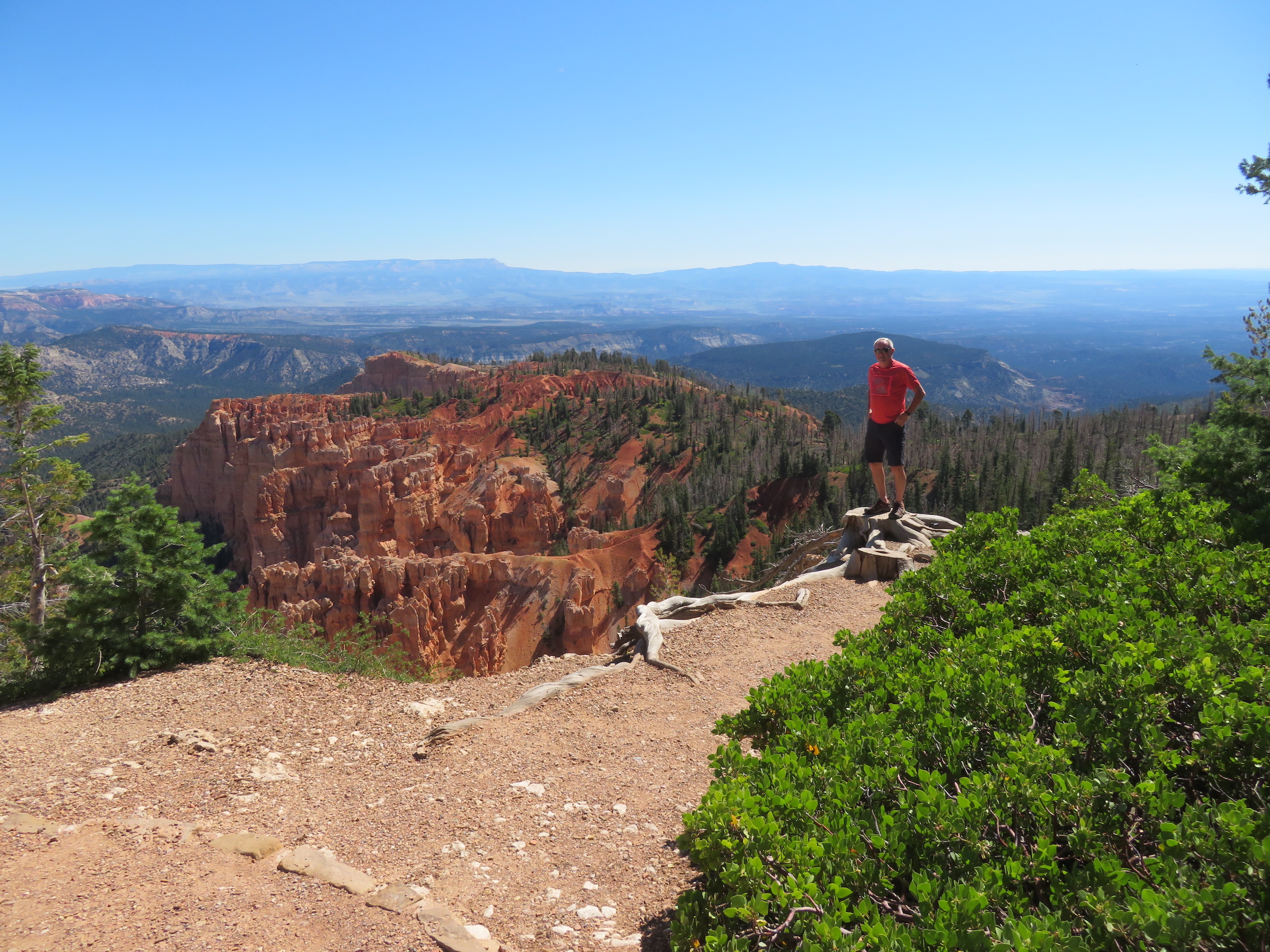 Korte tijd later rijden we dan Bryce Canyon binnen en dat park is veel groener dan de vorige ( waar er vooral rotsformaties en woestijn waren ). We nemen de Scenic Road helemaal tot het einde van de vallei, naar Rainbow Point, de verste van de verschillende ‘Viewpoints’ op deze RimRoad van Bryce. We rijden deze keer eens niet met gesloten ramen en airco, maar gewoon met het dak en de raampjes open, zalig eens een keertje ‘gewone’ temperaturen ( het zou nog steeds 30gr. worden, maar dat is al een heel verschil tegen de 40 van de vorige dagen )