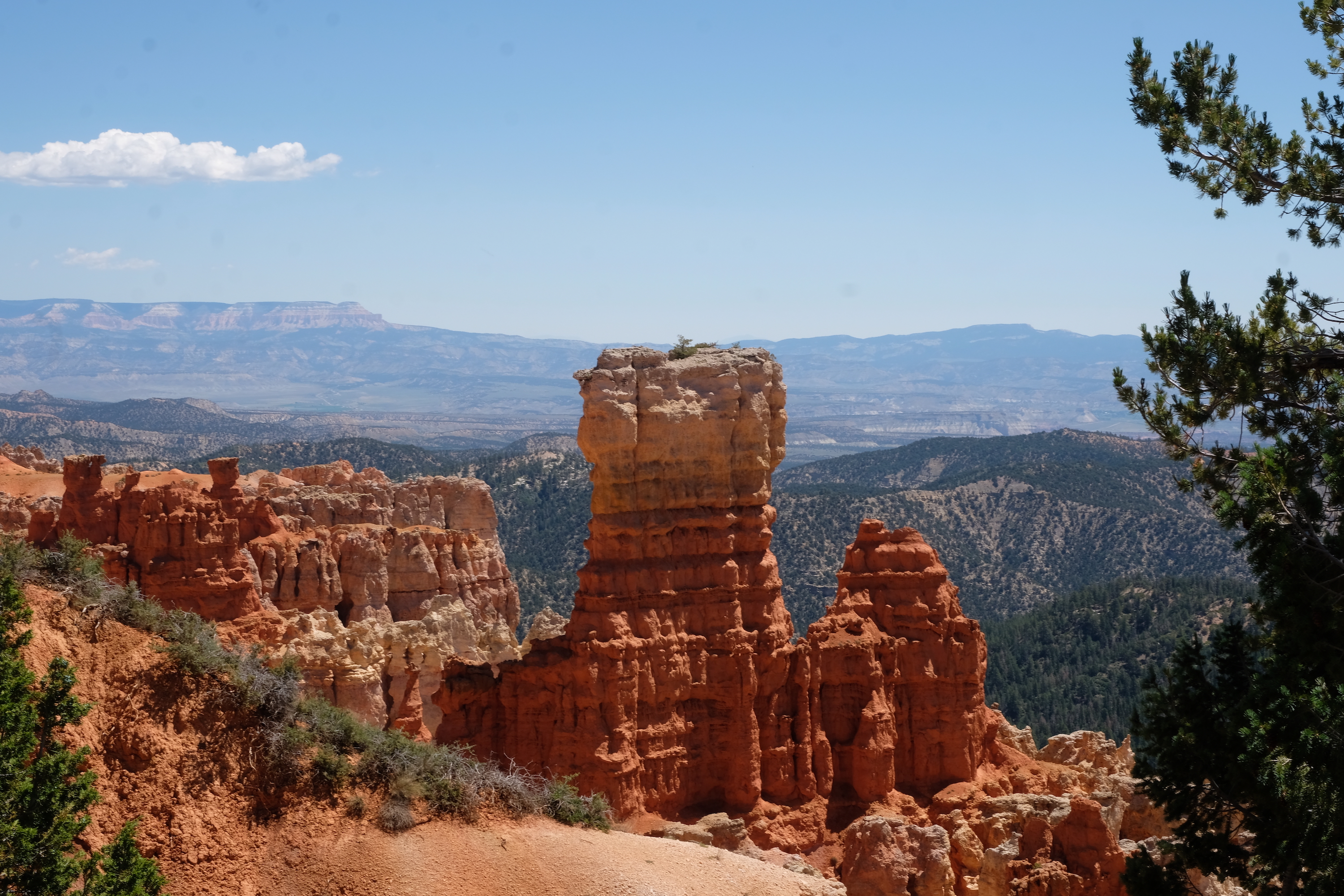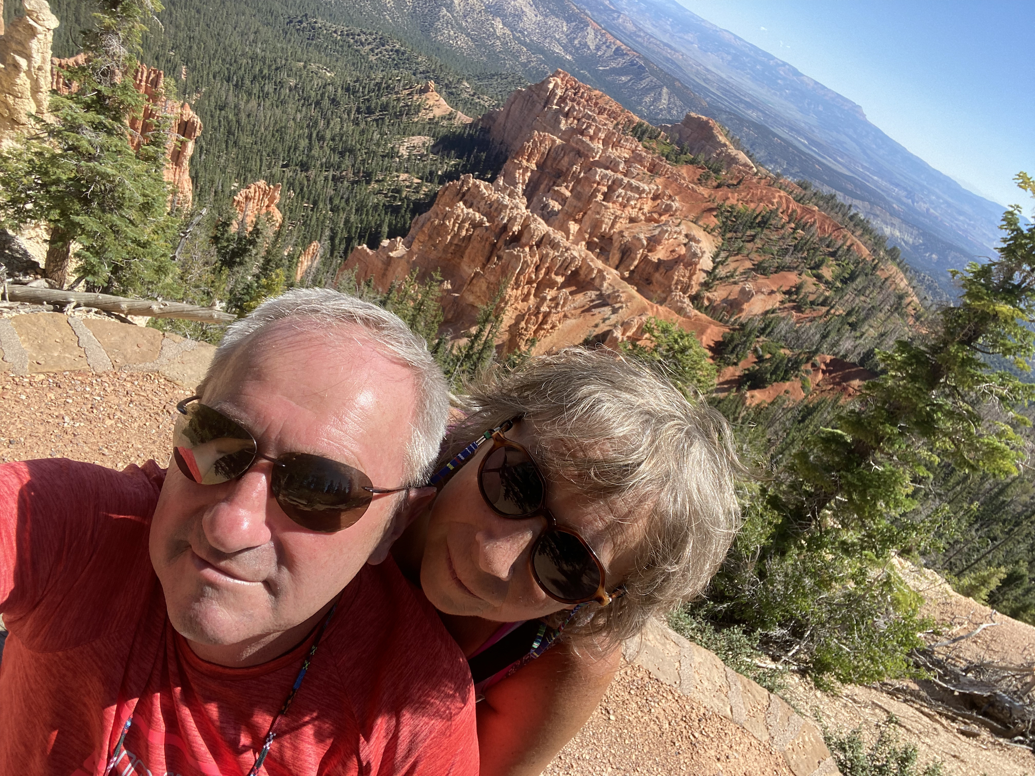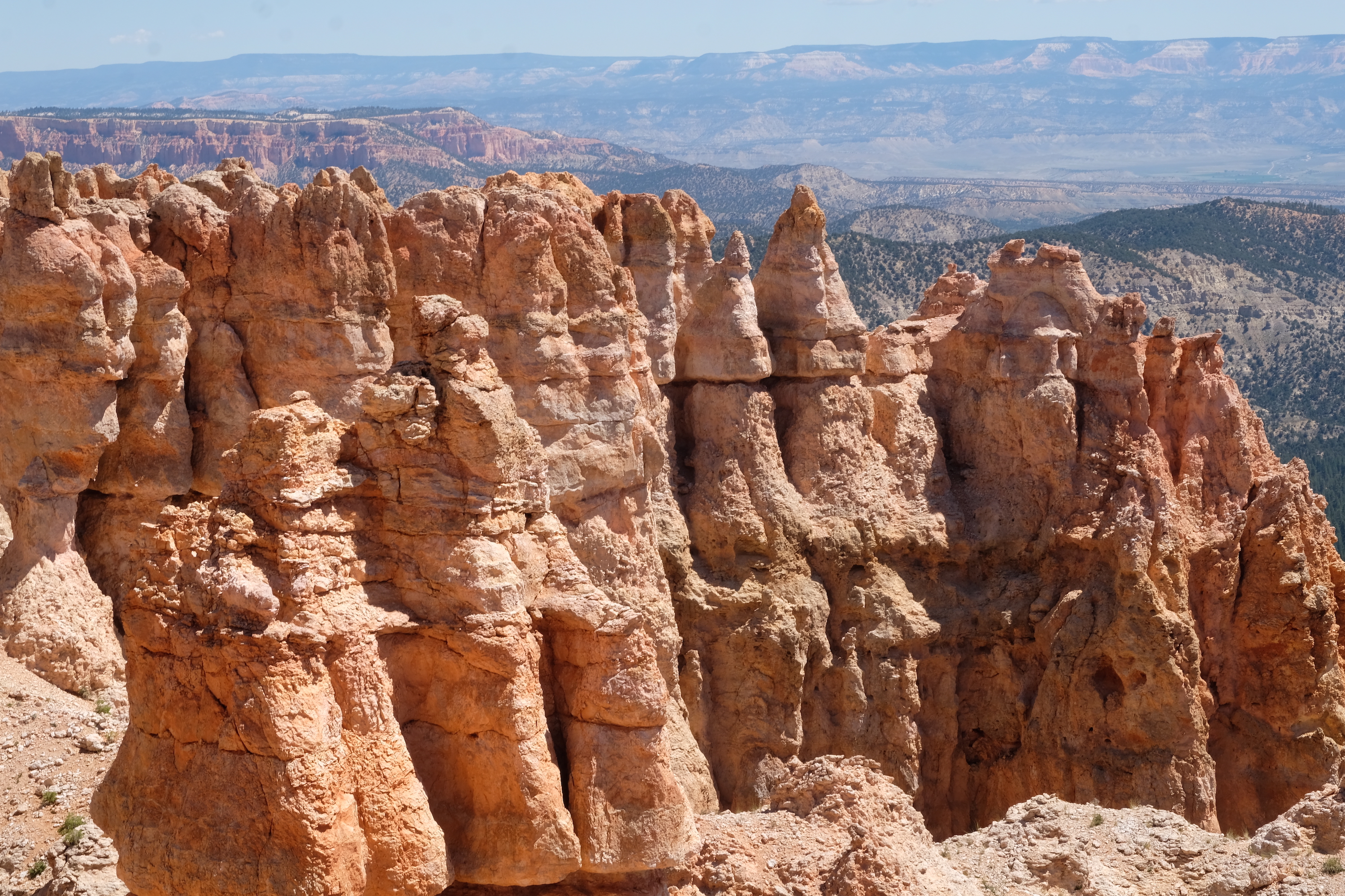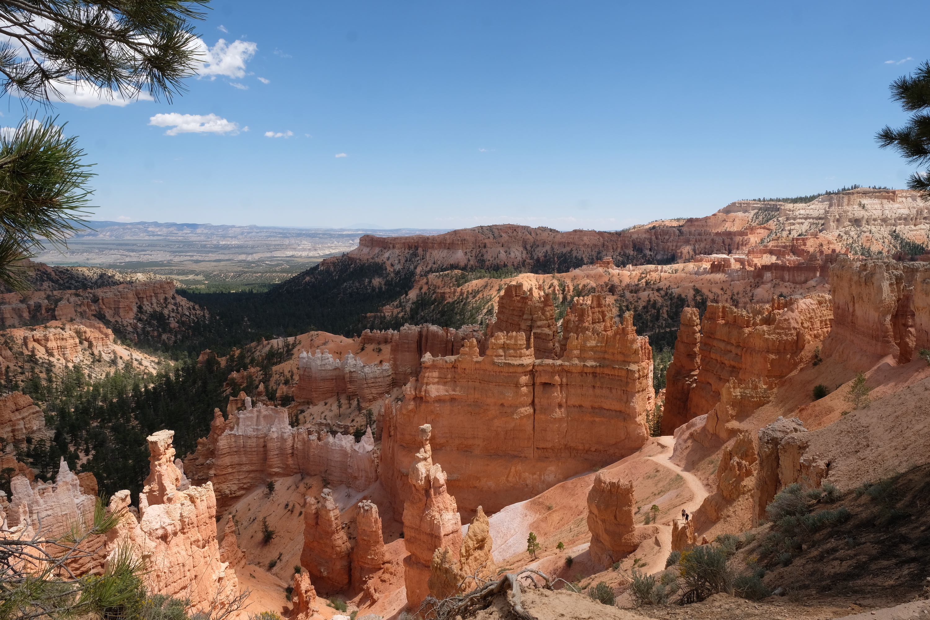 Korte tijd later rijden we dan Bryce Canyon binnen en dat park is veel groener dan de vorige ( waar er vooral rotsformaties en woestijn waren ). We nemen de Scenic Road helemaal tot het einde van de vallei, naar Rainbow Point, de verste van de verschillende ‘Viewpoints’ op deze RimRoad van Bryce. We rijden deze keer eens niet met gesloten ramen en airco, maar gewoon met het dak en de raampjes open, zalig eens een keertje ‘gewone’ temperaturen ( het zou nog steeds 30gr. worden, maar dat is al een heel verschil tegen de 40 van de vorige dagen )