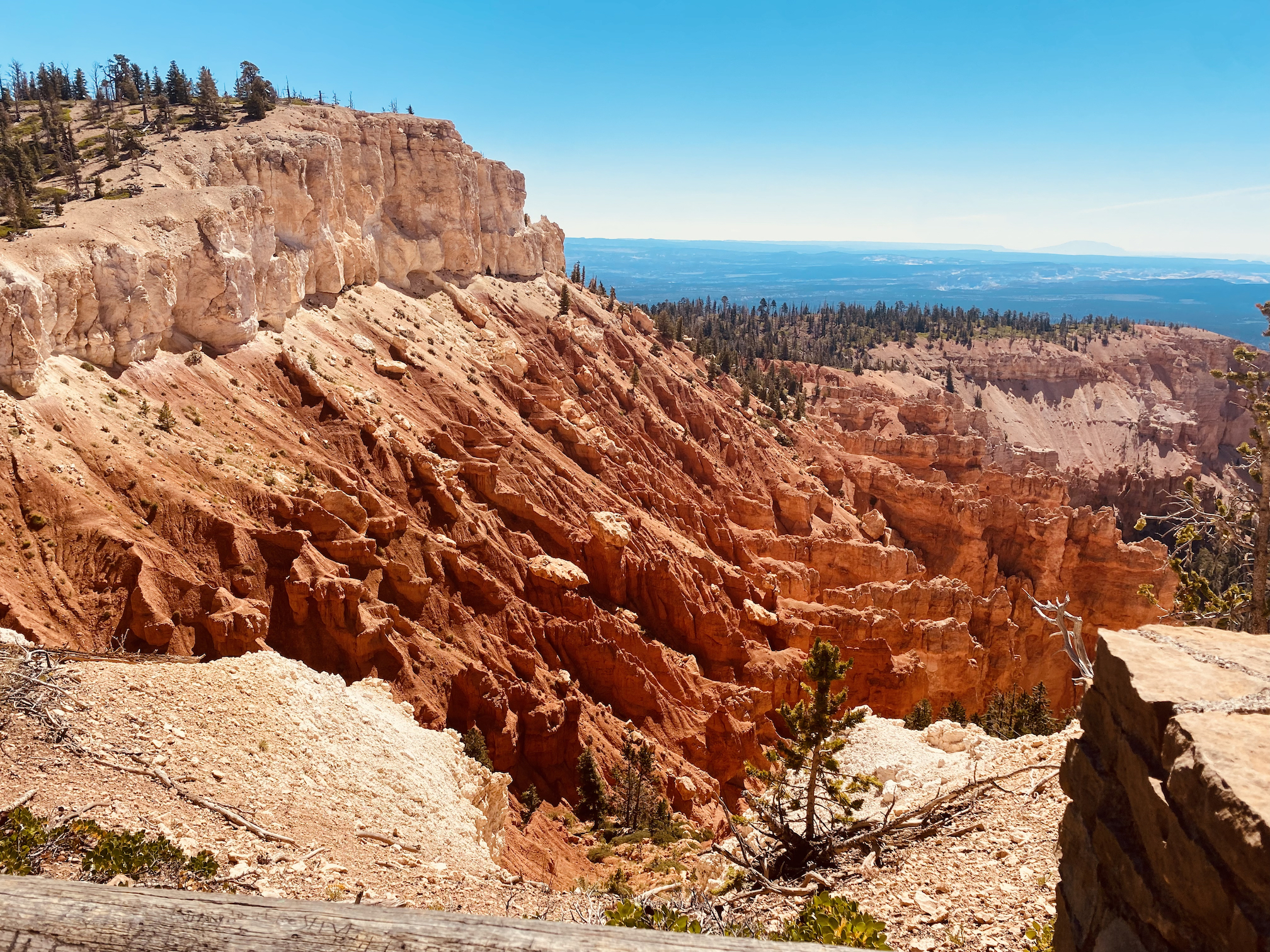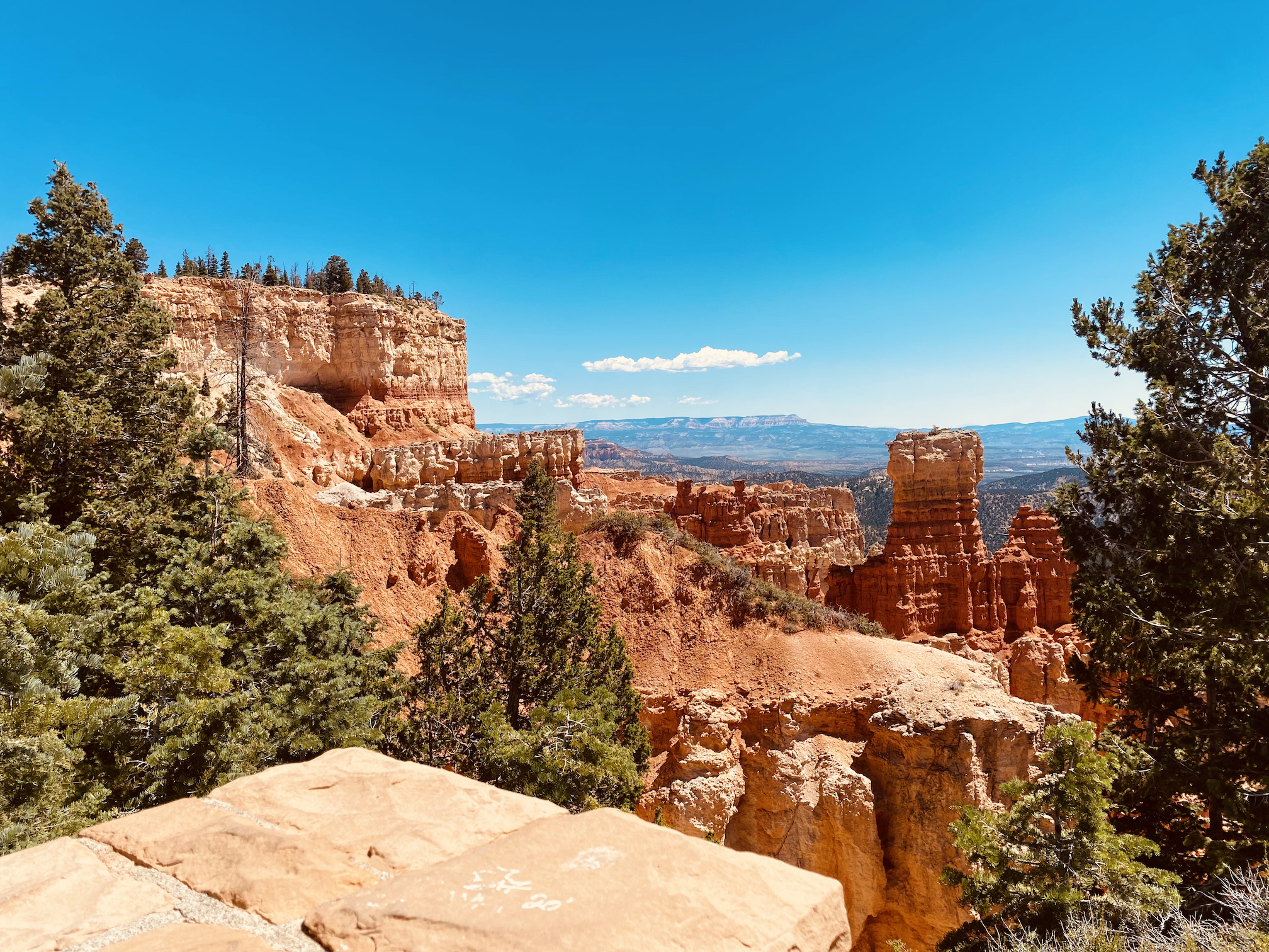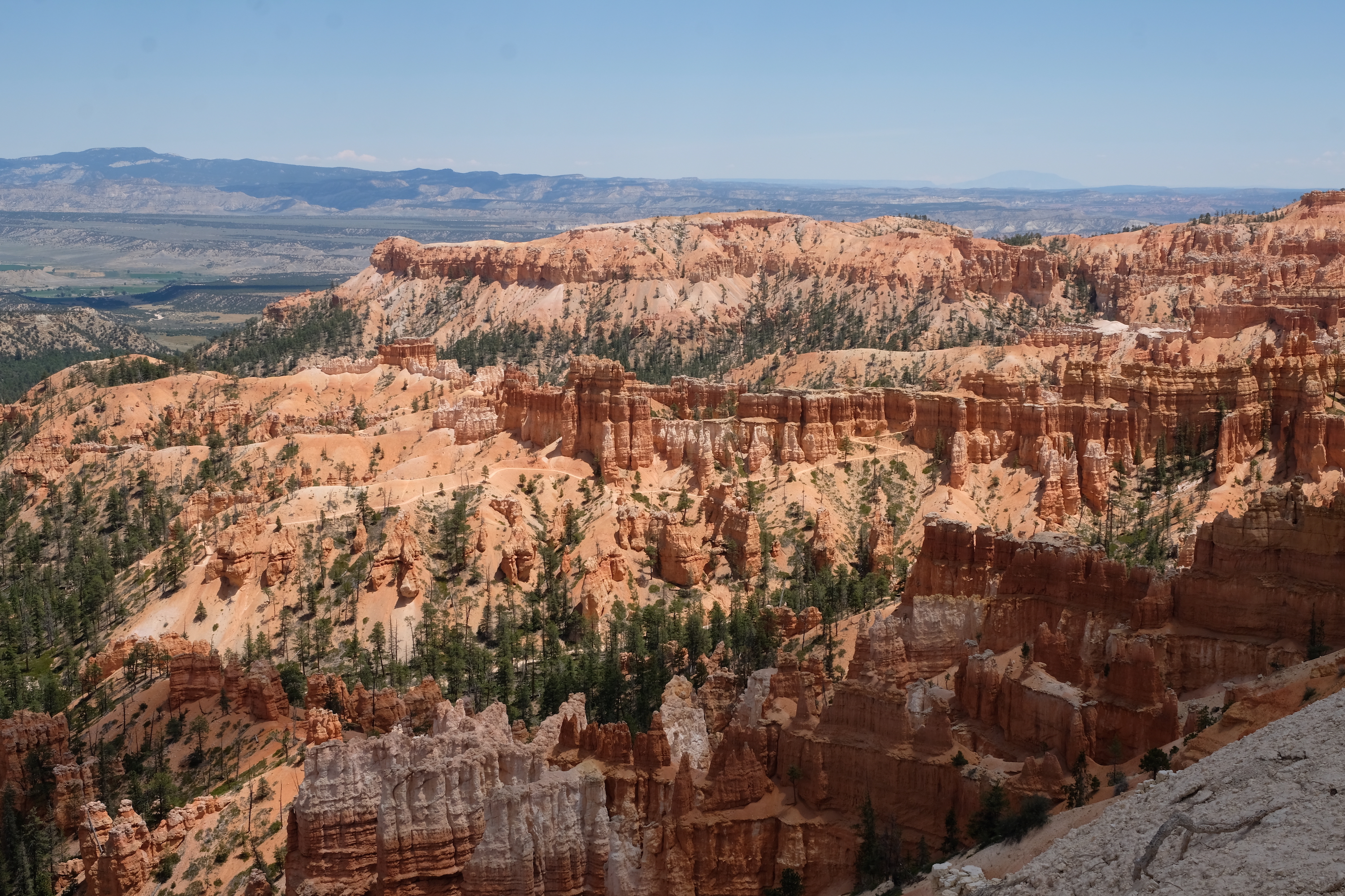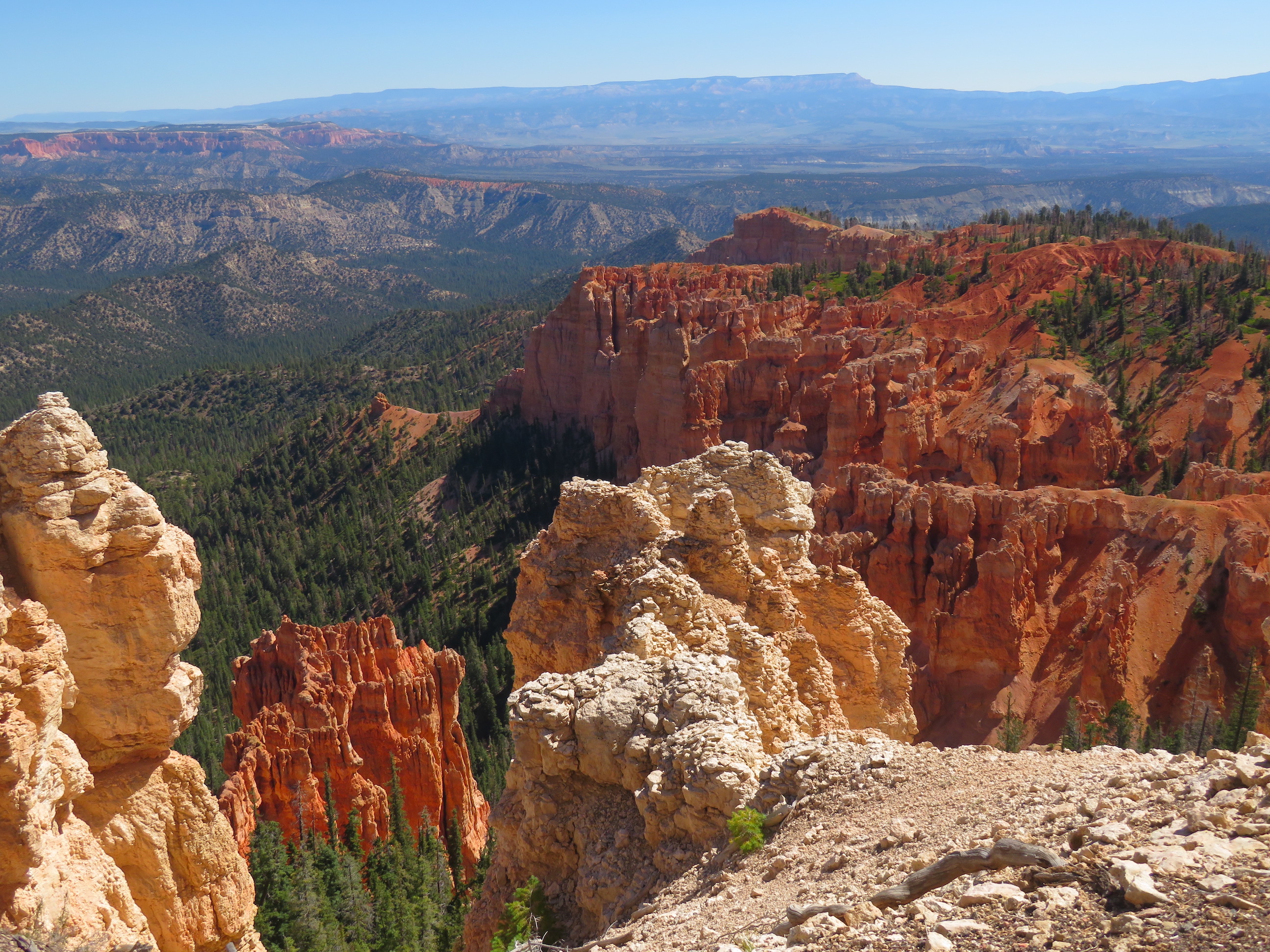 Korte tijd later rijden we dan Bryce Canyon binnen en dat park is veel groener dan de vorige ( waar er vooral rotsformaties en woestijn waren ). We nemen de Scenic Road helemaal tot het einde van de vallei, naar Rainbow Point, de verste van de verschillende ‘Viewpoints’ op deze RimRoad van Bryce. We rijden deze keer eens niet met gesloten ramen en airco, maar gewoon met het dak en de raampjes open, zalig eens een keertje ‘gewone’ temperaturen ( het zou nog steeds 30gr. worden, maar dat is al een heel verschil tegen de 40 van de vorige dagen )