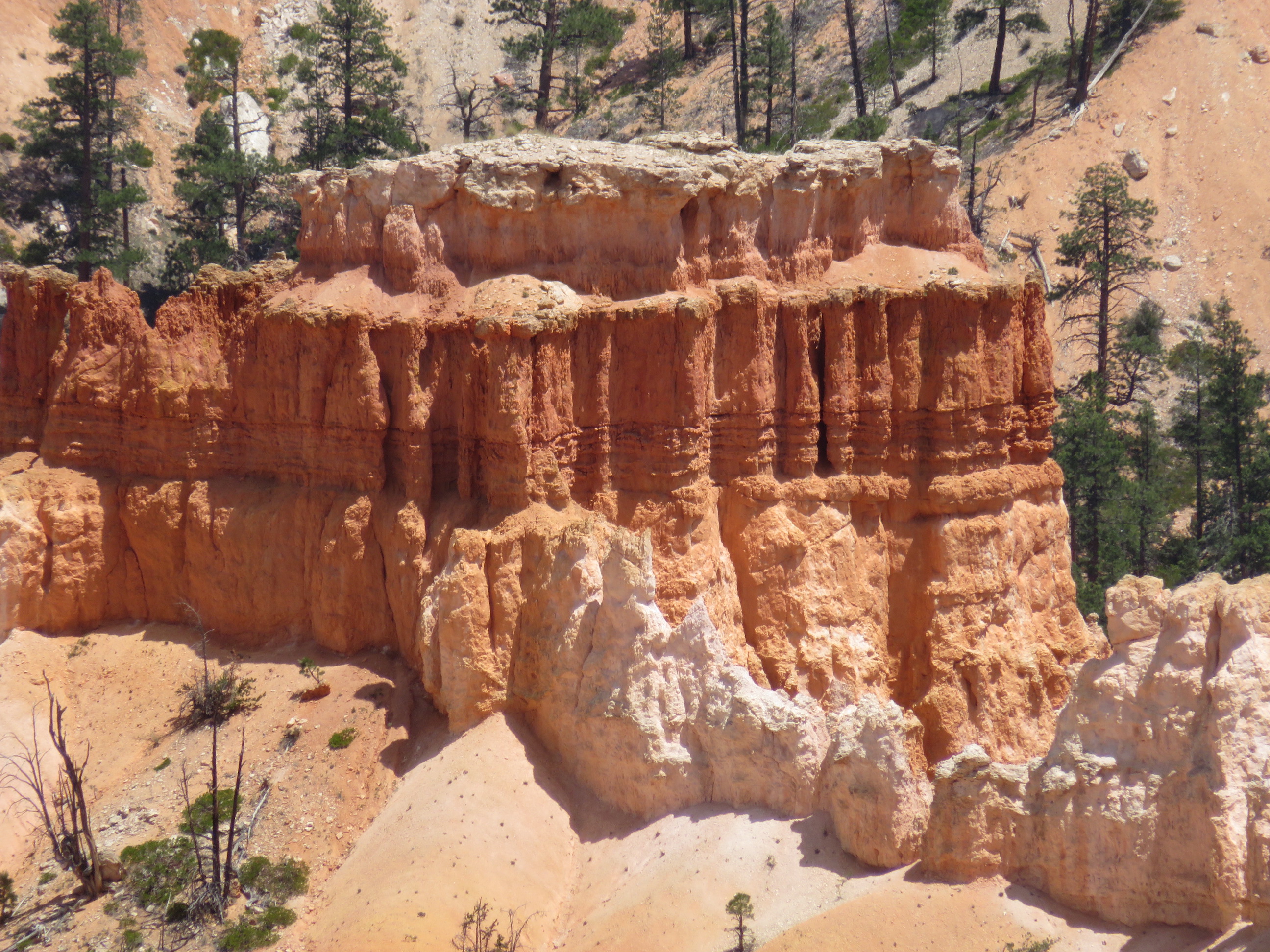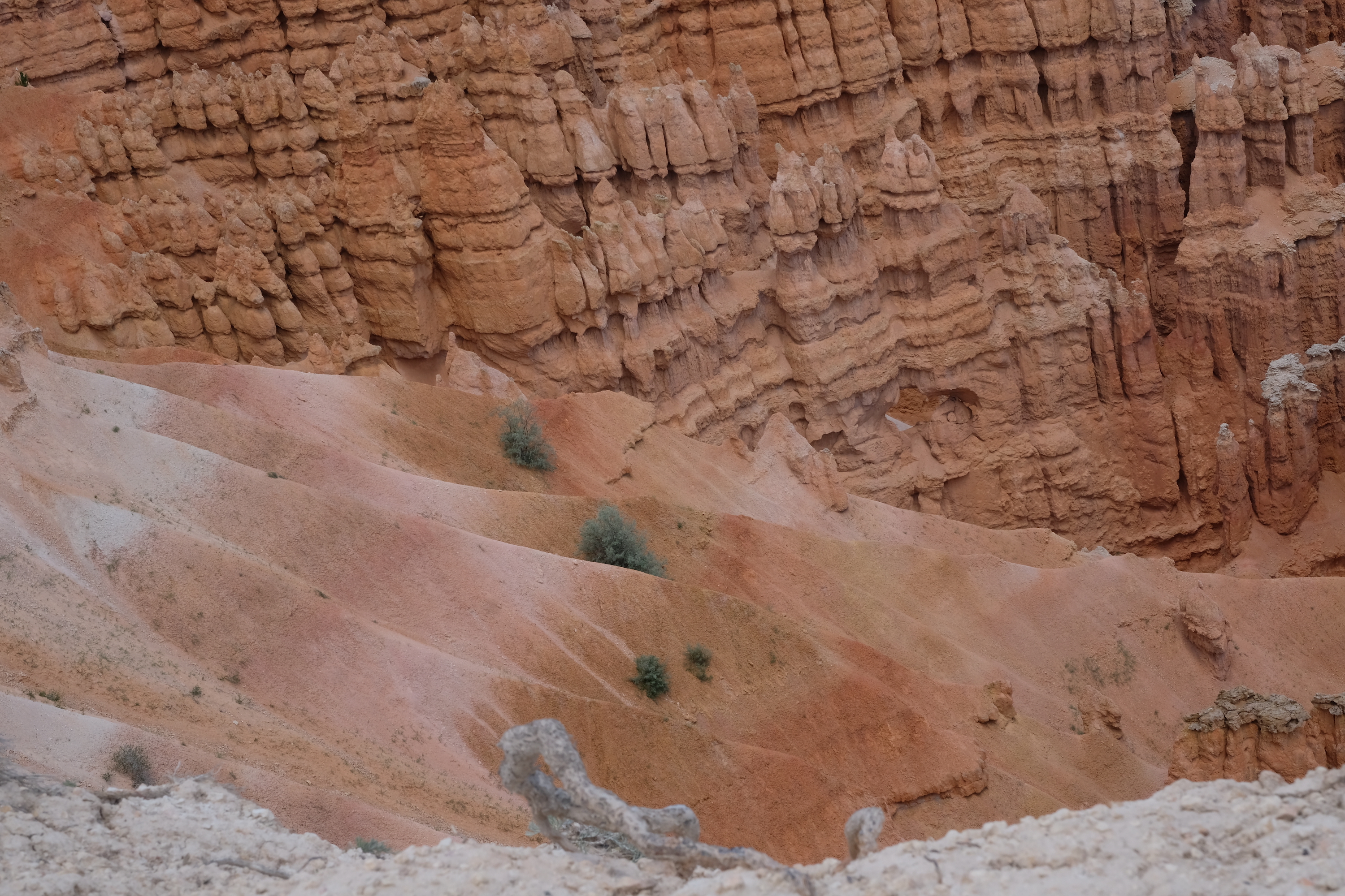 Bij dat eerste viewpoint kijken we met open mond naar de prachtige natuur die we daar te zien krijgen … je kan het eigenlijk moeilijk verwoorden, maar Bryce Canyon is vooral bekend om zijn vele ‘hoodoos’, een soort rotspilaren in allerlei maten die in kleur overgaan van oranjerood tot bovenaan bijna helemaal wit … en ze staan allemaal heel dicht op elkaar, het is een overweldigend zicht, schitterend gewoon ! Bij elke verdere stop is het zicht en de hoodoo formaties steeds verschillend, je valt er van de ene verbazing in de andere, magnifiek gewoon, de camera’s draaien overuren …