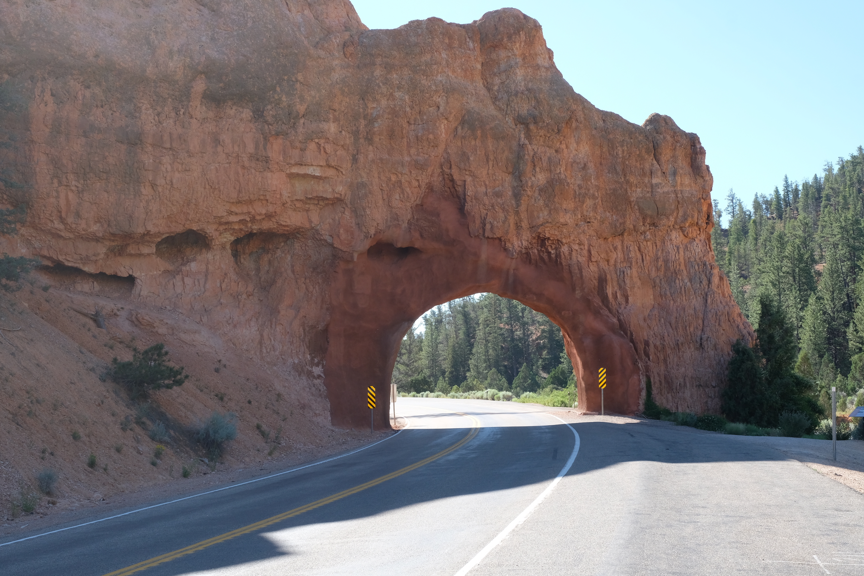 Als de weersvoorspellingen kloppen, wordt het vandaag – eindelijk – toch een beetje ‘normaler’ qua temperaturen, dus ideaal om Bryce Canyon te gaan ontdekken. Na het ontbijt ( deze keer een hotel mét ontbijt ! ) vertrekken we richting Bryce, maar allereerst stoppen we nog in de Red Canyon. Die heeft zijn naam niet gestolen, overal rondom mooie rode rotsformaties in de raarste vormen, zeker een (foto)stop meer dan waard. Maar even plots als die ‘Red Rocks’ opdoemden zijn ze weer verdwenen … toch wel raar als je daar doorheen rijdt, van de ene seconde op de andere zijn die opvallende rotsen verdwenen en kom je weer in een landschap met velden en weiden terecht…