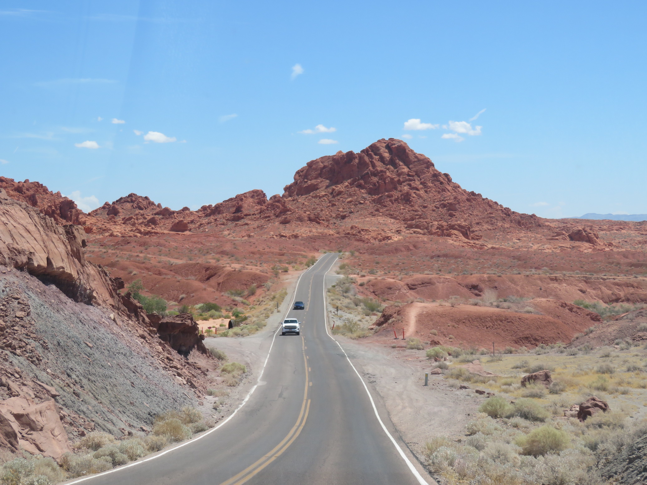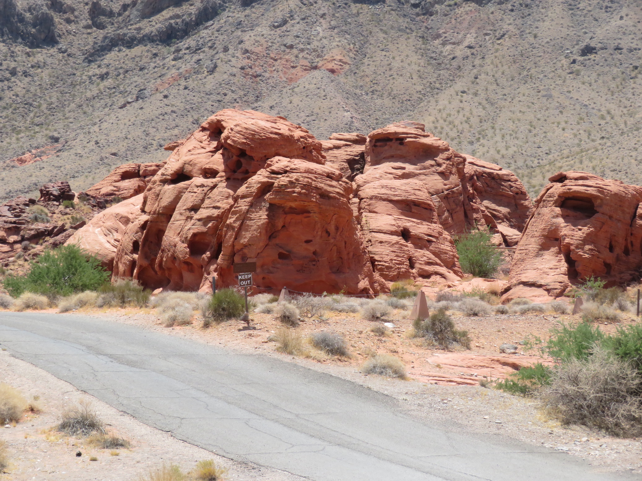 Da’s wel jammer, want het eerste stukje was absoluut de moeite waard … Niks aan te doen echter, dus we keren terug en rijden verder richting Valley of Fire, ook weer een National Park maar met meer vuurrode rotsen … en ontzettend desolaat en héét … er staan zelfs borden om de waarschuwen voor de hitte met de woorden ‘ Extreme Heat – you might die ‘ … Best wel een beetje grappig, maar wel heel duidelijk, niet mis te verstaan dus … 😉