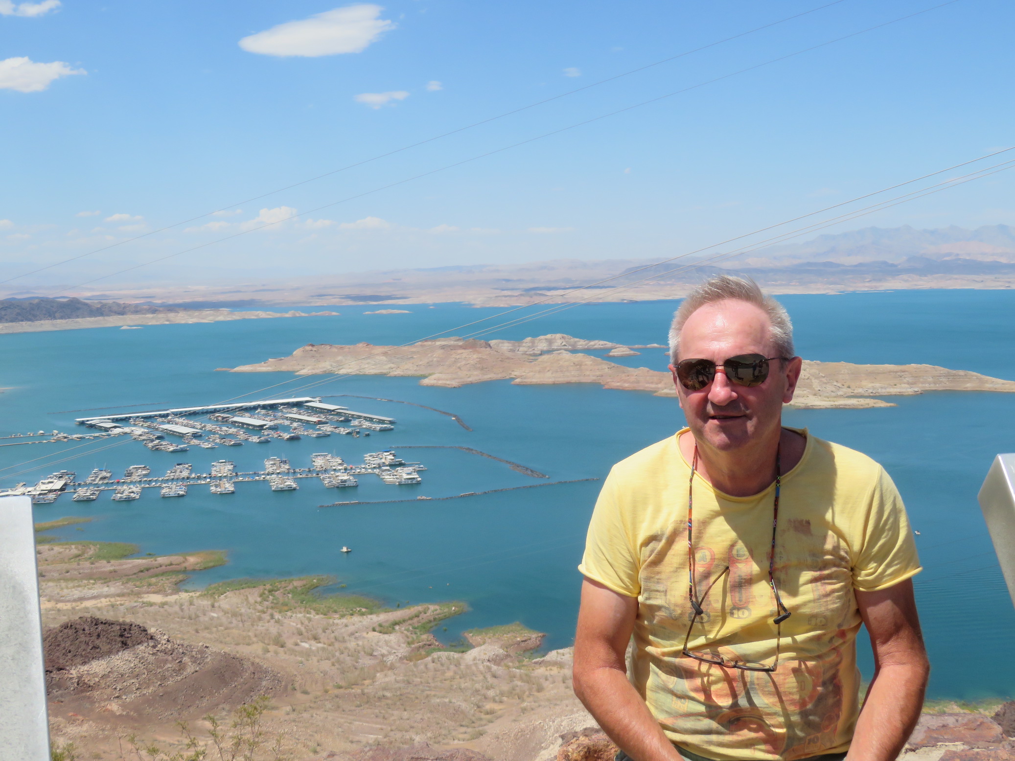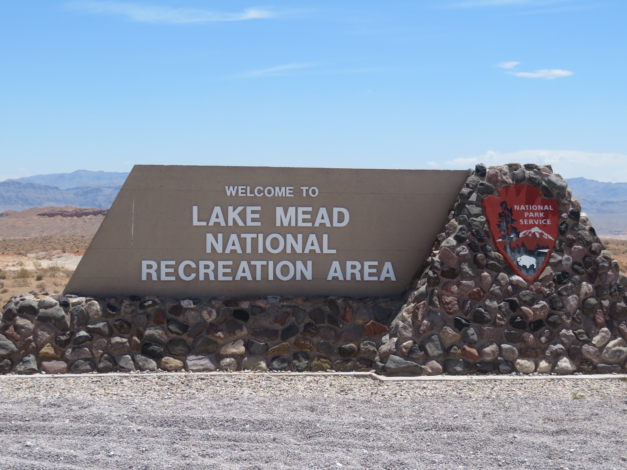 Het park zelf is niet zo groot, we zijn er dus snel door, en vervolgen dan onze weg naar Lake Mead Recreation Area. Lake Mead is een bizar natuurfenomeen, een gigantisch groot prachtig blauw meer in het midden van de woestijn … We moeten heel wat miles door de bloedhete ‘desert’ rijden, maar uiteindelijk wordt ons geduld beloond, het meer schittert in al zijn pracht in deze verlaten plek. Er blijkt zelfs een soort haventje te zijn waar je boten kan huren of zelfs kopen … en er is een camping, zonder enige beschutting in deze hete zandbak, niet te vatten eigenlijk.