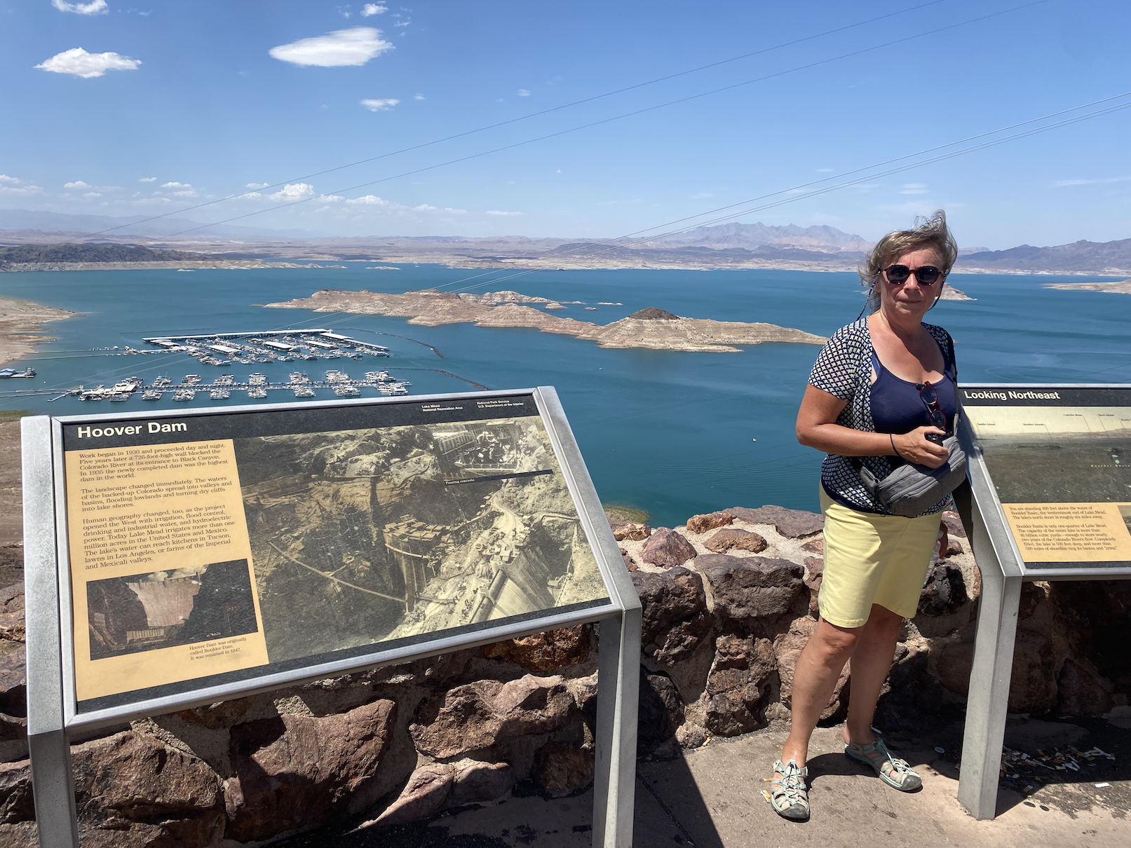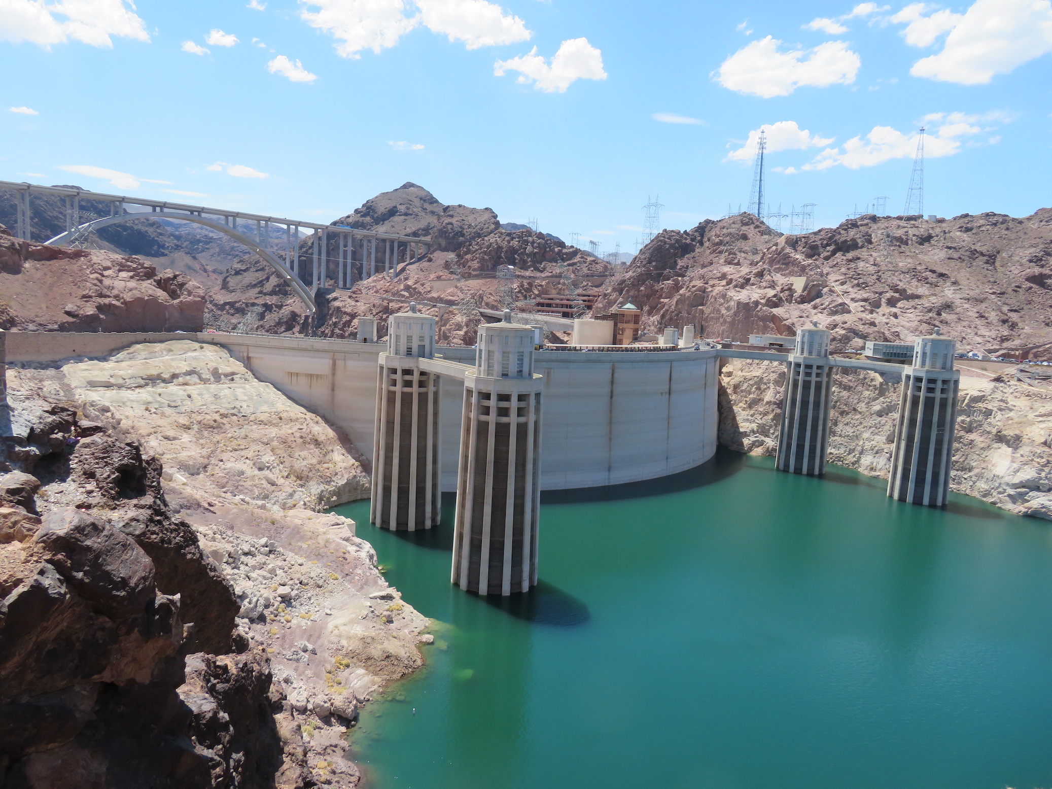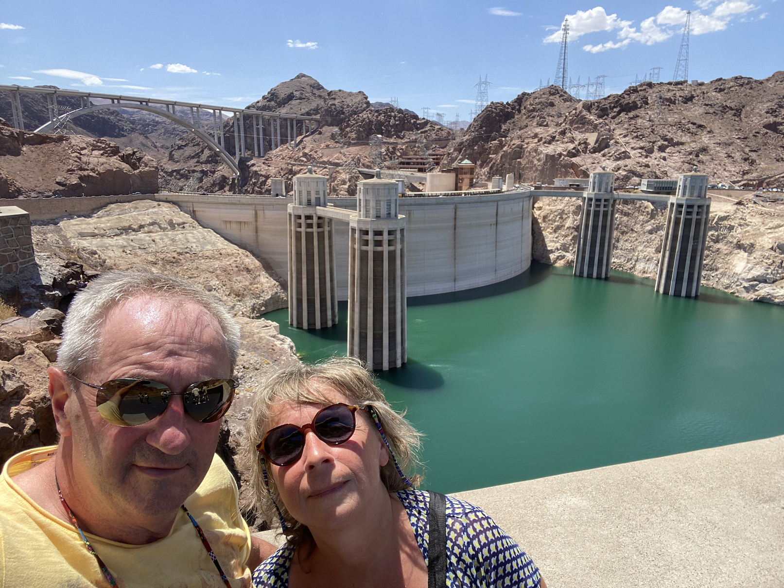 Maar het belangrijkste aan Lake Mead is natuurlijk de bekende Hooverdam ( de stuwdam die in vele Hollywoodfilms door slechterikken of natuurrampen geviseerd of zelfs vernietigd wordt ). Dat is een gigantisch bouwwerk, gebouwd in de jaren na WO I ( om de werkgelegenheid weer aan te zwengelen, zo leren we ) en was voor die tijd een echt huzarenstukje. Je kan er zo naartoe en zelfs overheen rijden, maar onderweg moet elke auto wel een ‘Security Check’ ondergaan. Dat houdt in dat je alle raampjes moet openzetten wanneer je naar de politiemannen rijdt die de toegang bewaken zodat ze in de auto kunnen kijken. In ons geval ging dat vrij vlot, beide mannen wierpen snel een blik in de auto, vroegen ons of we toevallig wapens bij hadden ( 🙂 ) en na ons negatief antwoord mochten we verder … we zullen er betrouwbaar uitgezien hebben 😉