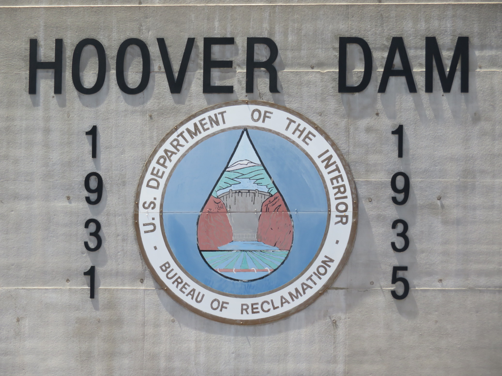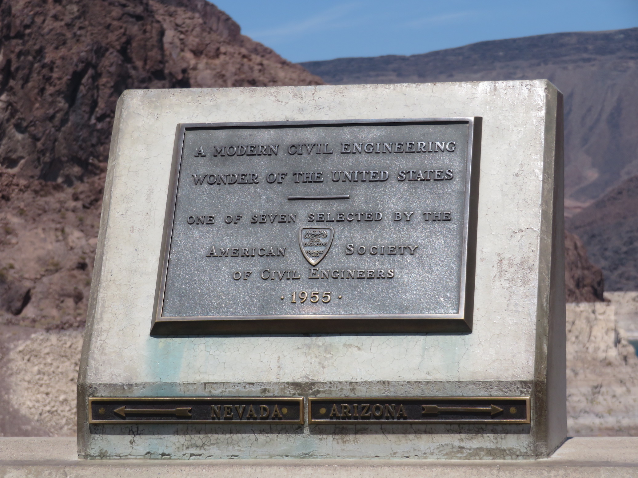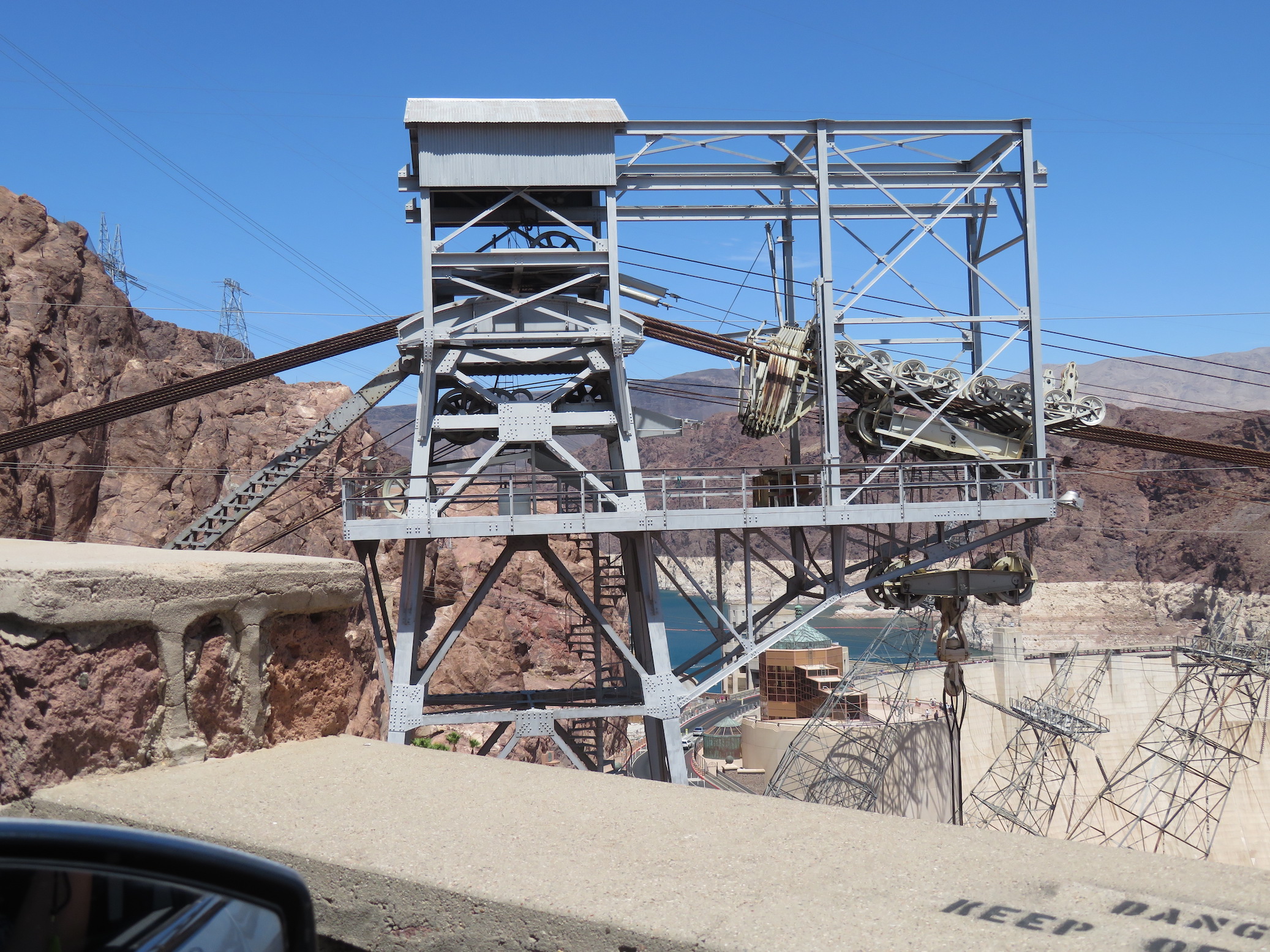 Maar het belangrijkste aan Lake Mead is natuurlijk de bekende Hooverdam ( de stuwdam die in vele Hollywoodfilms door slechterikken of natuurrampen geviseerd of zelfs vernietigd wordt ). Dat is een gigantisch bouwwerk, gebouwd in de jaren na WO I ( om de werkgelegenheid weer aan te zwengelen, zo leren we ) en was voor die tijd een echt huzarenstukje. Je kan er zo naartoe en zelfs overheen rijden, maar onderweg moet elke auto wel een ‘Security Check’ ondergaan. Dat houdt in dat je alle raampjes moet openzetten wanneer je naar de politiemannen rijdt die de toegang bewaken zodat ze in de auto kunnen kijken. In ons geval ging dat vrij vlot, beide mannen wierpen snel een blik in de auto, vroegen ons of we toevallig wapens bij hadden ( 🙂 ) en na ons negatief antwoord mochten we verder … we zullen er betrouwbaar uitgezien hebben 😉