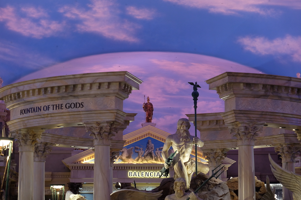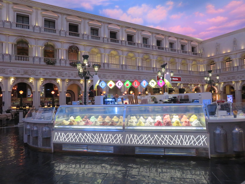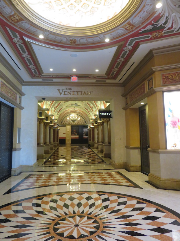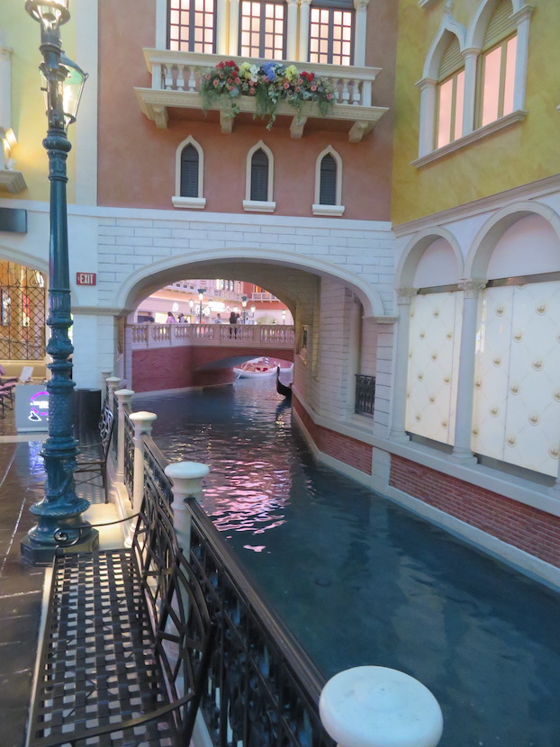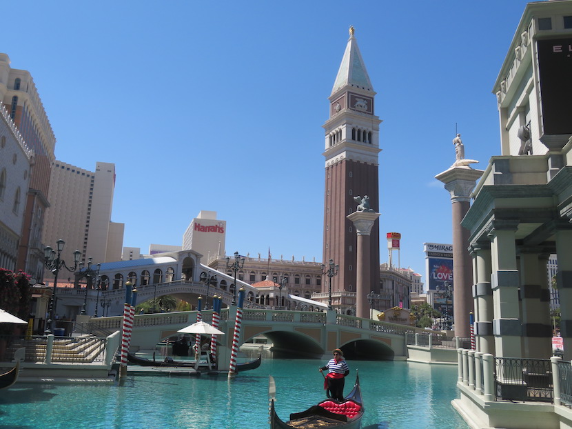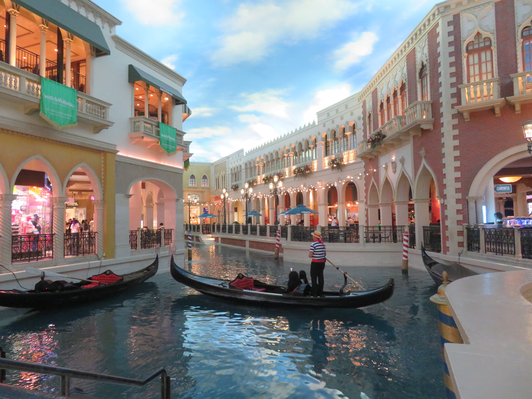 We beginnen in The Venetian, die helemaal in ( logisch 🙂 ) Venetiaanse stijl is gemaakt, er is zelfs binnen in het hoteldomein een kleine replica van het Canal Grande gemaakt waar ook wel degelijk gondels op varen. De ‘gebouwen’ naast het kanaal zijn ook helemaal in de stijl van de Ventiaanse Palazzo’s en zelfs het plafond is zo beschilderd dat het lijkt alsof je onder een stralend blauwe hemel loopt met enkele onschuldige schapenwolkjes … af en toe worden die wolkjes zelfs lichtjes rozerood, net alsof er een prachtige zonsondergang aankomt … ongelooflijk toch.