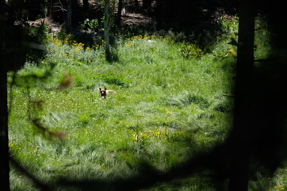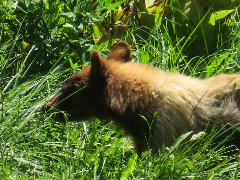 Wanneer we de afslag terug nemen die we voorheen gemist hadden, zien we enkele geparkeerde wagens aan de kant van de weg en een aantal mensen met fototoestellen die allemaal in dezelfde richting kijken. Van onze reis naar Canada weten we nog : er is een dier gespot ! En inderdaad, in de verte in het midden van de wei zit een ‘Black Bear(tje)’ rustig rond te wandelen op zoek naar lekkere hapjes. Het is nog een klein dier ( geen baby ), en hoewel dus een Black Bear is de kleur van zijn of haar vacht eerder blond te noemen … maar blijkbaar is dat normaal een Black Bear kan variëren in vachtkleur van heel licht tot heel donker, en deze is dus een blond exemplaar 😉 We proberen er een paar foto’s van te maken, maar hij of zij zit toch vrij ver weg en dat is misschien maar goed ook …