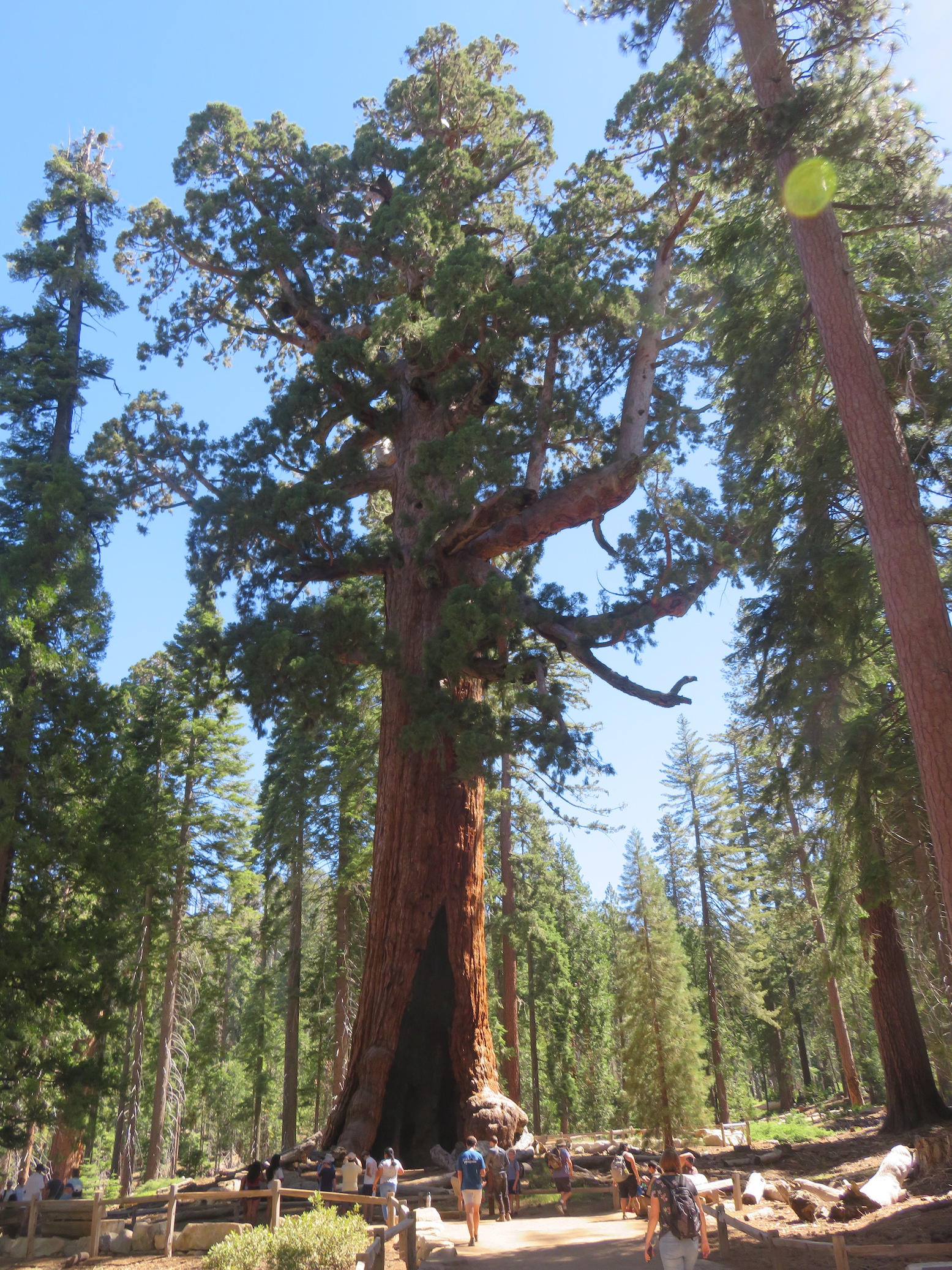 Deze morgen gaan we als eerste naar Mariposa Grove, een deel van het park waar zich vooral de Giant Sequoia’s en Red Cedars bevinden, de gigantische bomen die we ook tijdens onze trip naar British Columbia al eens konden bewonderen. Daar aangekomen laten we ons autootje op de parking achter en nemen we de shuttlebus naar de Grove zelf ( verplicht, enkel de bus mag daar rijden ) Zodra we van de bus stappen, horen we een mevrouw Ranger al luid roepen dat ze met haar tour gaat vertrekken en dat je gerust meekan als je dat wil ( zonder gids kan ook ) We willen uiteraard wel wat extra uitleg en sluiten ons in eerste instantie dan ook aan. Ze is erg goed ter taal en krijgt direct haar ‘publiek’ mee met hare grappige uitspraken en dito mimiek, dat begint dus al goed. Helaas blijft ze hééééél lang doorgaan met grapjes, opwarming via stretching en nog meer van dat soort entertainment … na een kwartiertje geven we het op en gaan we dan maar zelf op wandel.