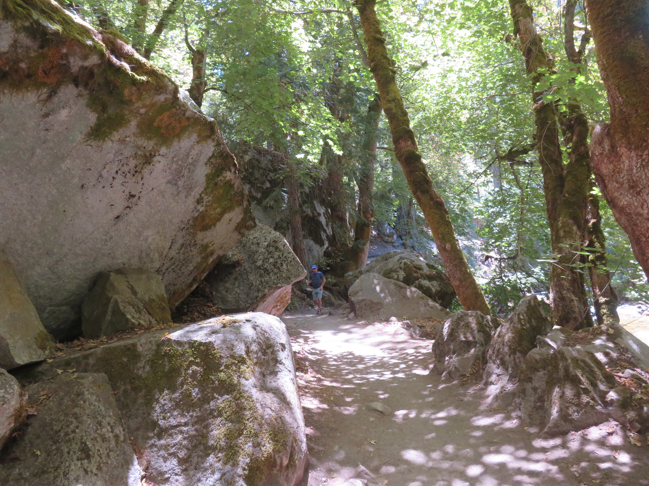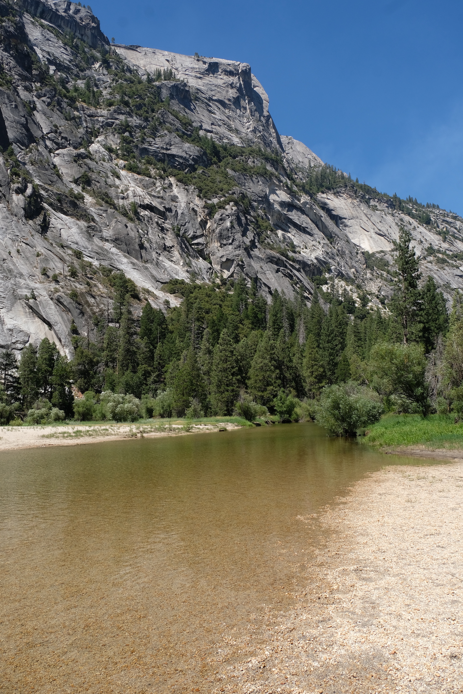 We nemen afscheid van onze reuzenvrienden en gaan weer verder richting Mirror Lake in het hart van Yosemite voor een 2de wandeling van opnieuw ong. 2 uurtjes. De trail ernaartoe wordt omschreven als ‘easy’ en op zich is die ook niet echt zwaar, maar wel ontzettend stoffig en eigenlijk soms best slippery met al dat fijne losse zand op de gladde stenen. We komen uiteindelijk aan bij dat Mirror Lake en hoewel wij dachten dat de naam betrekking zou hebben op weerspiegelingen van de bergen in het water, blijkt dat een misvatting te zijn. De naam MIrror verwijst er eigenlijk naar dat er 2 meertjes zijn, die je met wat goede wil spiegelbeeld zou kunnen noemen…