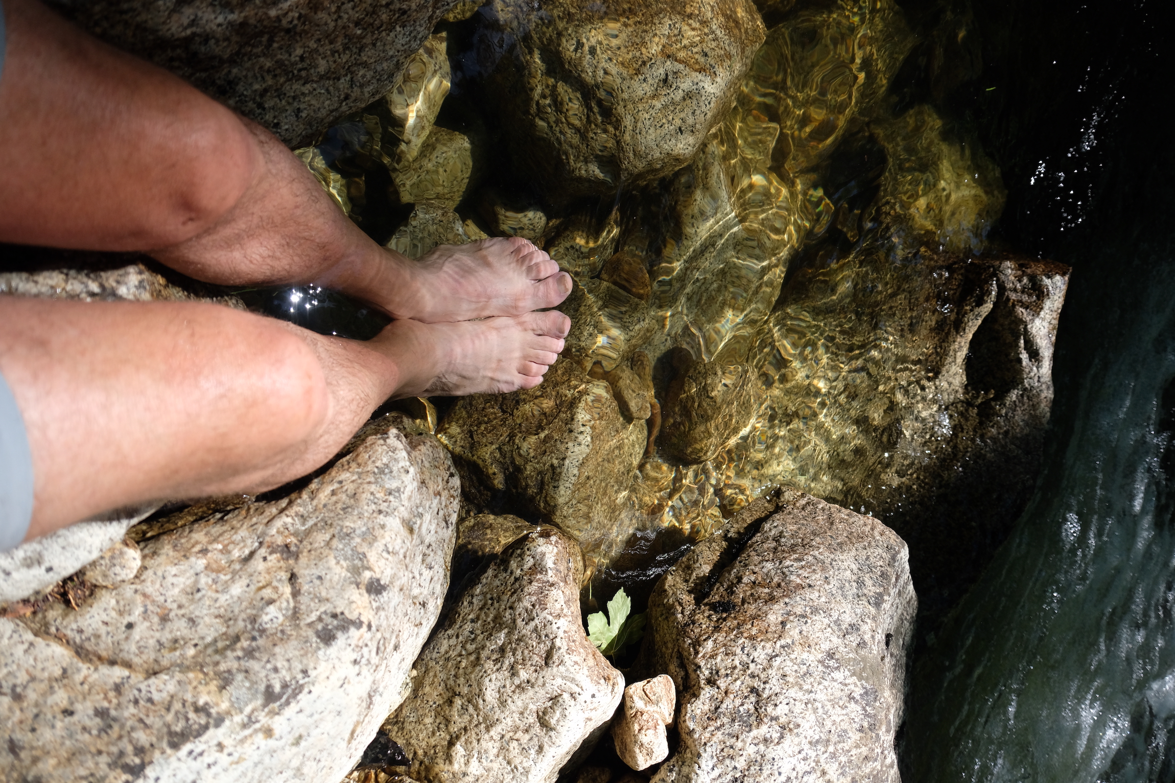 Het is er best mooi, maar ook wel ontzettend druk. Overal zie je ook mensen in het meer wandelen of zelfs dippen, begrijpelijk het is ook weer een warme dag vandaag. WIj keren een stukje op onze stappen terug om uit het gewoel te zijn en zetten ons een eindje verder met onze voetjes in de rivier, die het verlengstuk van Mirror Lake is. Zalig fris en verkwikkend, en ineens ook al het stof van voeten en benen weggespoeld in de snelstromende rivier 🙂