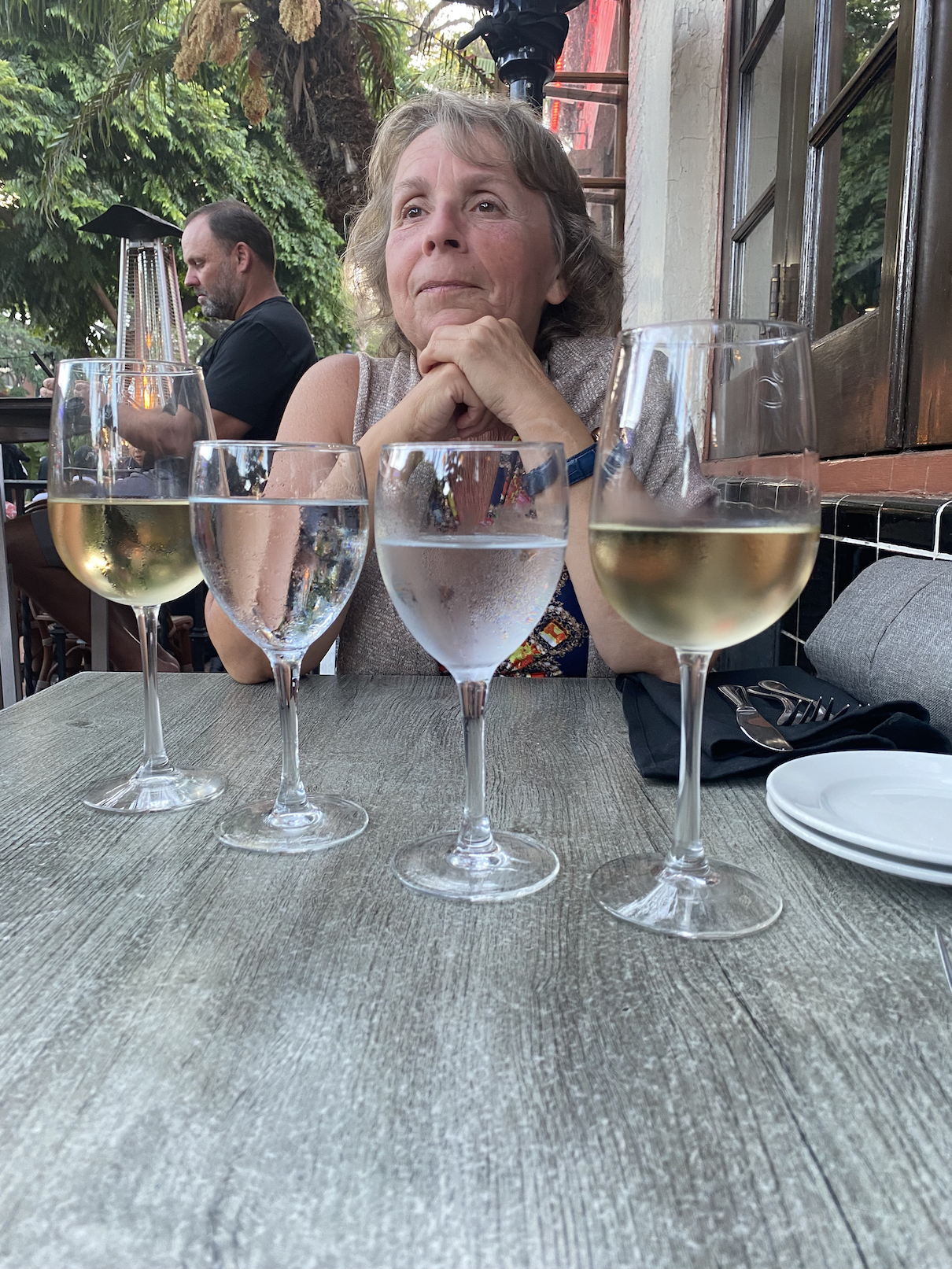 Ondertussen zijn we terug in het hotel aangekomen en beginnen we stilaan alles in orde te brengen voor het vertrek morgen, de valiezen herschikt en gewogen, en checken we ook alvast online in voor onze vlucht. We gaan ook nog even mee-aperitieven op het terras van ons hotel ( elke dag is er een – gratis ! – aperitief voorzien in de lobby en op het terras, supertof ! Tijd daarna voor een douche en dan zijn we weg naar ons restaurant. Gelukkig hadden we gereserveerd, want het is ondertussen vrij druk geworden en overal staan mensen te wachten op een plekje op één van de terrasjes. Overal lopen ook muziekgroepjes rond die op verzoek – en voor ettelijke dollars 🙂 – vlakbij je tafeltje een verzoeknummertje komen spelen. Gezellig wel, maar toch soms ook wel ontzettend luid en af en toe ook redelijk vals … hoort erbij waarschijnlijk … 🙂