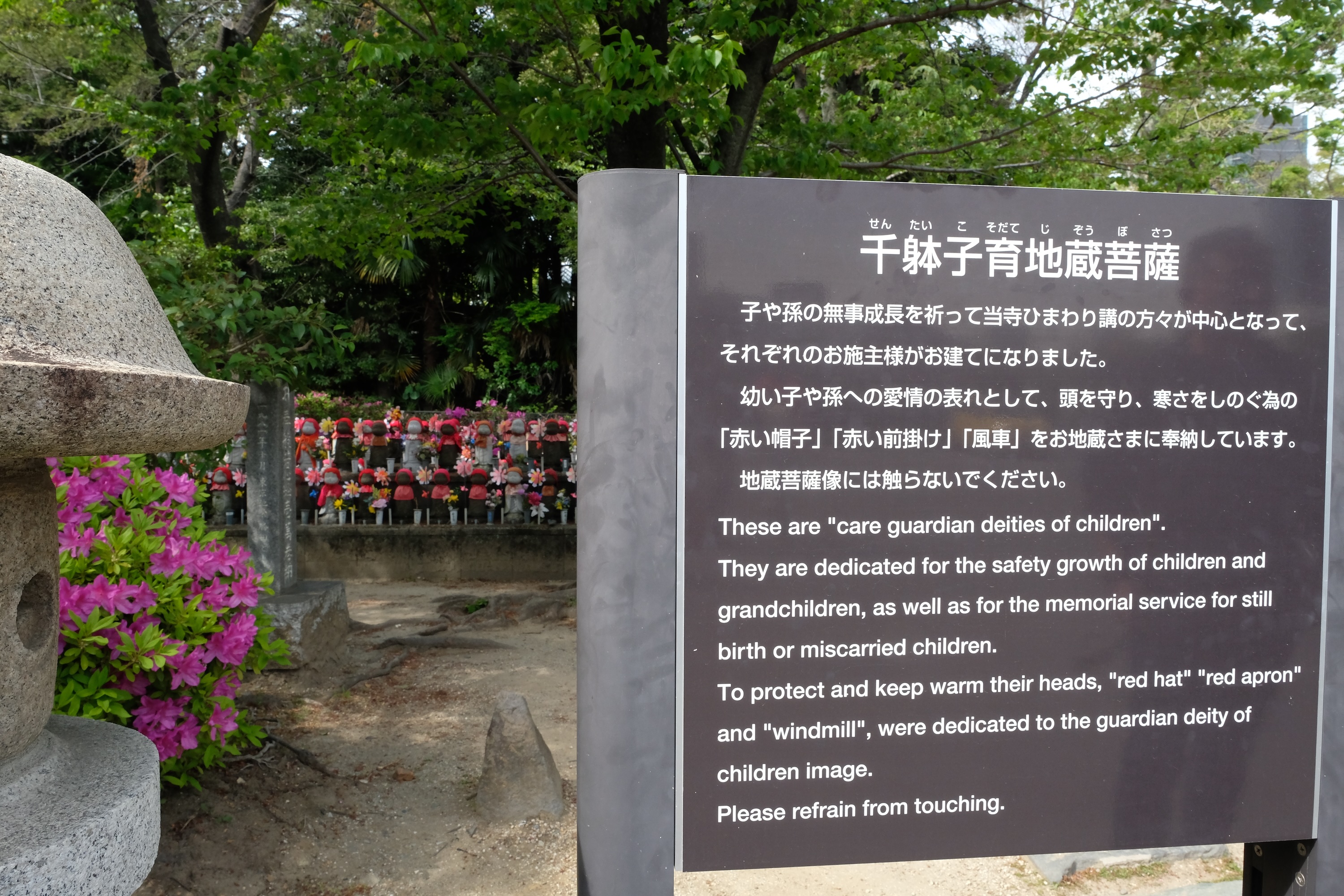 We bezoeken het park zelf en de verschillende tempels en monumenten die daar te vinden zijn, Waaronder een lange rij identieke beeldjes van kinderen die allemaal een rood mutsje ophebben. Om hen te beschermen in hun verdere leven. Een symbool dus om voor alle kinderen en kleinkinderen een goede gezondheid en gelukkig lang leven toe te wensen. Ook voor alle doodgeboren en overleden kindjes, eender waar ter wereld is dit een eerbetoon,