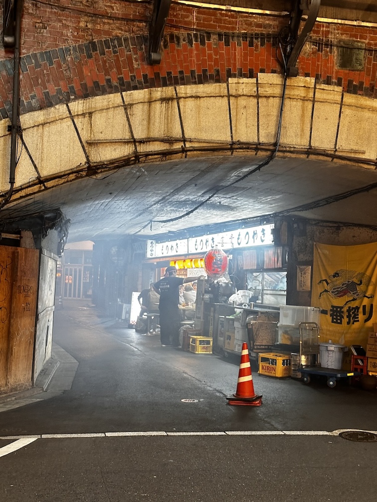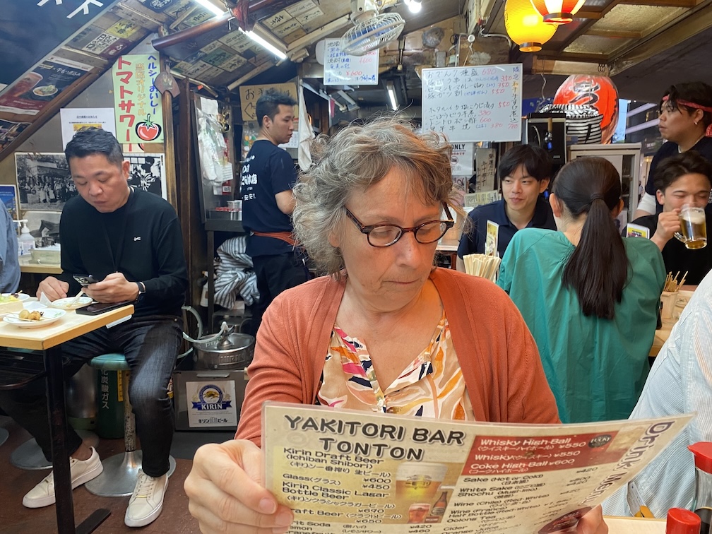 S Avonds wandelen we rustig terug naar ons hotel en onderweg eten we nog iets in een lokaal Yakitori barretje, het is niet groot en helemaal volzet, maar we kunnen er nog bij aan één vd lange tafels . Superlekker en tussen de lokale mensen, zo hebben we het graag.