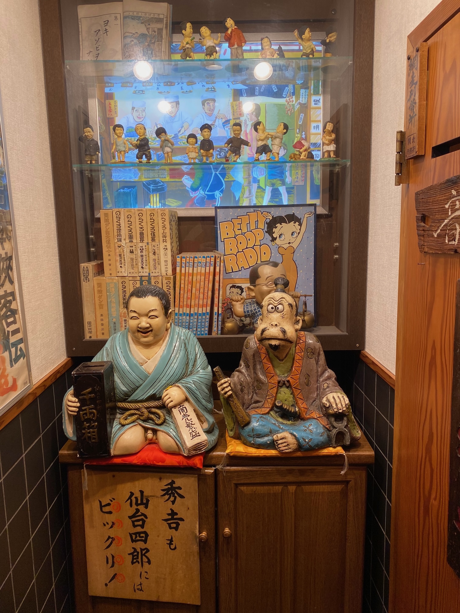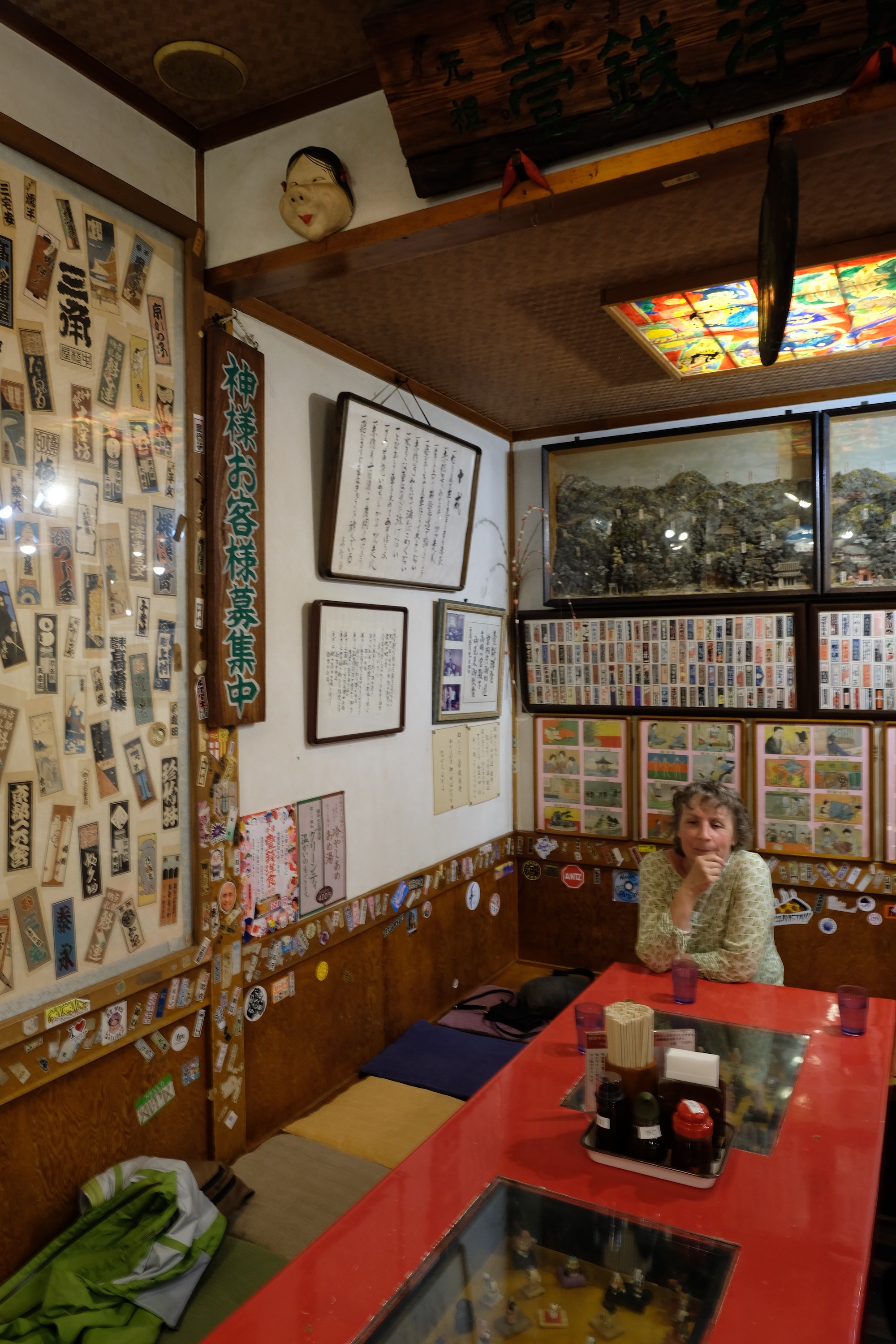 Rond de middag neemt de gids ons mee naar een locaal eethuisje, weg van de grote massa (voornamelijk Japanse) toeristen voor de lunch. Het is wel een speciaal etablissement, want aan bijna elke tafel ( behalve die van ons 😉 ) zit een namaak-geisha die je gezelschap houdt tijdens de maaltijd