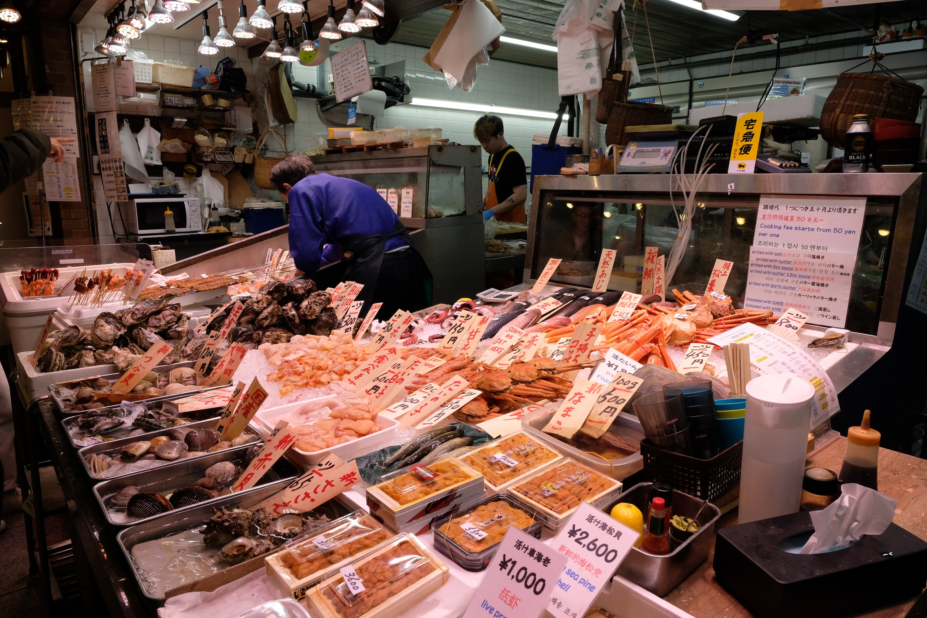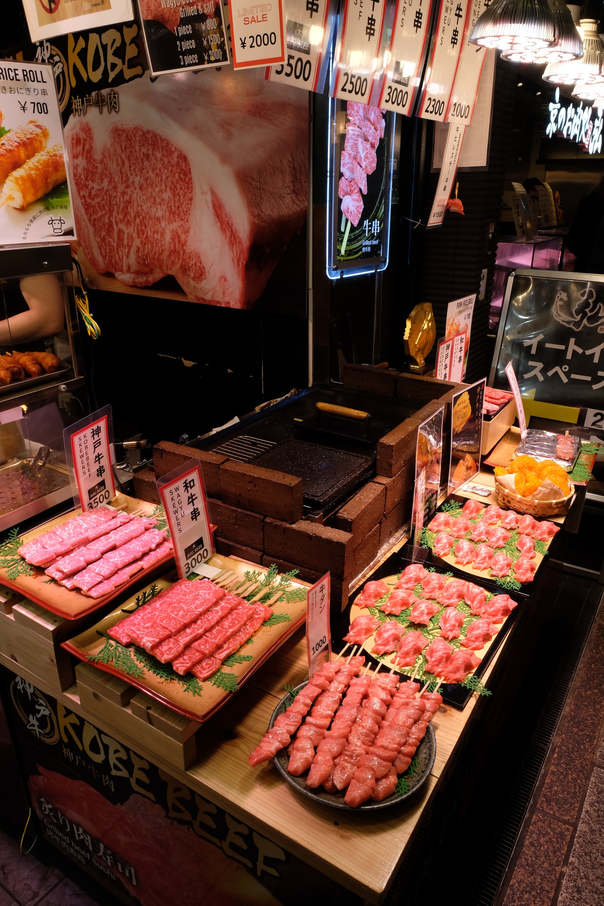 Aan het einde van de middag passeren we nog langs de Nishiki Food Market, dé plek voor foodies … maar door de vele toeristen ook een beetje uit zijn voegen gebarsten …. We wringen ons er eens door en zien de – voor ons – meest vreemde snacks en knabbels, best eens leuk om te zien -, maar helaas dus veel te druk ( het is dan ook Golden Week in Japan, week waarin zowat iedereen in dit land vakantie heeft omwille van verschillende feestdagen in deze week )