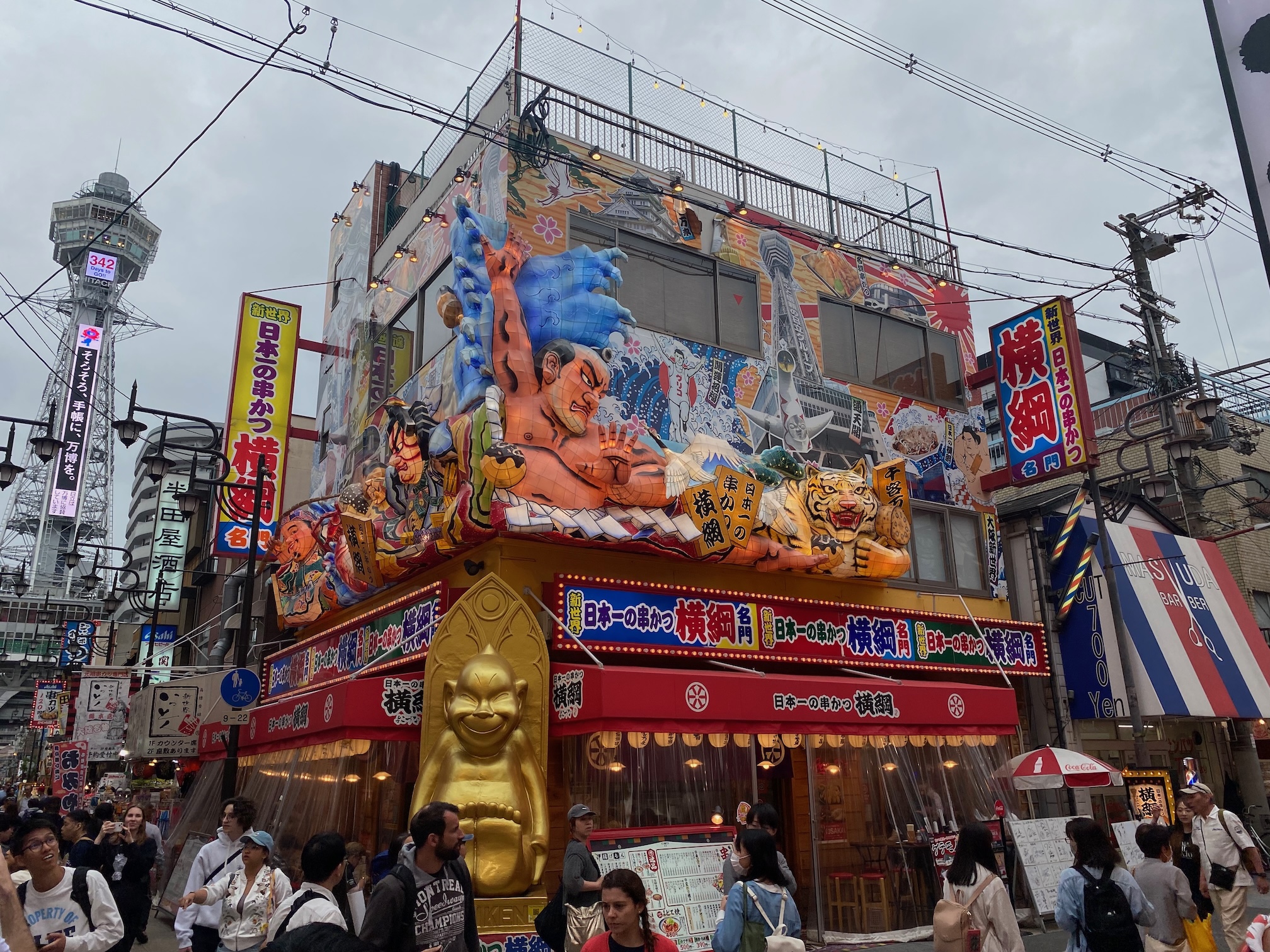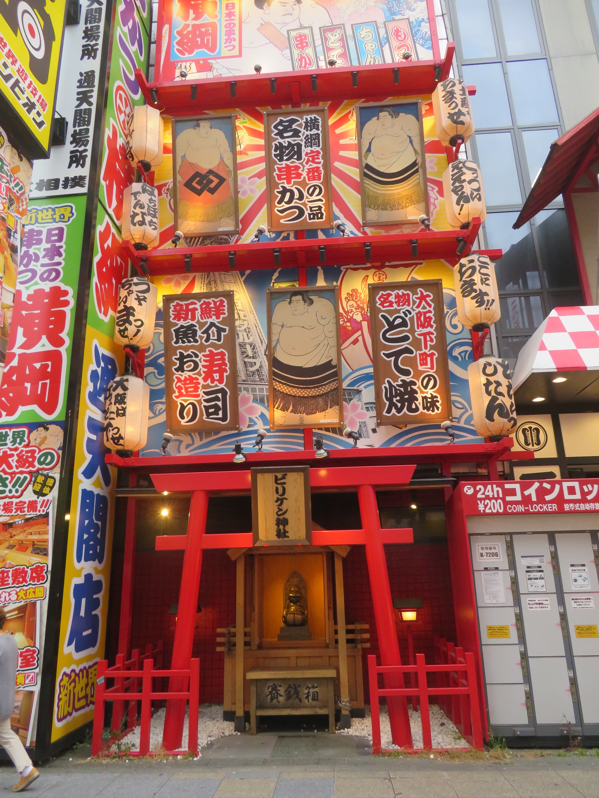 Daarnaa gaan we verder naar de wijk Shinsekai, waar we een beetje terug in de tijd gekatapulteerd worden. Deze wijk is heel schreeuwerig en druk en je waant je terug in de seventies, het stikt er ook van de 2de handswinkeltjes, duistere gokpaleizen en hééééél veel lokale eettentjes, waarvan sommigen er toch wel vrij bedenkelijk uitzien 😉