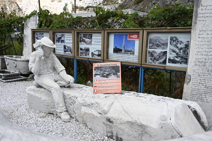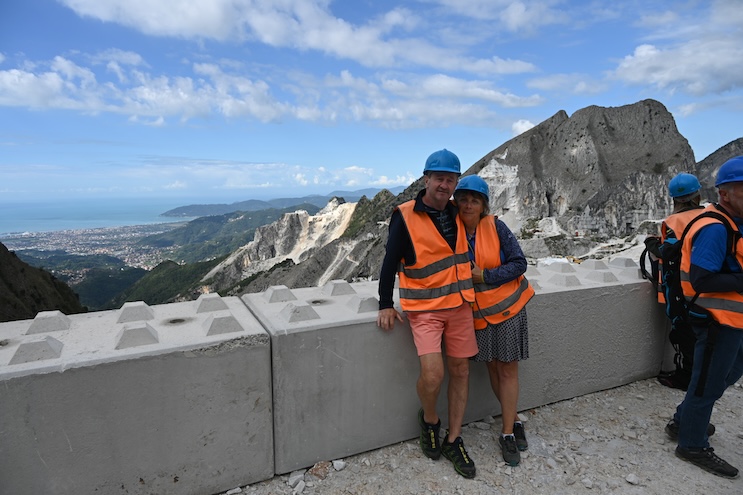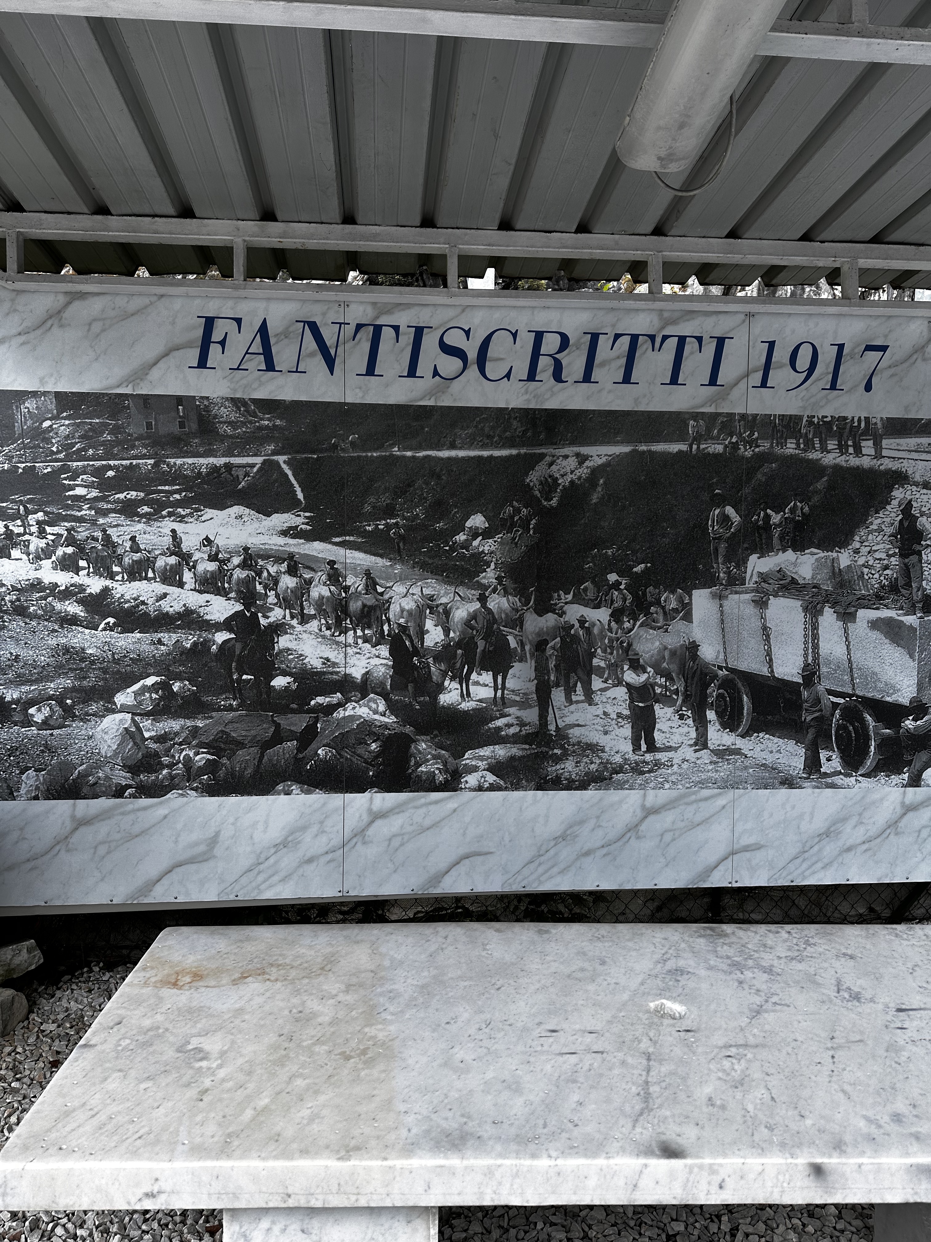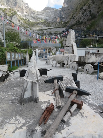 Onze gids vertelt ons heel wat over het leven vroeger en nu van de marmer-werkers, de geschiedenis, het vervoer enz … ongelofelijk eigenlijk hoe ze in vroegere tijden die gigantische blokken marmer al uit de berg konden halen én transporteren naar beneden om te verschepen … erg gevaarlijk en zwaar werk, toch zonder de huidige machinale hulpmiddelen…