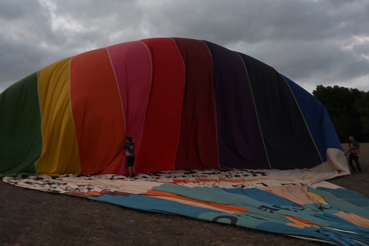 Keurig op tijd verschijnen de ballonvaarders en nadat ze via losse ballonnetjes gecheckt hebben of alles qua windrichting en windsnelheden wel goed zit voor onze vlucht, krijgen we instructies van wat er ons te wachten staat 😉